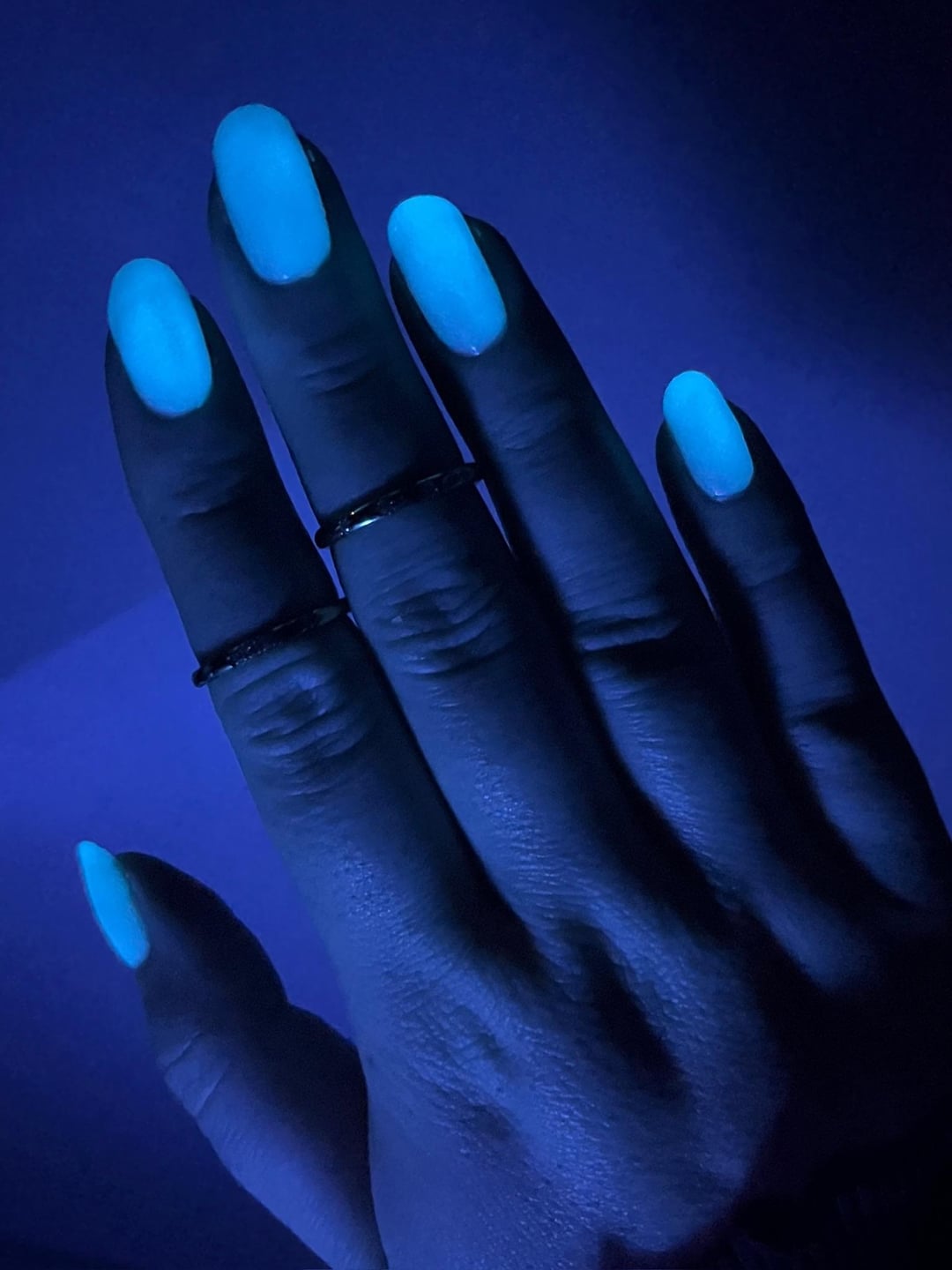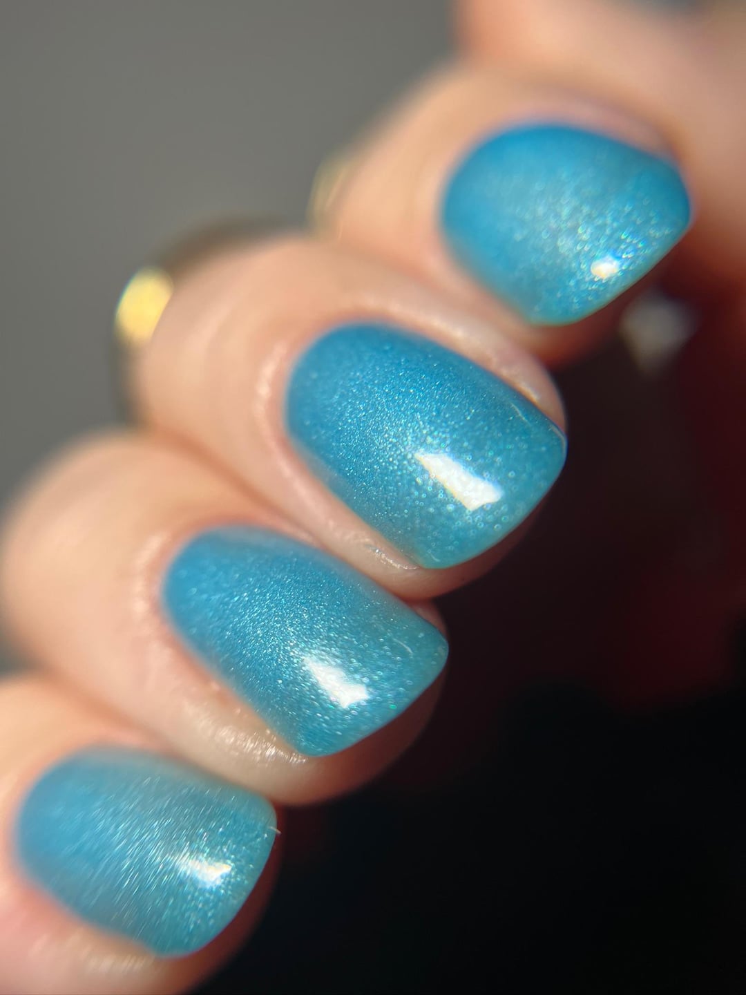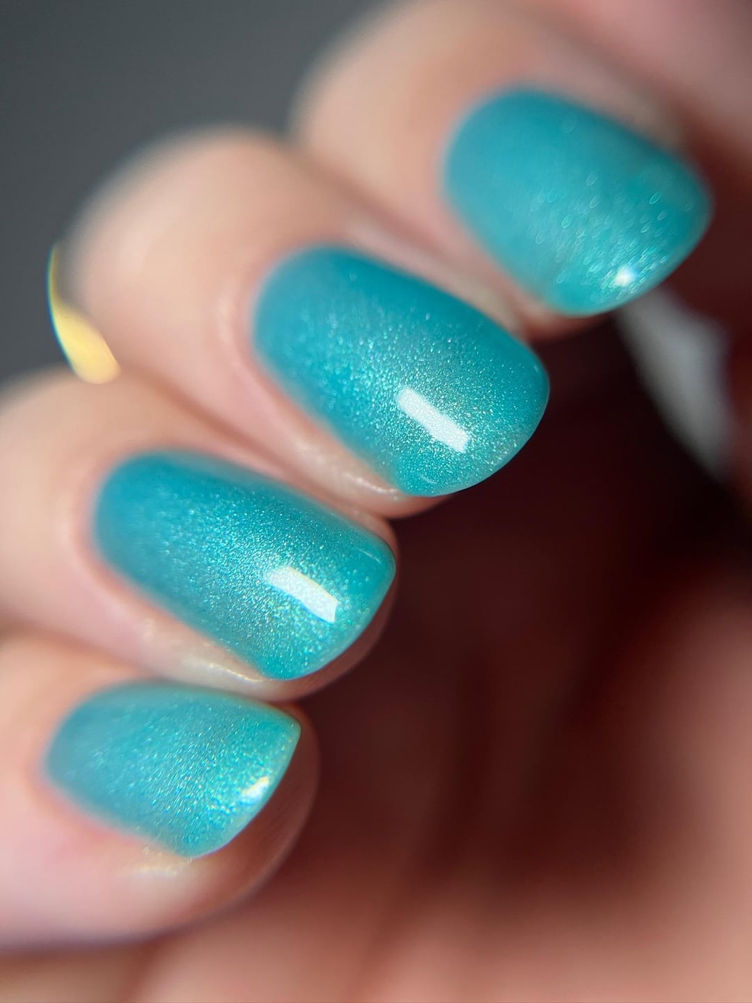 🩵 Aqua Cat Eye is a glow in the dark polish with a bright turquoise glow inspired by turquoise cat eyes, like the Cheshire cat from the most recent Wonderland movie. In the light, it has an aqua blue shimmer. Builds to full coverage in 3 coats. The glow is best charged up by sunlight or UV light, but will still charge in normal indoor lighting.
