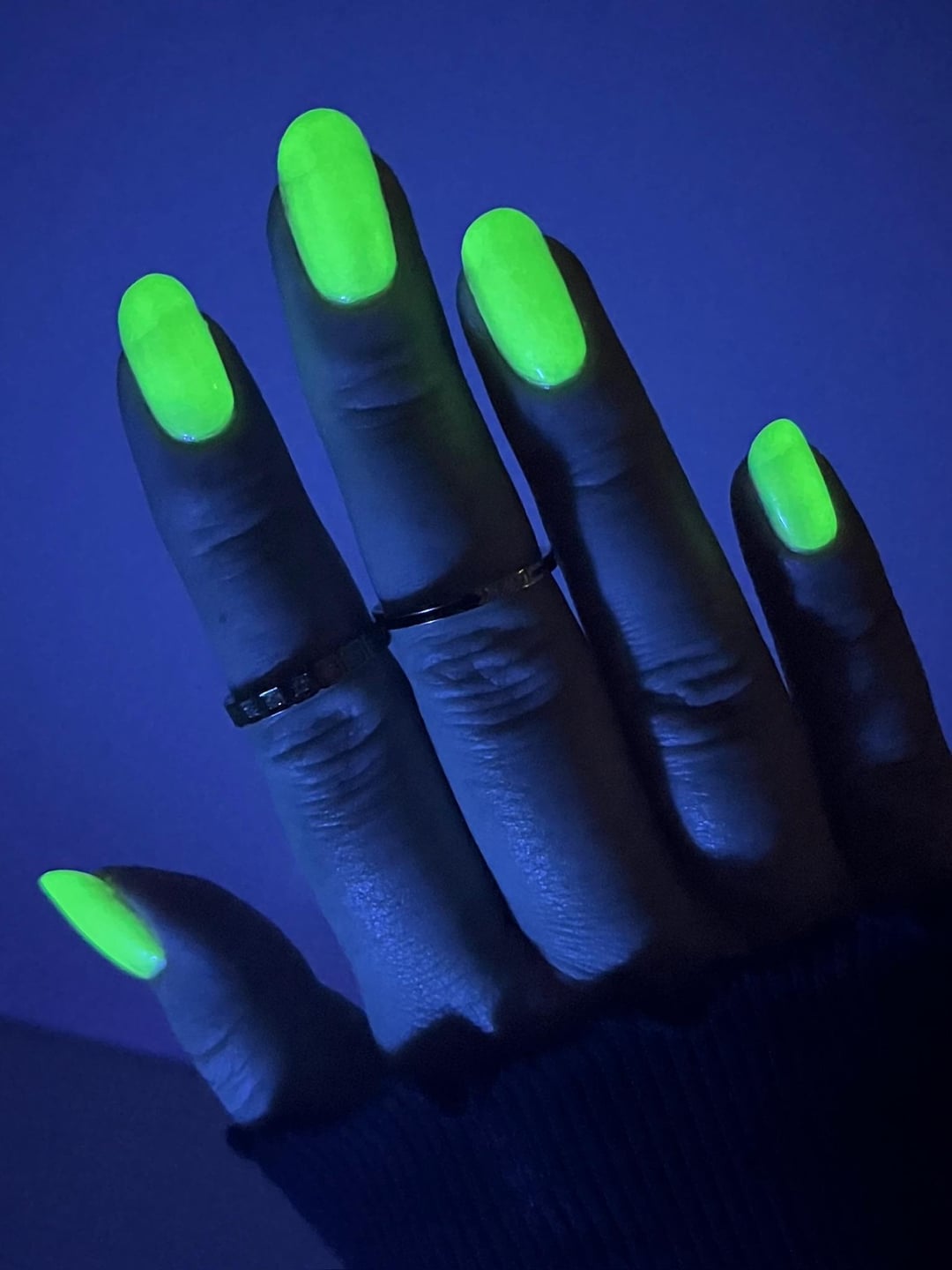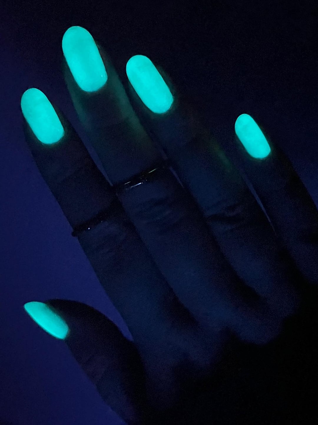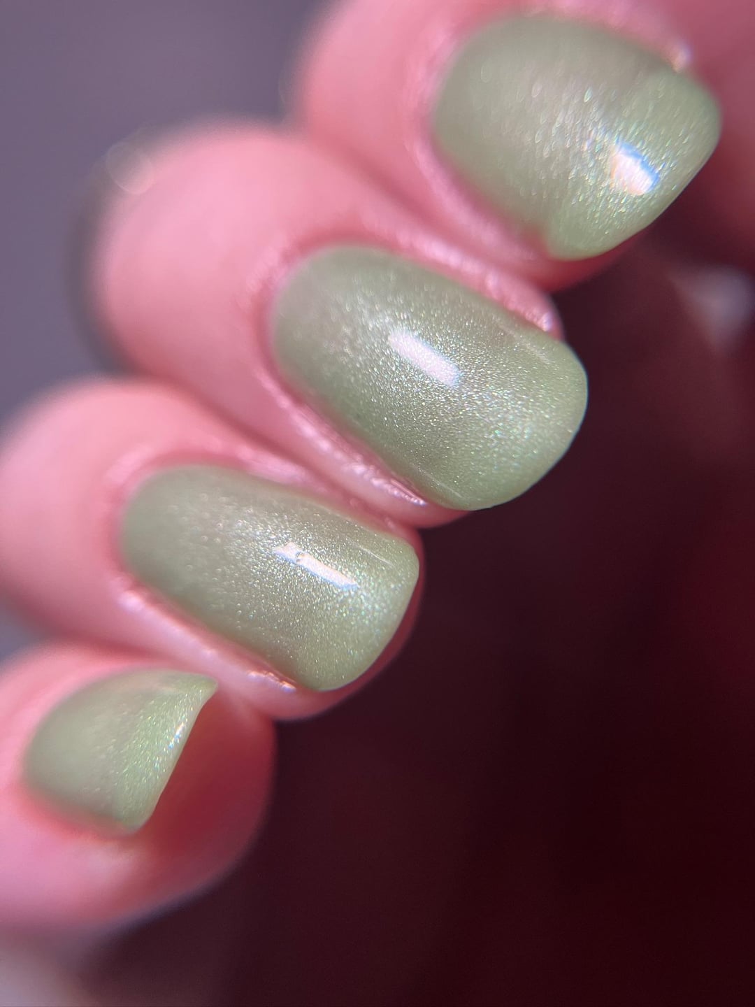 💚 Green Cat Eye is a glow in the dark polish with a green glow inspired by green cat eyes, like Church from Pet Semetary or Jiji from Kiki's Delivery Service. In the light, it has a light green shimmer. Builds to full coverage in 3-4 coats. The glow is best charged up by sunlight or UV light, but will still charge in normal indoor lighting.