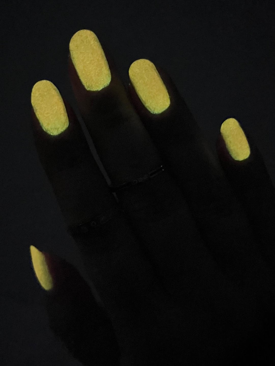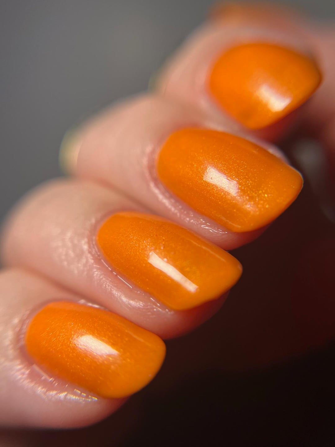 🧡 Orange Cat Eye is a glow in the dark polish with a yelllow-orange glow inspired by orange cat eyes, like the derpy tiger from KPDH or Jonesy from Alien (his eyes are green/orange). In the light, it has a bright orange shimmer. Builds to full coverage in 2-3 coats. The glow is best charged up by sunlight or UV light. Note that orange glow in the dark pigments inherently never glow as bright or long as green or blue glow in the dark pigments.