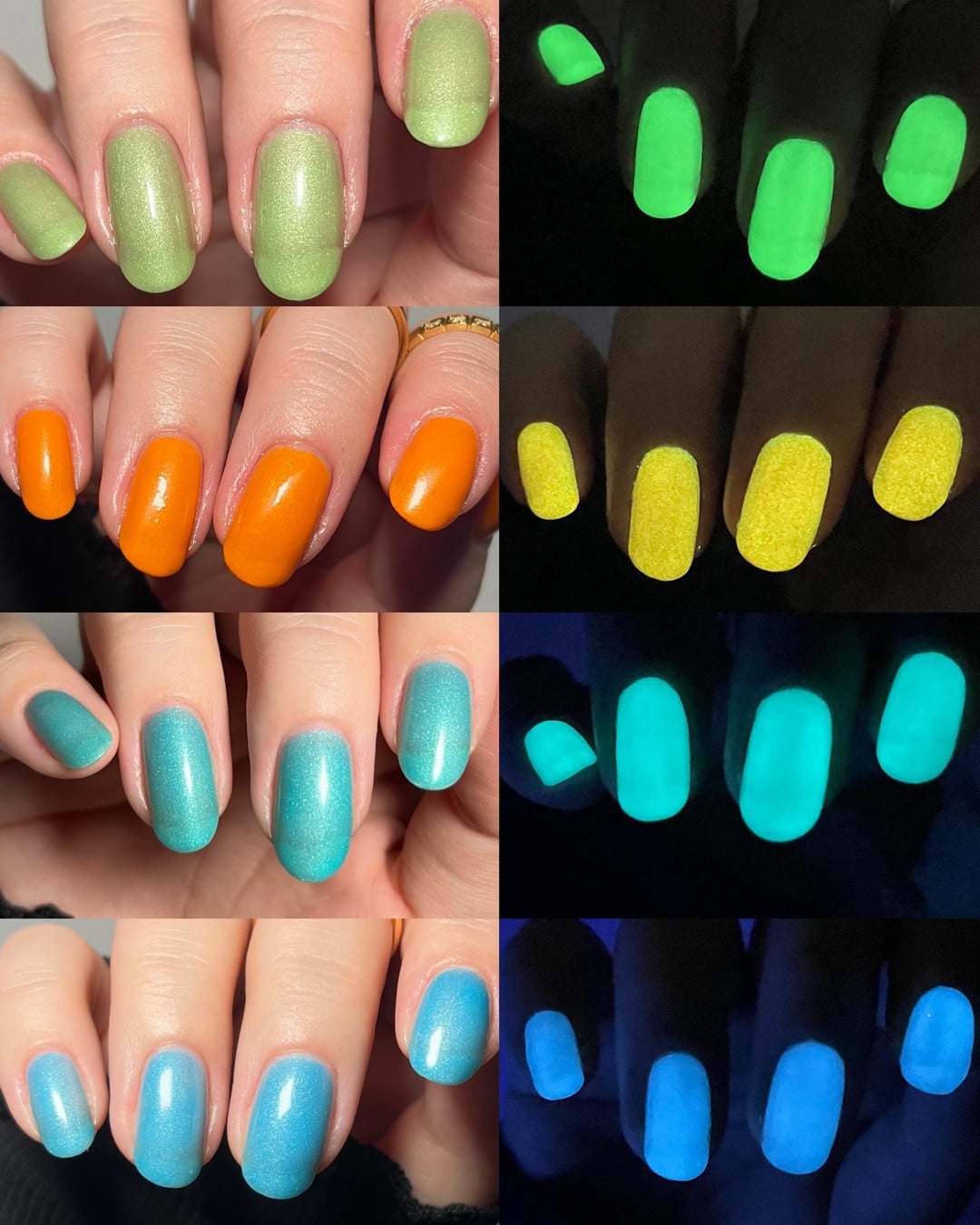 Opal Theory Polish just opened on 10/2 and I'm sharing some swatches from their glow in the dark 2025 Halloween Cat Eye Quad! These are the first glow in the dark polishes I've added to my collection and they are really great: bright, pretty in the light and the dark, and I'm really excited to see glow in the dark polishes that aren't the typical green glow. They're available now for $13/bottle or $50 for the quad at opaltheorypolish.com 🌟