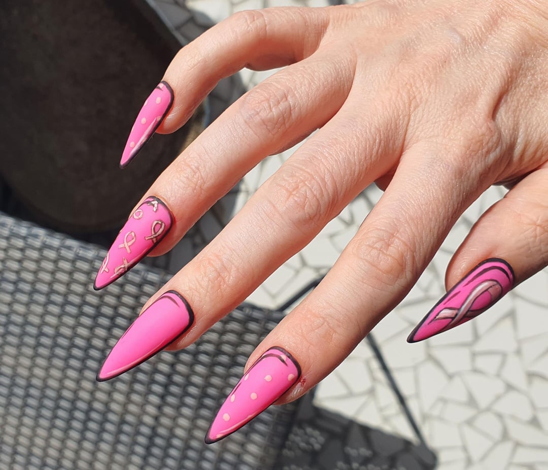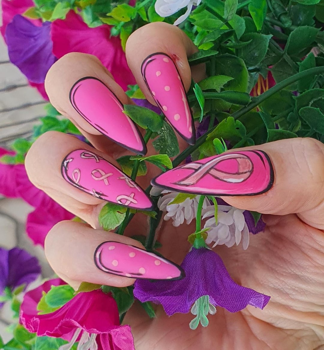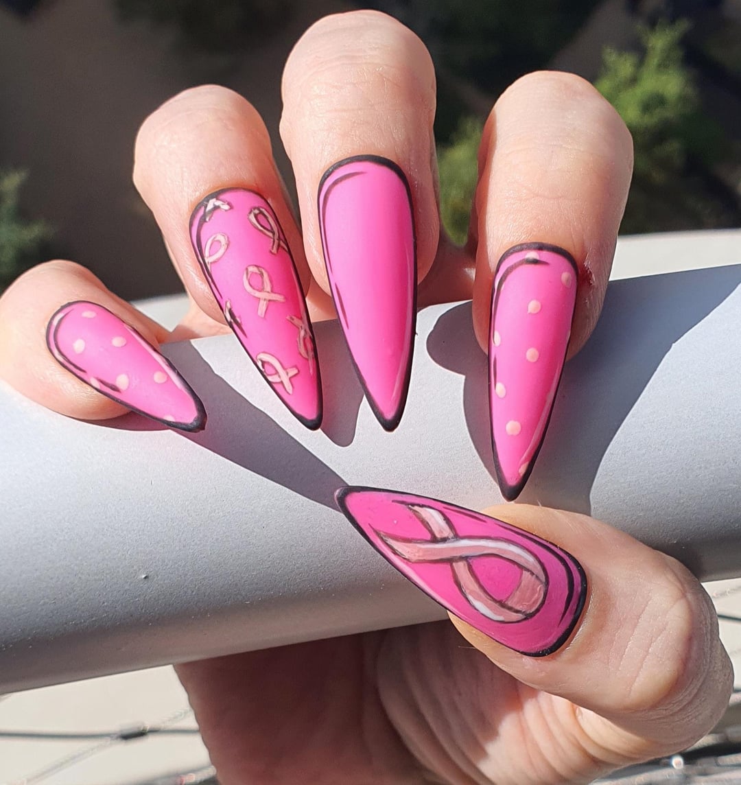 Because October, it is Breast Cancer awareness and we are all potentially concerned for ourselves, for our loved ones and people around us. I made this set handpainted. I just used gelpolishes and matte top coat by Key_Opportunity_7082