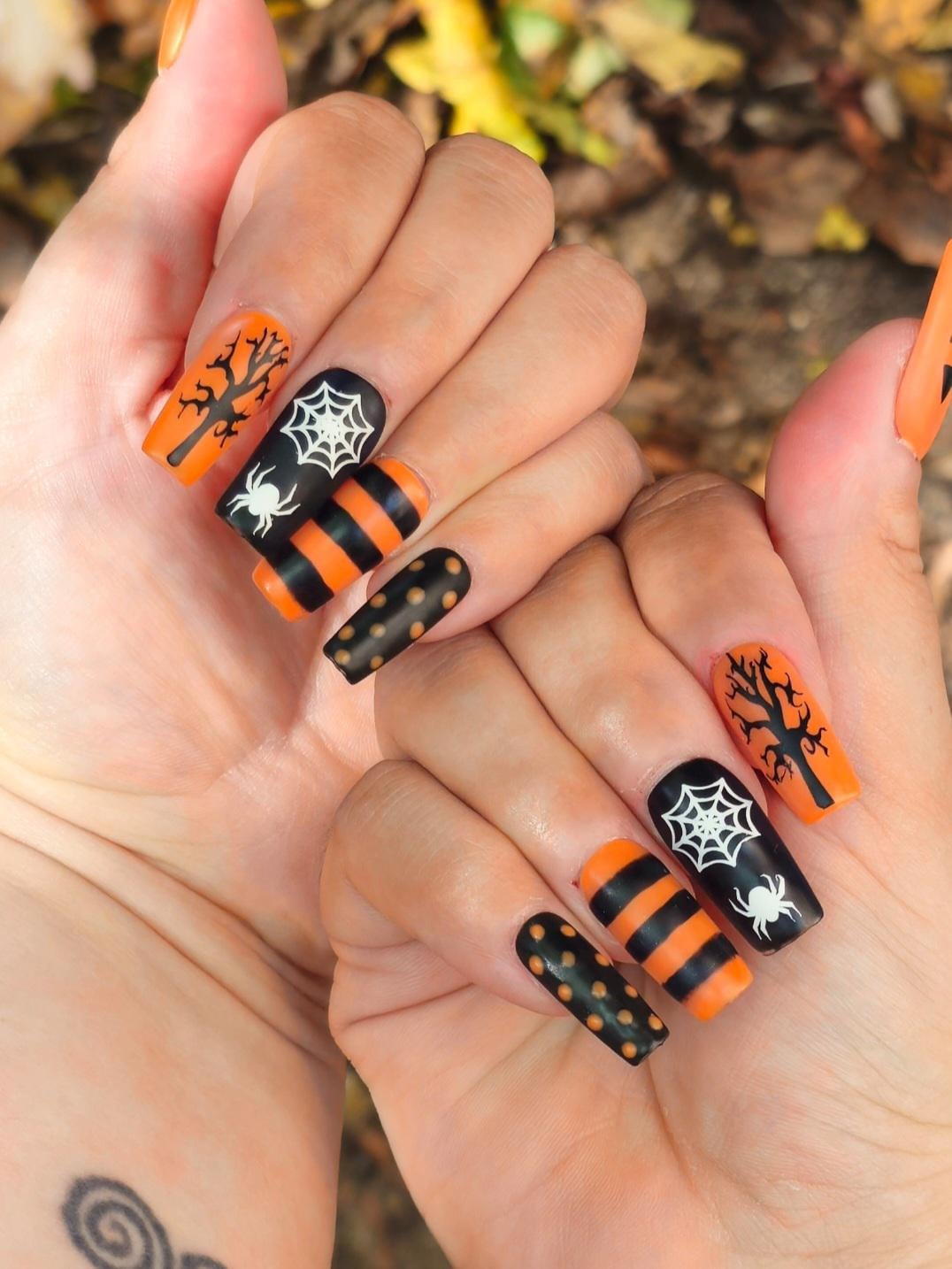 Just a simple halloween press-on set. The black and orange stripes are my favorite. Would you wear these and feedback would be appreciated by darkselcouthsoul