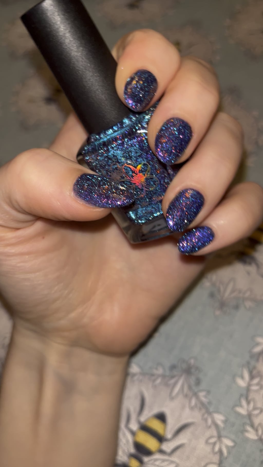 Absolutely love how there are unique elements that shine in different lighting. In low light, you just see a blurple glitter with orange flakies. But under flash you get a hit of aqua blue reflective glitter and the magnetic blue pigment looks amazing against the deep jewel toned purple base and contrasts with the orange-red flakes.