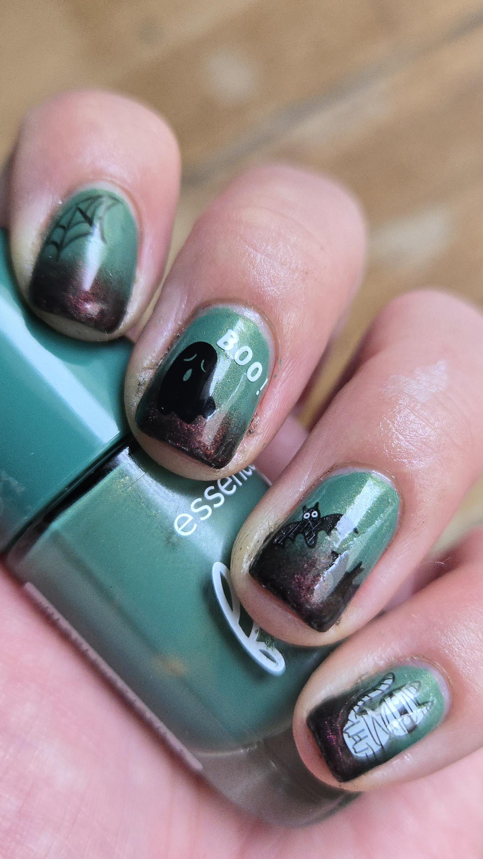 I had a vague idea to do Frankenstein's monster heads with this gradient as the base, but I think I made a mistake trying to do a gradient for the first time using such contrasting colours. Good thing I impulse bought a million Halloween nail stickers towards the end of summer, right?