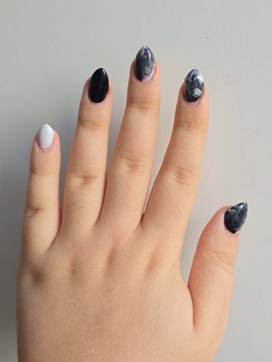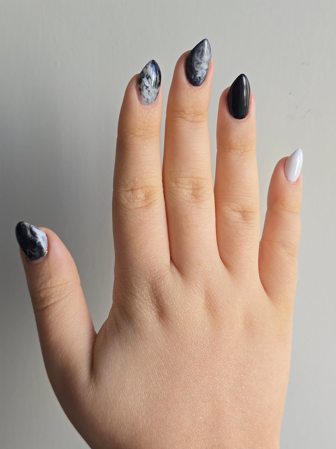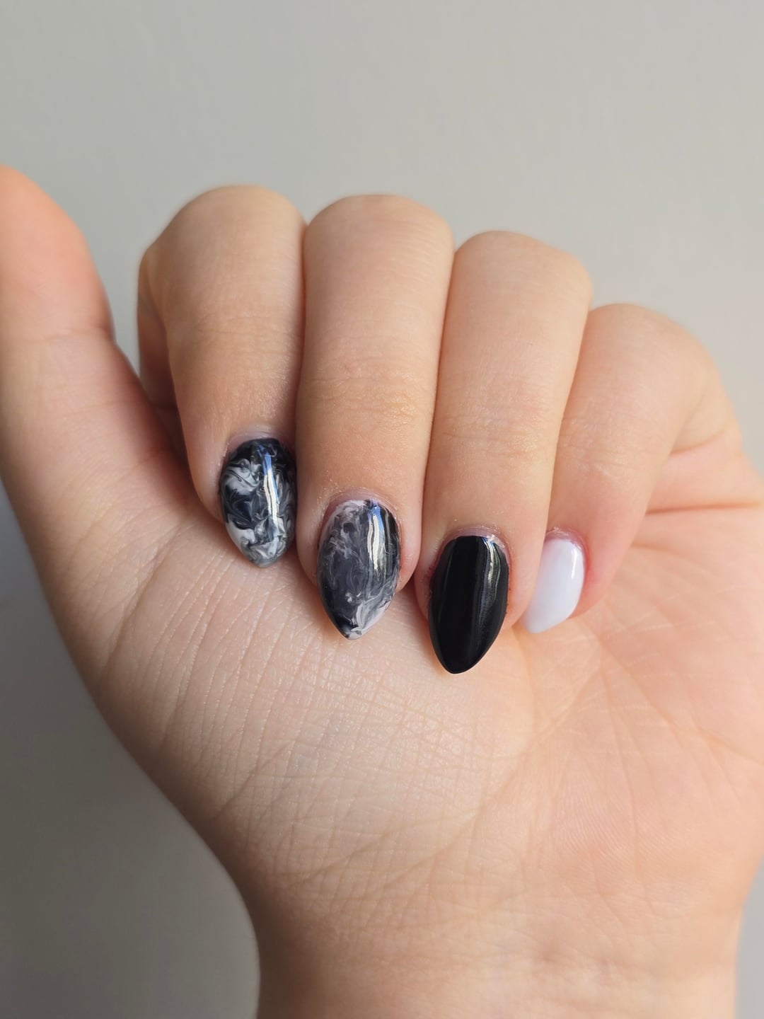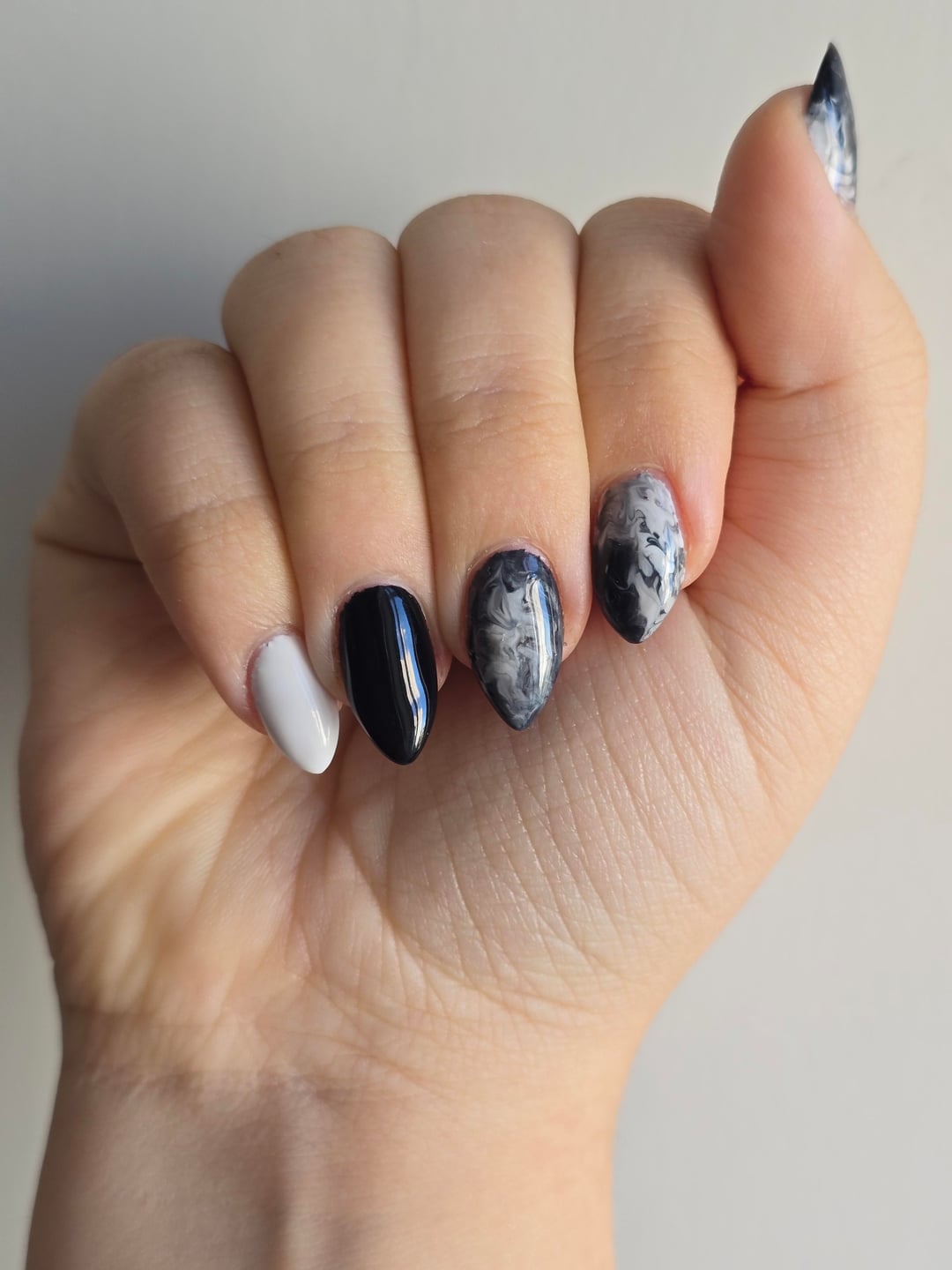 I did them myself with a plastic bag to mix and black – white nail polishes. How do they look? by mooncoversthesun