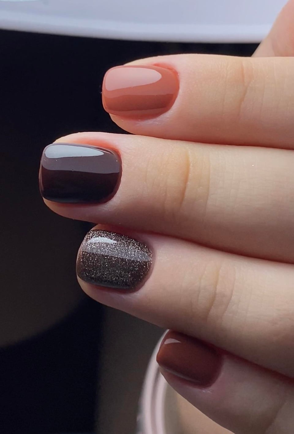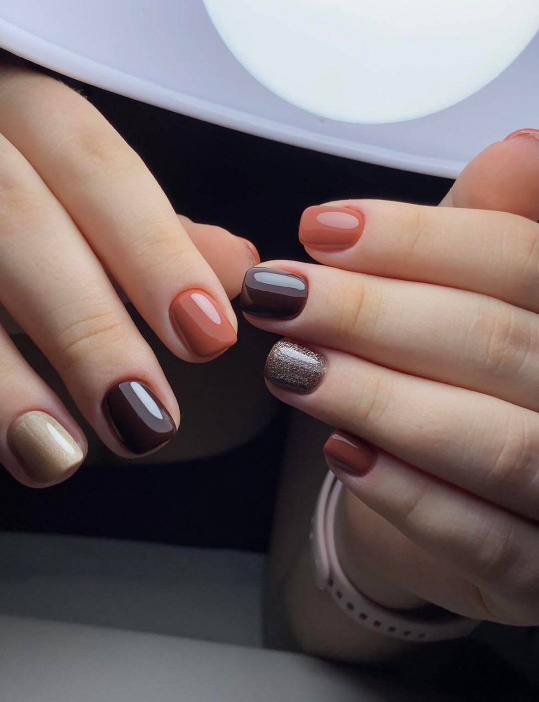 2. Those colors are so classy-the mix of warm browns, nude, and that subtle shimmer looks perfect for fall. Short nails can be just as elegant, honestly even cleaner sometimes!