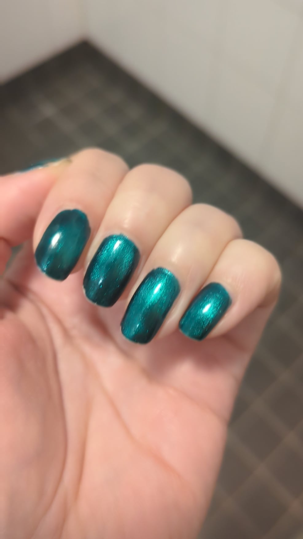 I absolutely love this polish, it leans more green or more blue depending on the light but is a good teal colour. This was my first time using magnetised polish, and was quite happy with how it turned out (need a bit more practice though!).