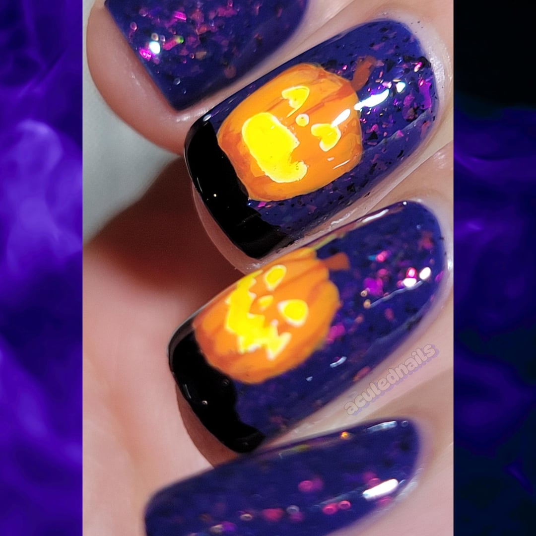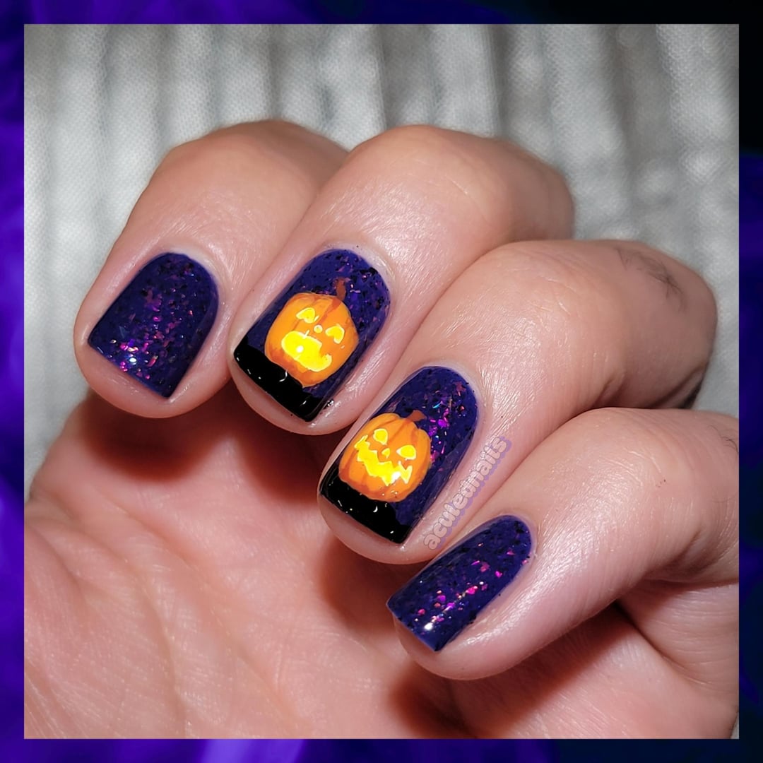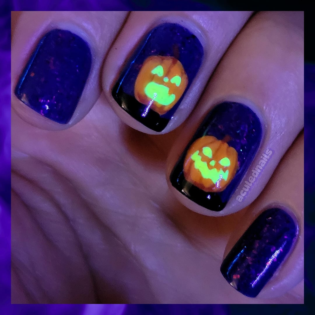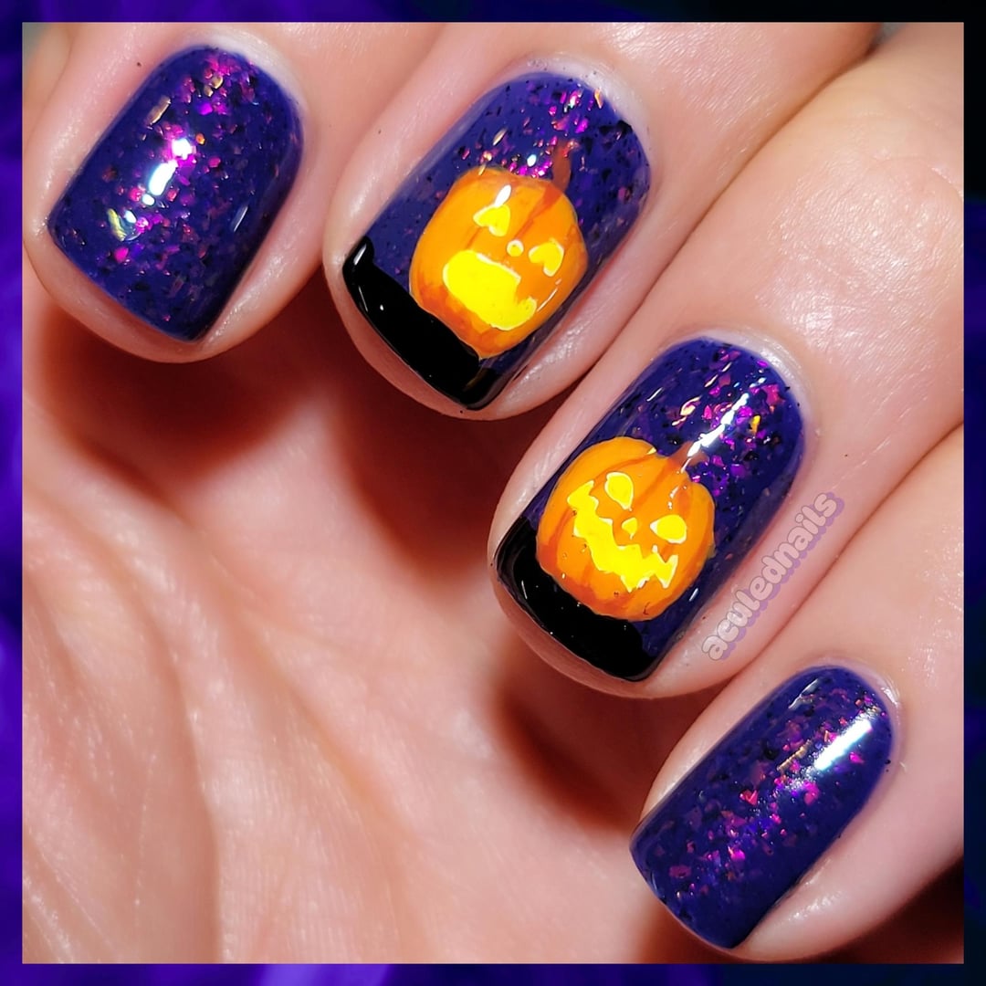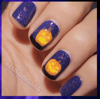 1. I had just gotten some polishes from Glams Halloween collection and I was obsessed with this deep indigo flakie, which would be a perfect background for some jackolanterns. I had just been sent a bunch of GITD polishes from Paint**It by Dipp**it as a birthday present, so after I put the faces on, I went back and had to make them glow! Toss some pumpkin stamps, freehand some contrast into them, and you’ve got a cute Halloween mani!