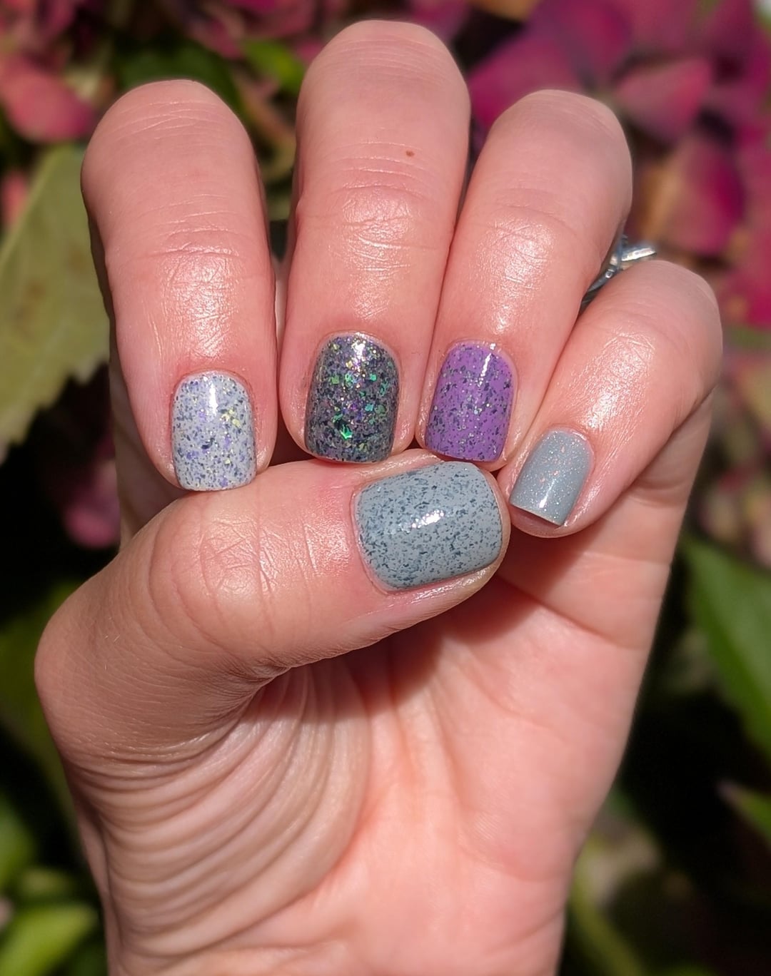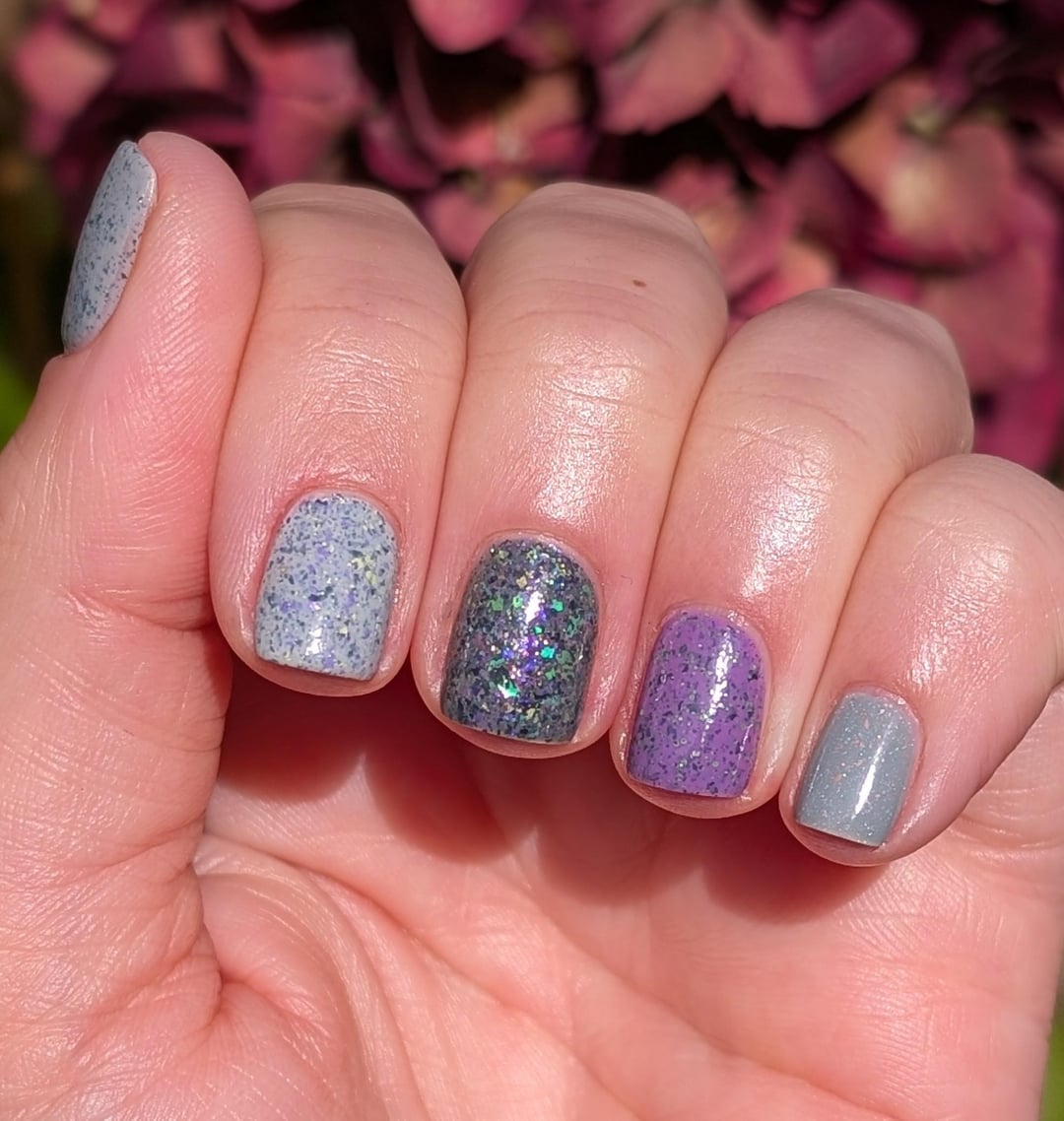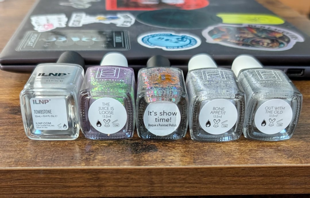 Pinky to thumb: ILNP Tombstone, Painted Polish The Juice is Loose, Rogue It's Showtime!, Painted Polish Bone Appetit, Painted Polish Out with the Old by Content-Flight6371