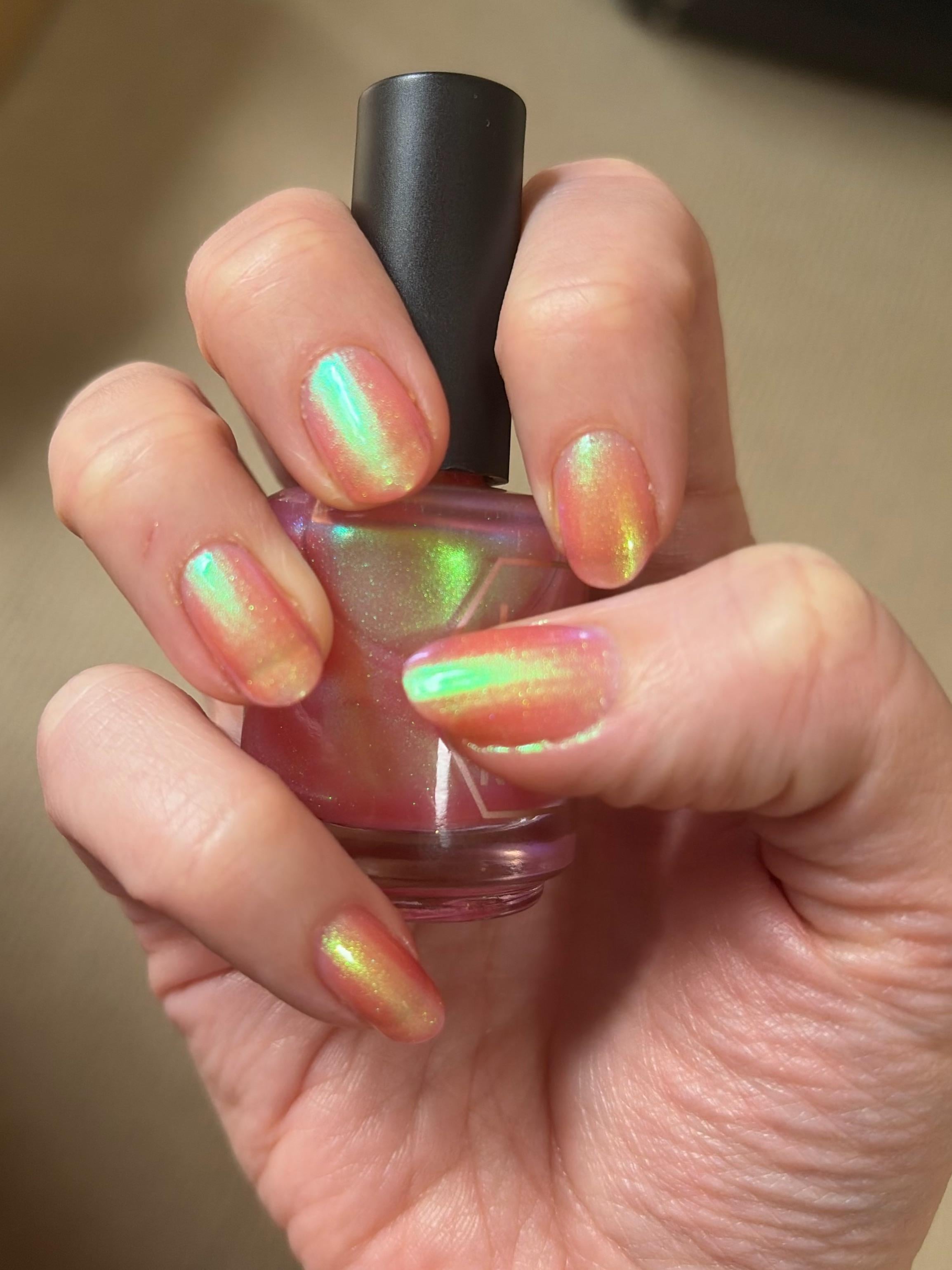 lawoftortes on October 8, 2025 4:47 am This is three coats of BKL So Hot and Respectful with Cosmic Polish Extra String Base and EdM Immortal Top Coat.