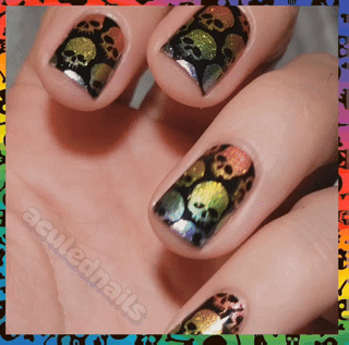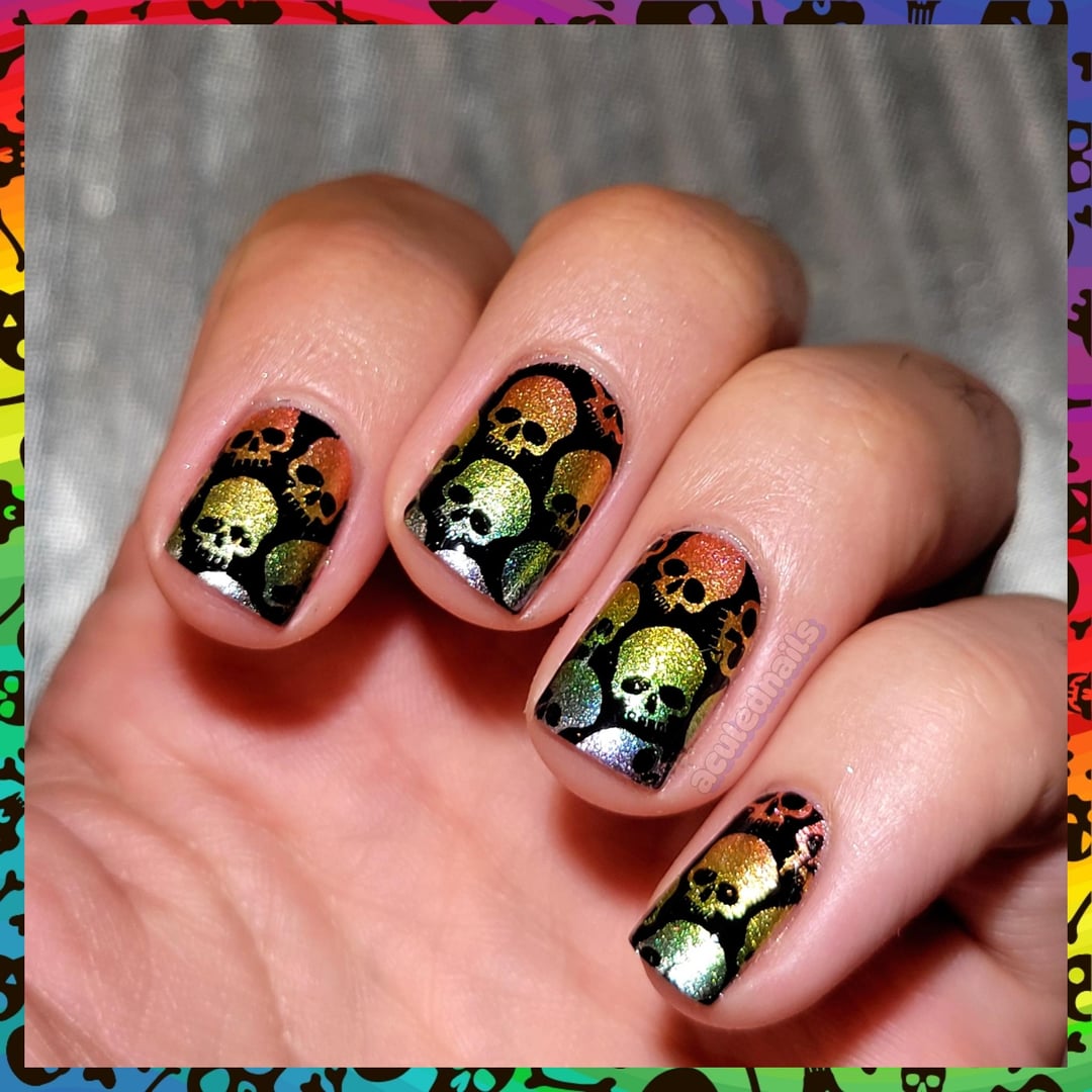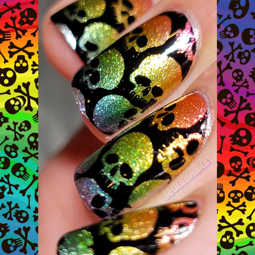 I've never broken a bone so I cannot confirm, but I would hope that whenever doctors need to get in there they confirm my bones ARE shiny rainbow. Who says that rainbows and bright shiny colors AREN'T for Halloween ๐Ÿ˜ anything can be spoopy! I love these cupcakes metallics, and sponging with them dulls the color a bit as they are a silver metallic pigment in a colored jelly base, so a little of the color is absorbed by the sponge and you get this almost oilslick like sheen to them, super pretty! Stamped some skulls over it so they peak through with my glorious rainbow bones…or rainbones, if you will ๐Ÿ˜