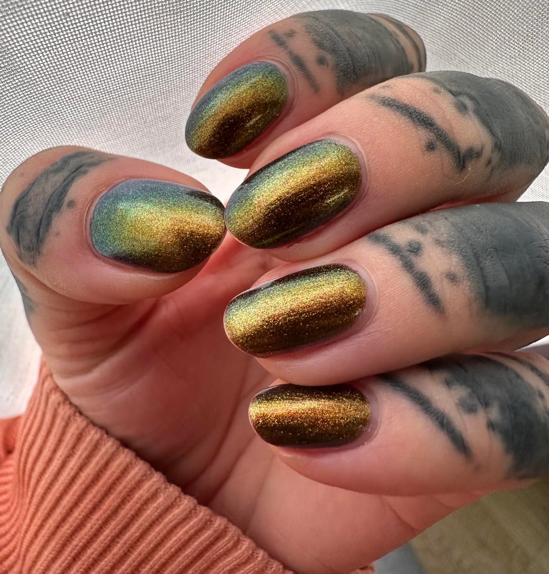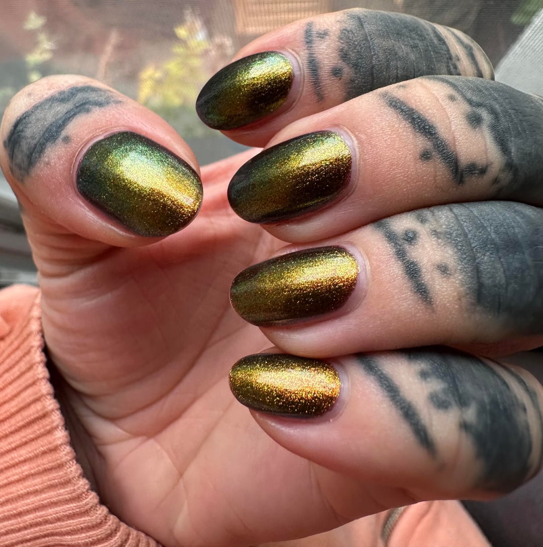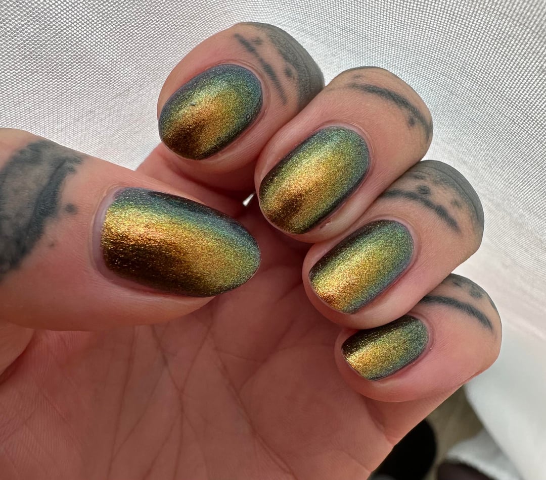 October 8, 2025My first ever, clumsy as hell, attempt at negative space nail art. Fun topcoat added to try and distract a bit from how messy it is, but I’m still happy enough with it to feel like sharing!