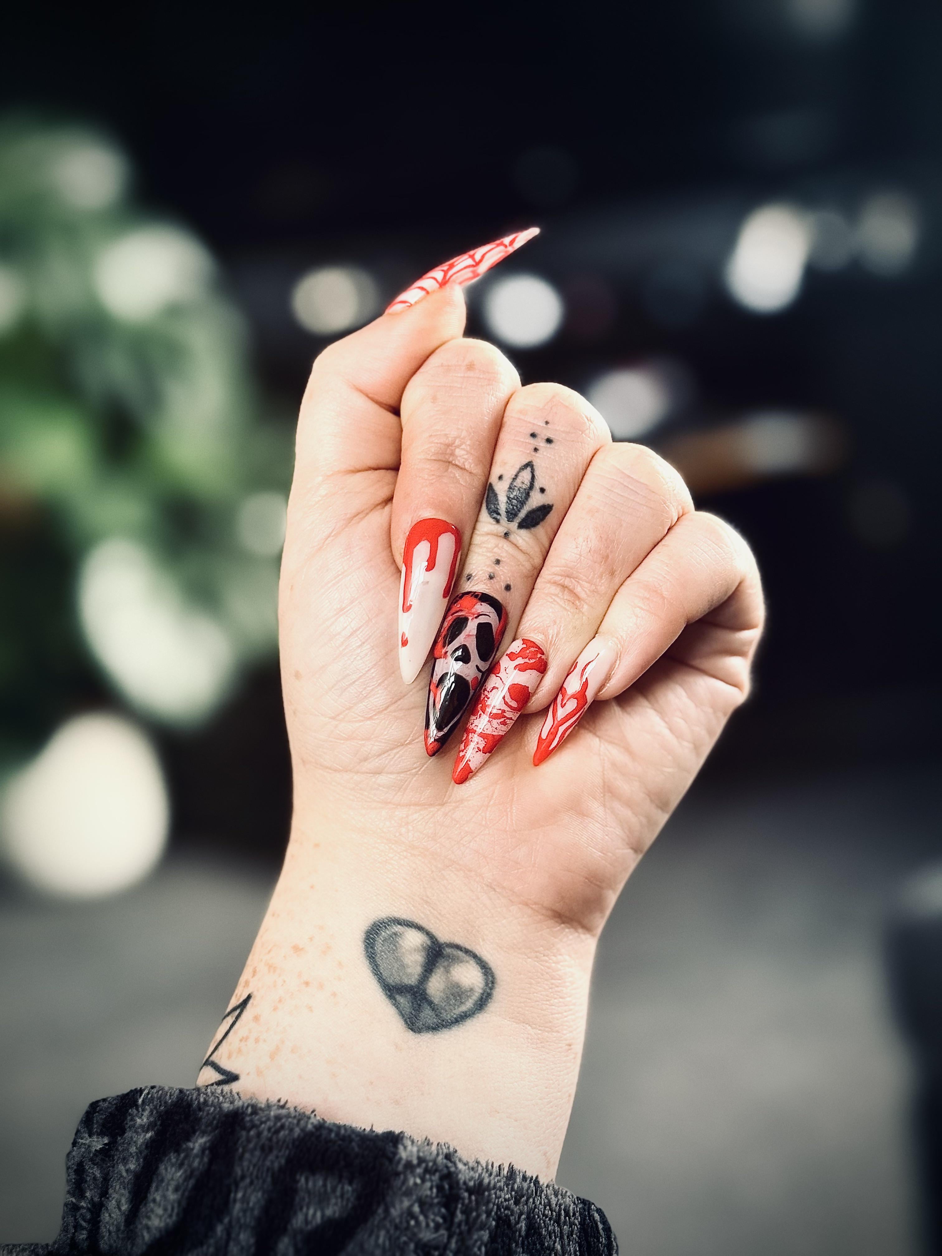 October 8, 2025My first ever, clumsy as hell, attempt at negative space nail art. Fun topcoat added to try and distract a bit from how messy it is, but I’m still happy enough with it to feel like sharing!