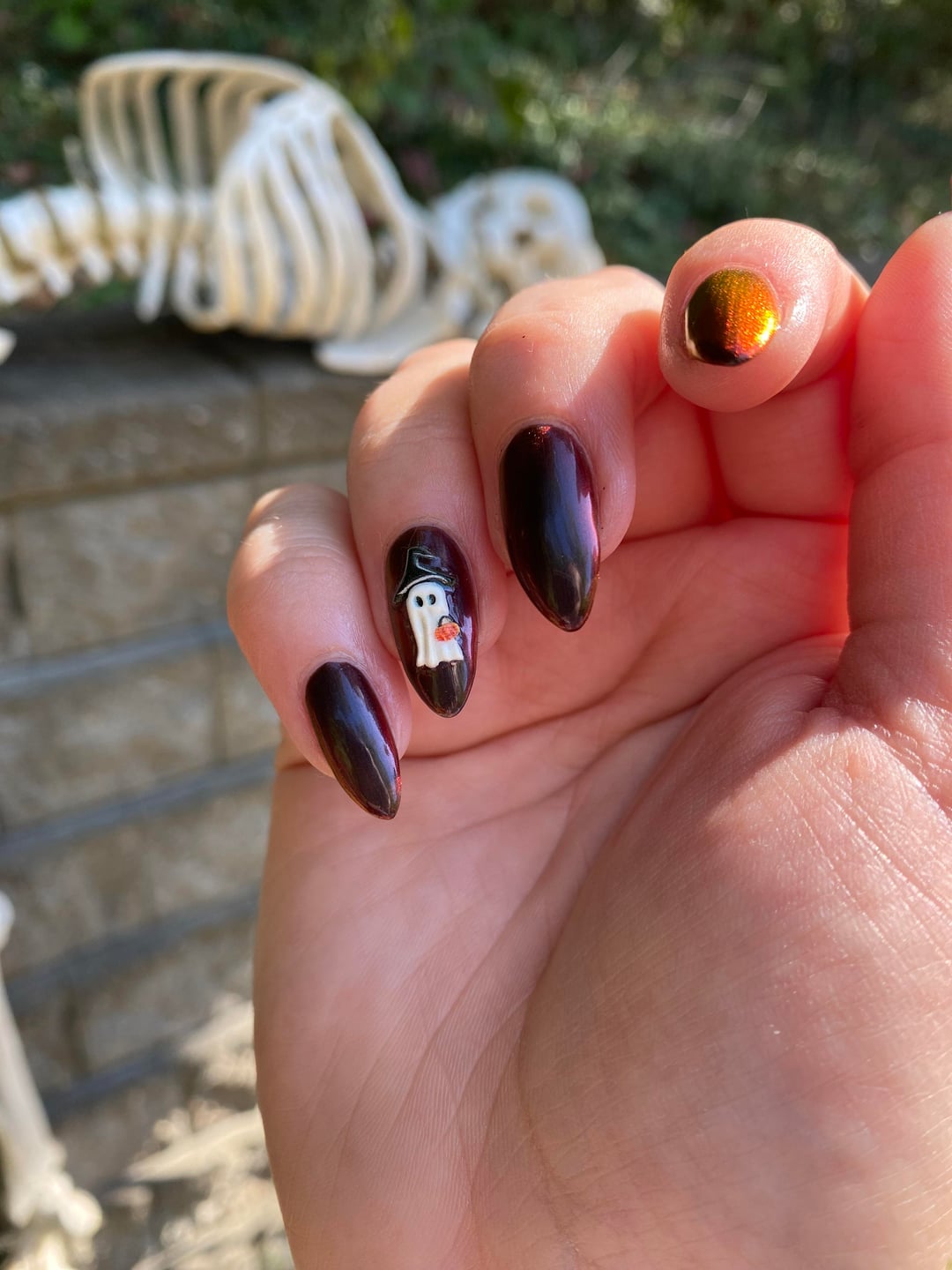 I noticed it today while thinking about future spooky manis and I am PUMPED ILNP eclipse; KBShimmer fillin’ groovy, smooth moves, and clearly on top; stickers from Amazon by bigfatcoffeeslut