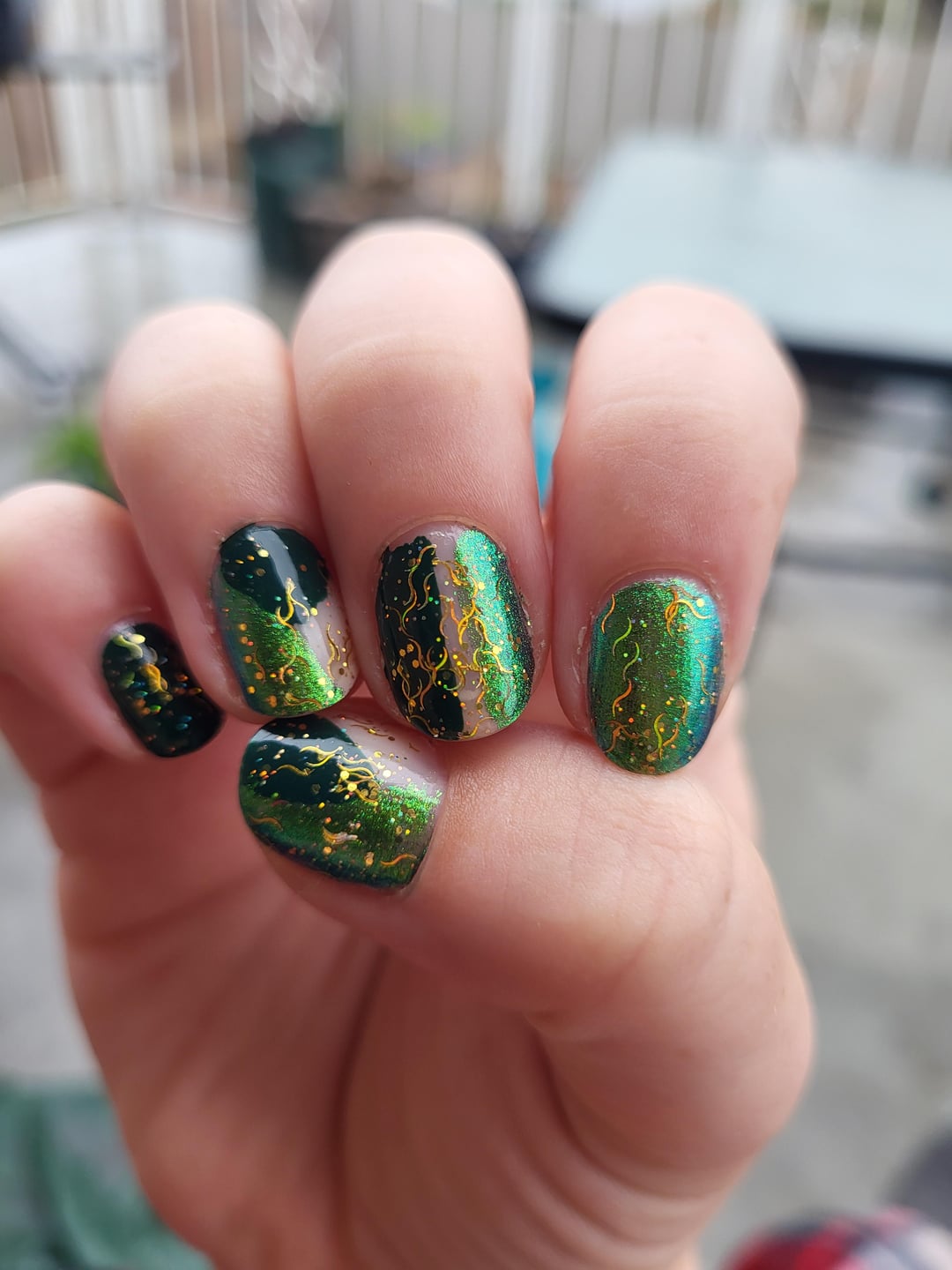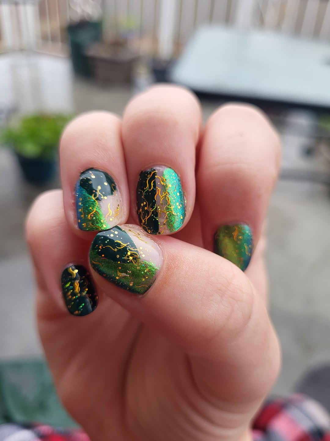 My first ever, clumsy as hell, attempt at negative space nail art. Fun topcoat added to try and distract a bit from how messy it is, but I’m still happy enough with it to feel like sharing!