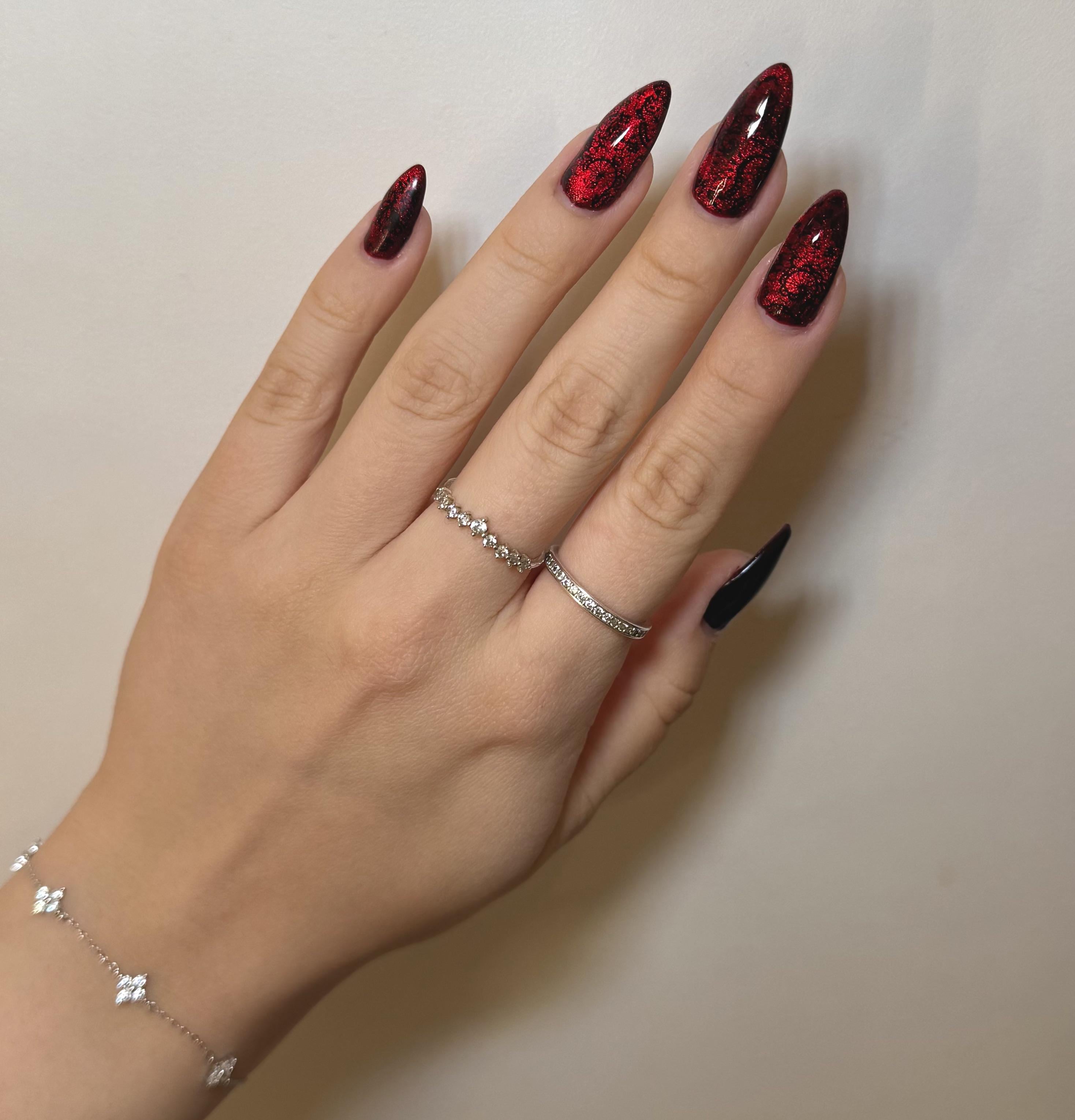 Decided to try foil with the lace design for the first time and it worked pretty well even tho I didn’t have any foil gel! Just cured the silver cat eye 10 seconds less and then added the foil and then the jelly red on top! by ThisisNora