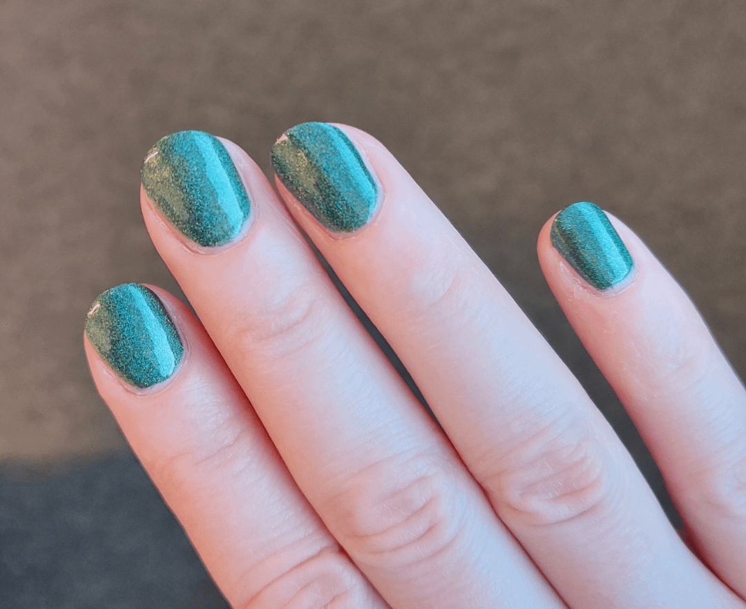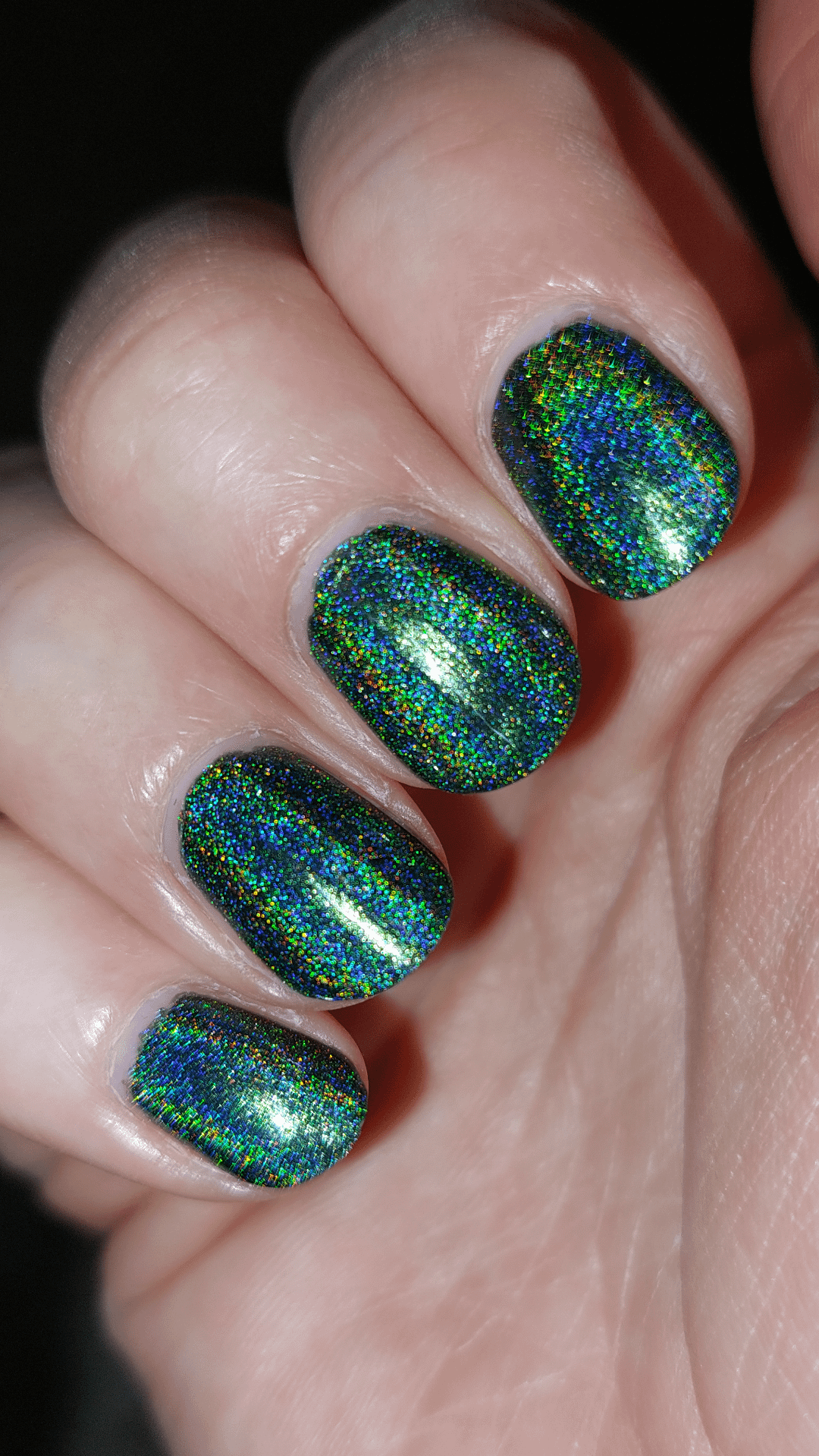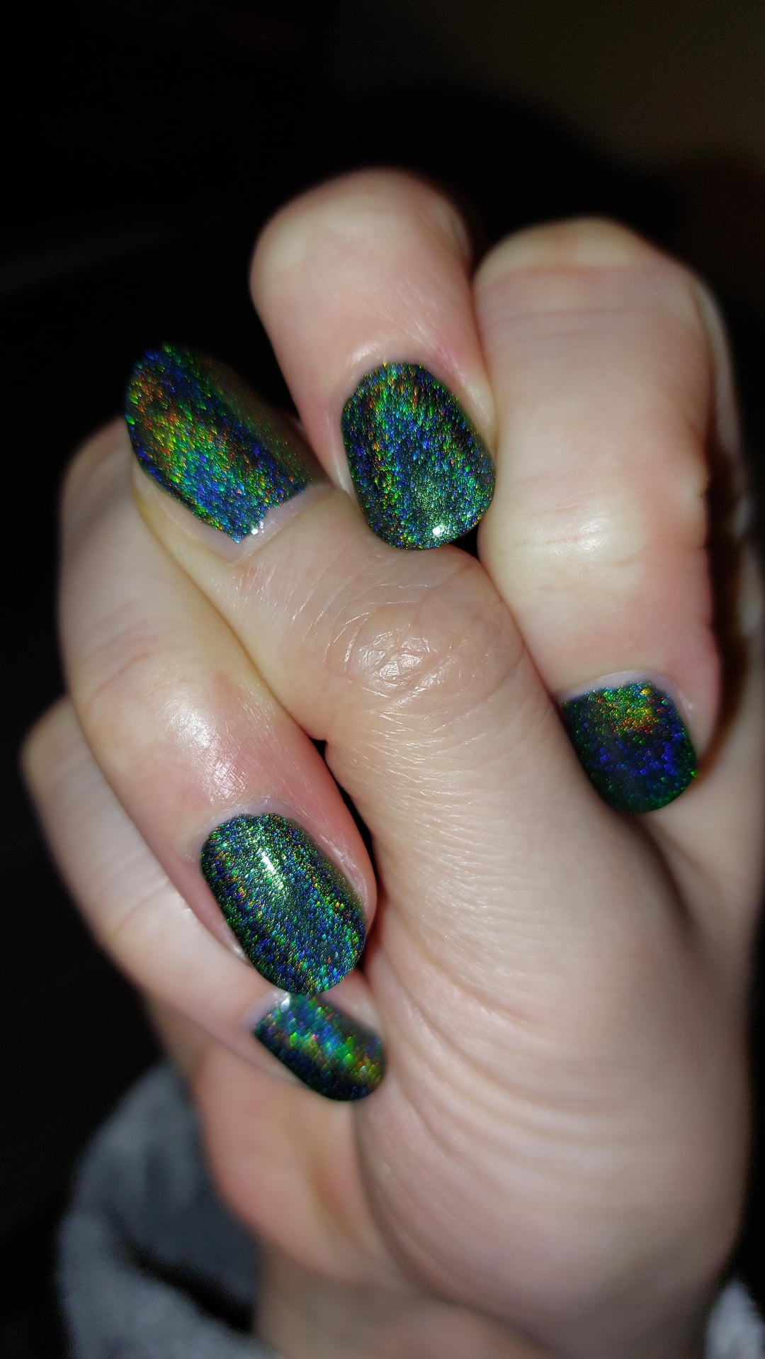 This is an old HHC exclusive, a gorgeous blueish green with a strong holo. Tried wrapping the polish for the first time ever so we'll see how that goes! Also posing your fingers like this really shows off the shifts well. 😆