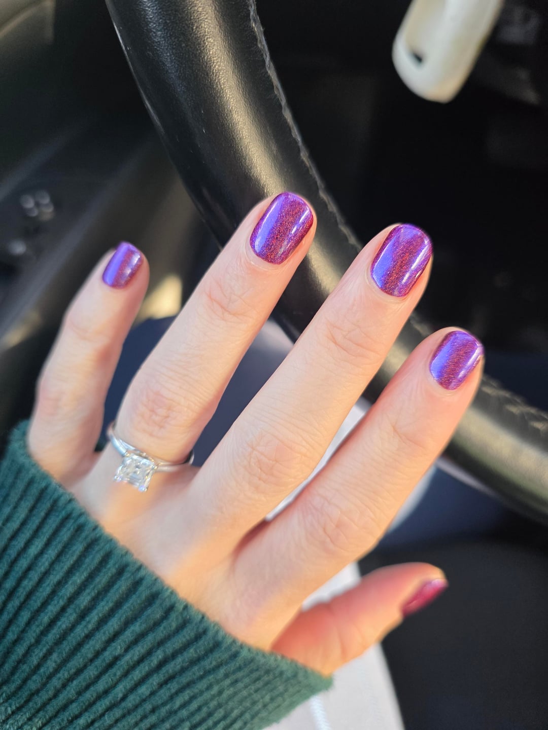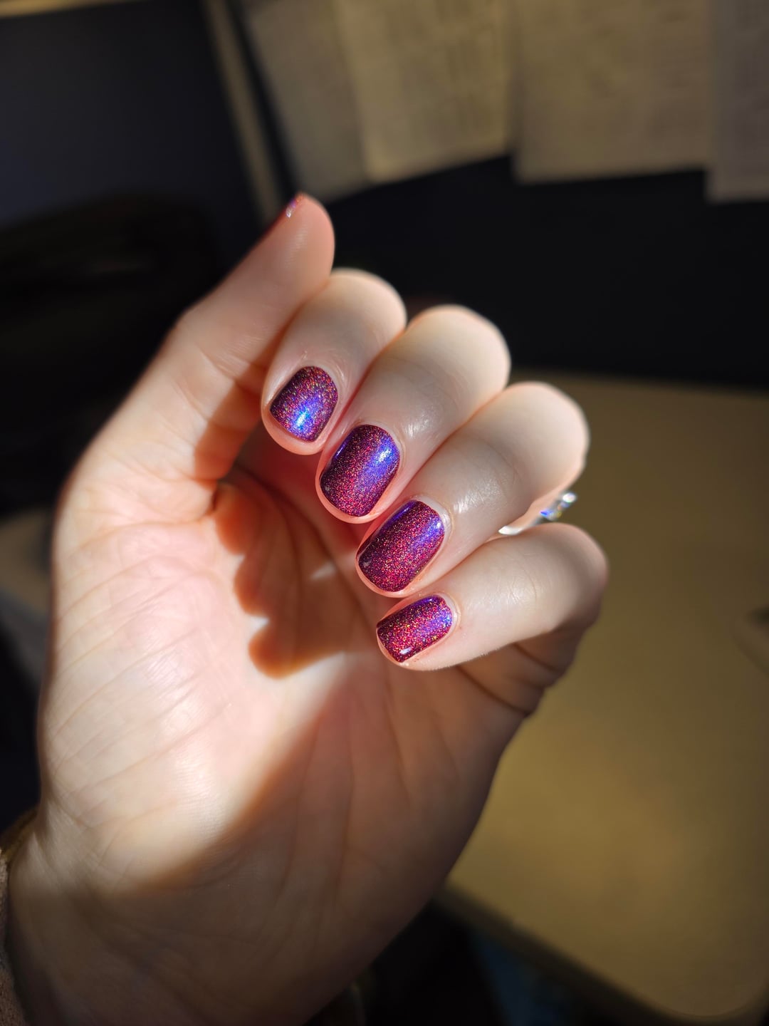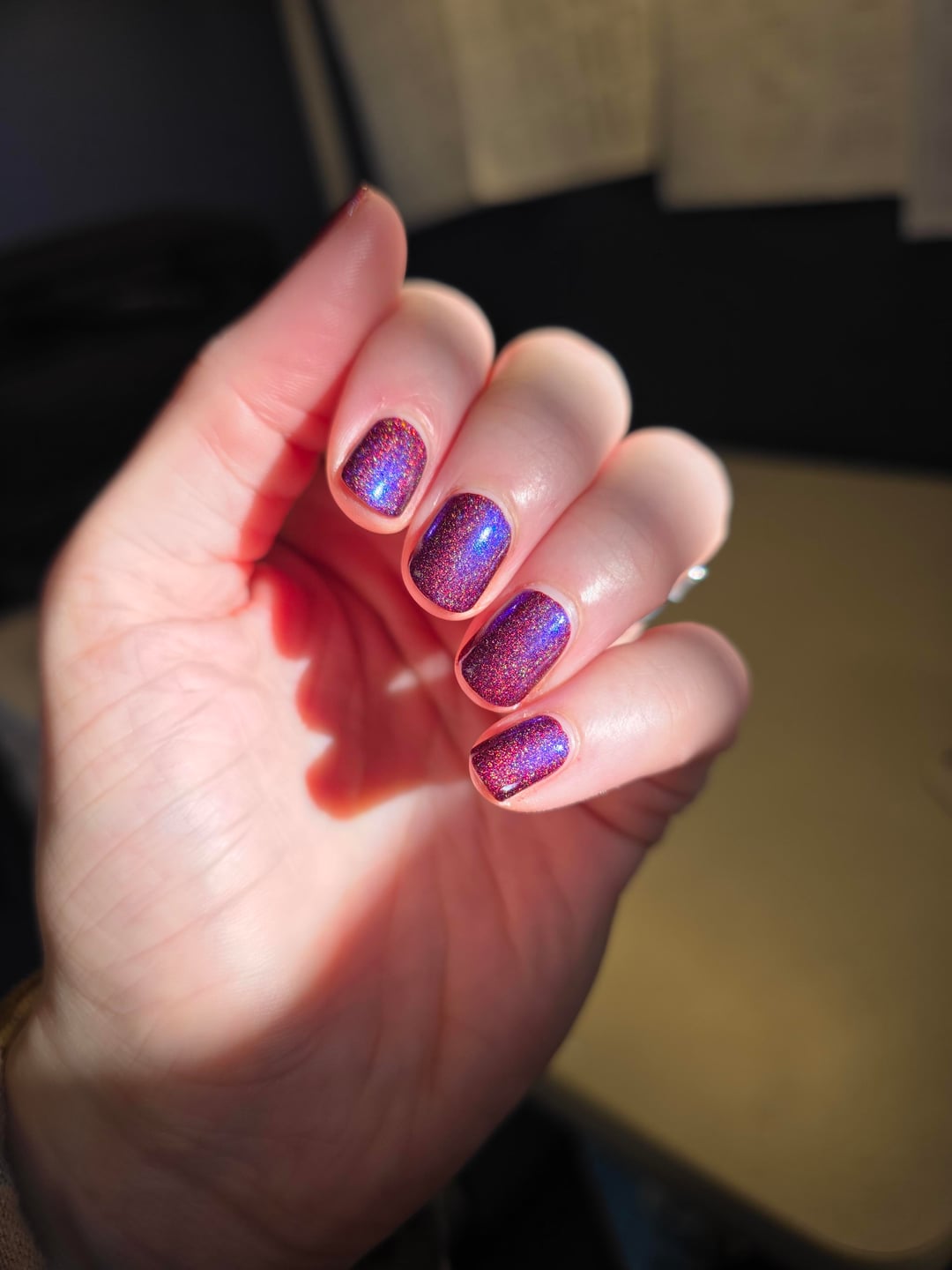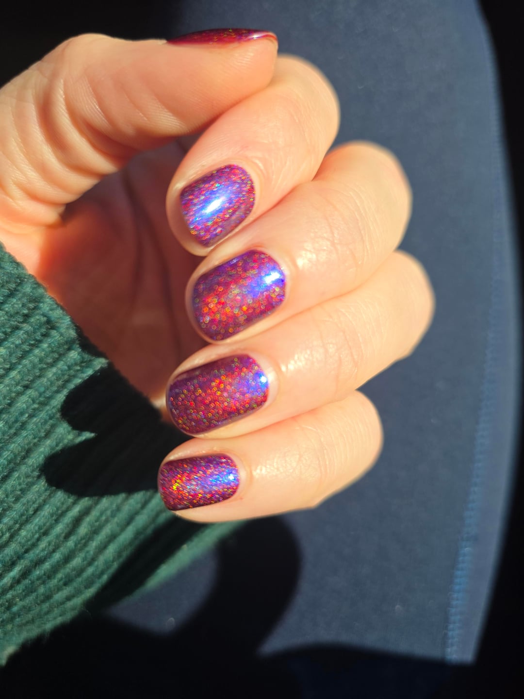 My first Royal Lee did not disappoint. I think the base color here is totally unique. Not quite magenta, not quite burgundy. Somewhere in the middle. And I love how the blue shimmer plays with the holo. Really great application as well. Definitely won’t be my last from them!!