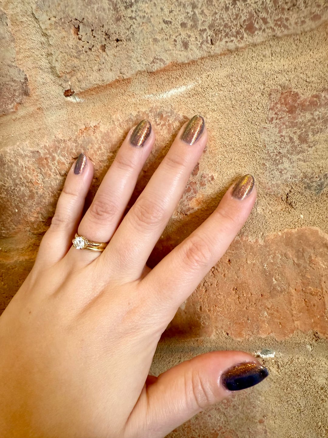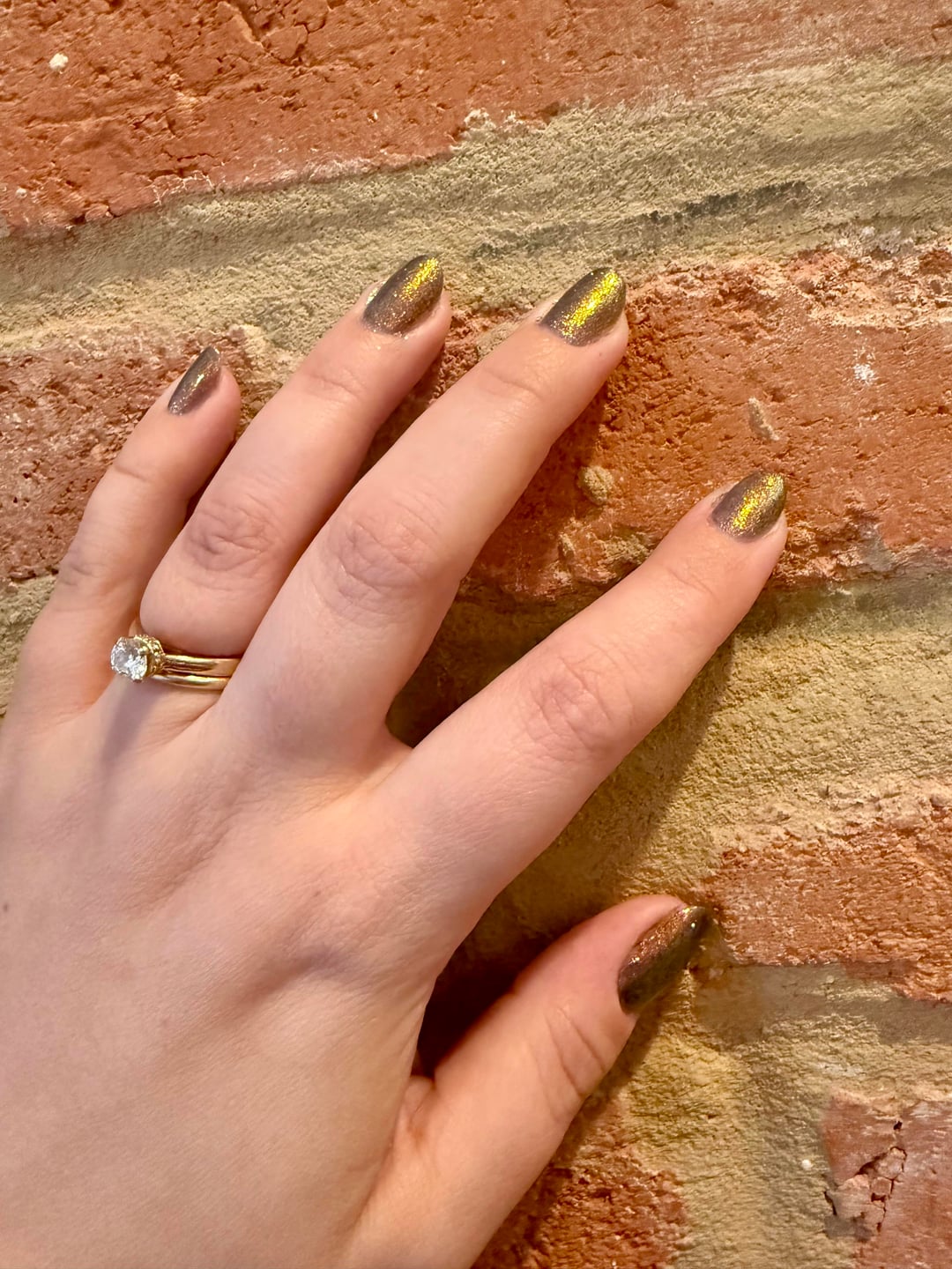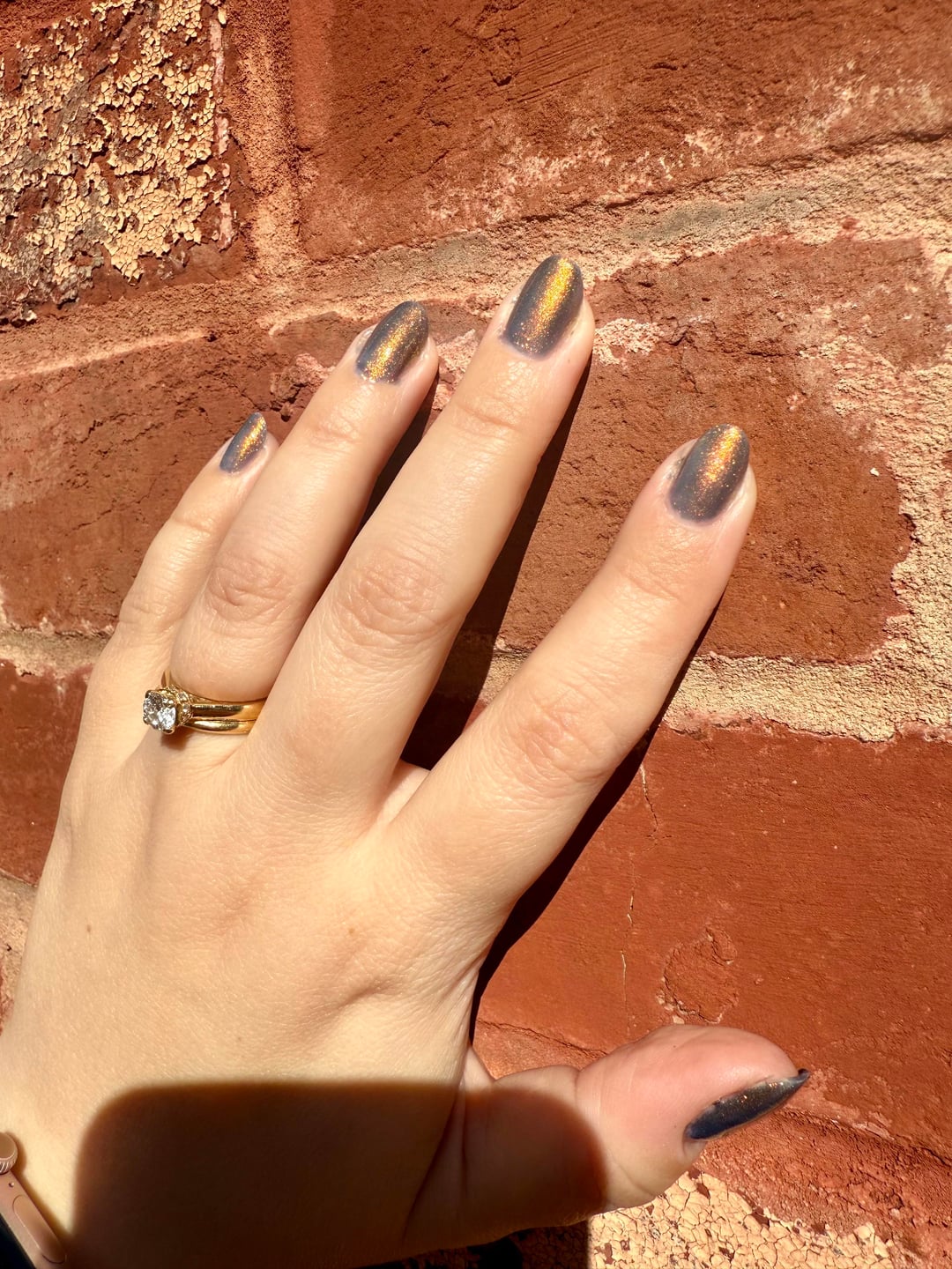 I can’t believe I slept on this polish, it’s such a gorgeous fall shade! It’s so hard to photograph though—the smoky blue undertones show up beautifully in direct light, but it’s hard to capture in a photo. First photo is outside in direct sun, second two are inside—bricks are roughly the same color in all locations.