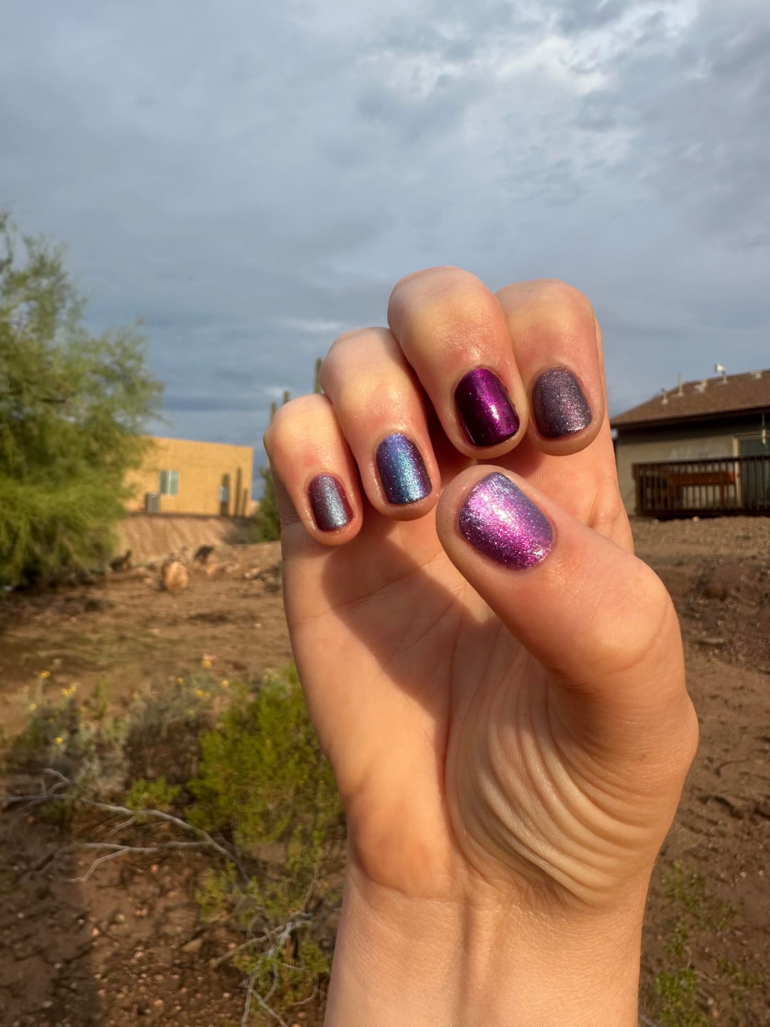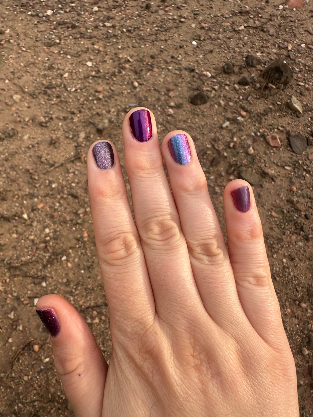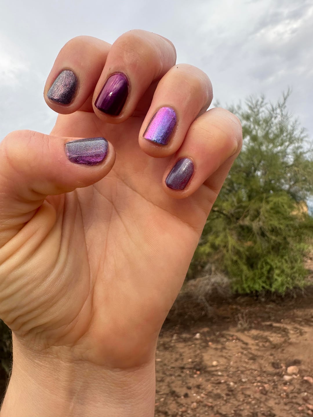 Pinkie: Doom Loop’s Moral Panic 🧲 (A fairly subtle magnetic. Velvet worked well and is gorgeous in high light. As for glass bead – I struggled and it kind of just looks like a shimmer. I really want to try it in the cat eye next time as there is a good bit of contrast between the electric blue shimmer magnetic and the slightly dusty plum jelly base.)