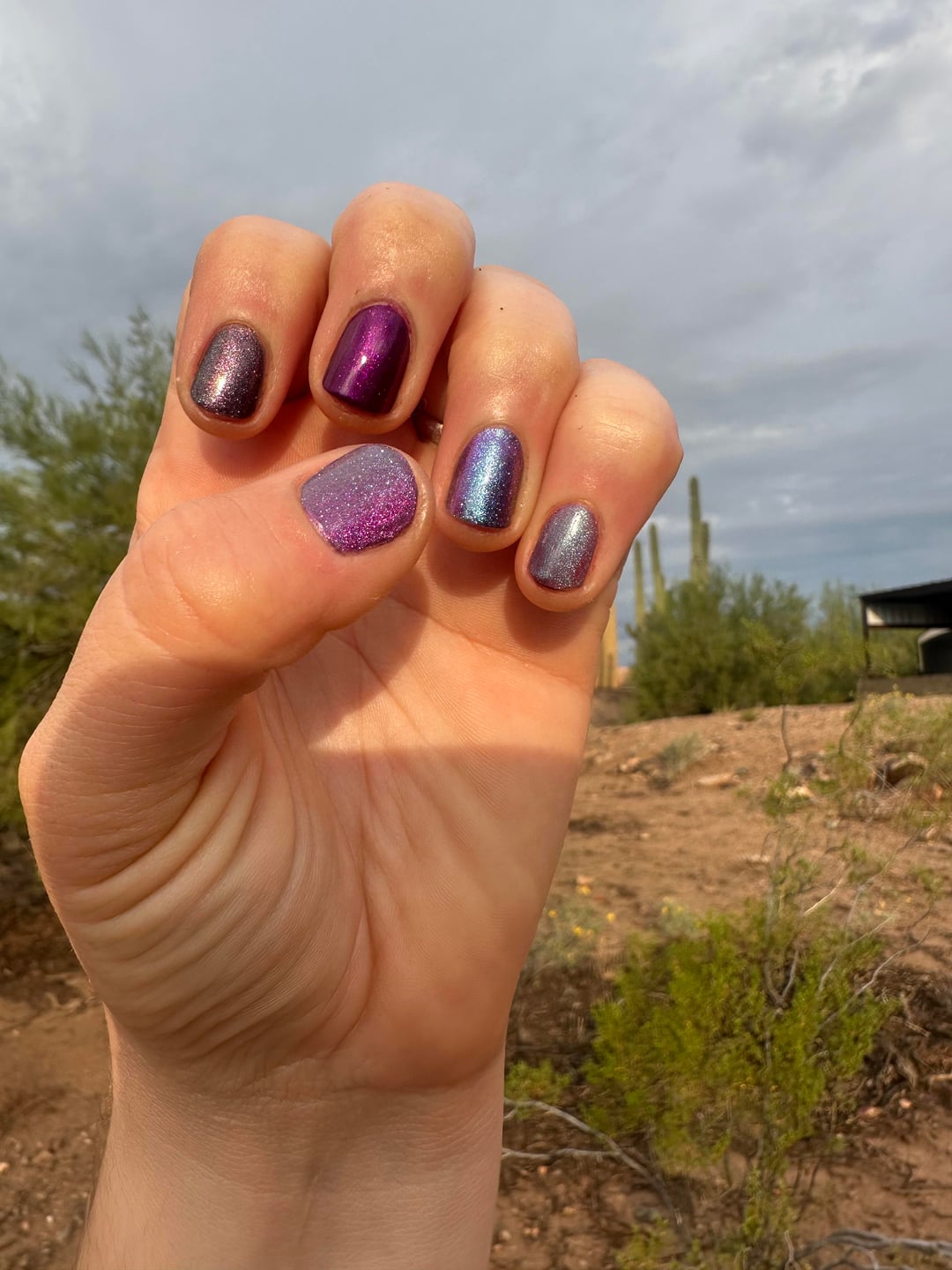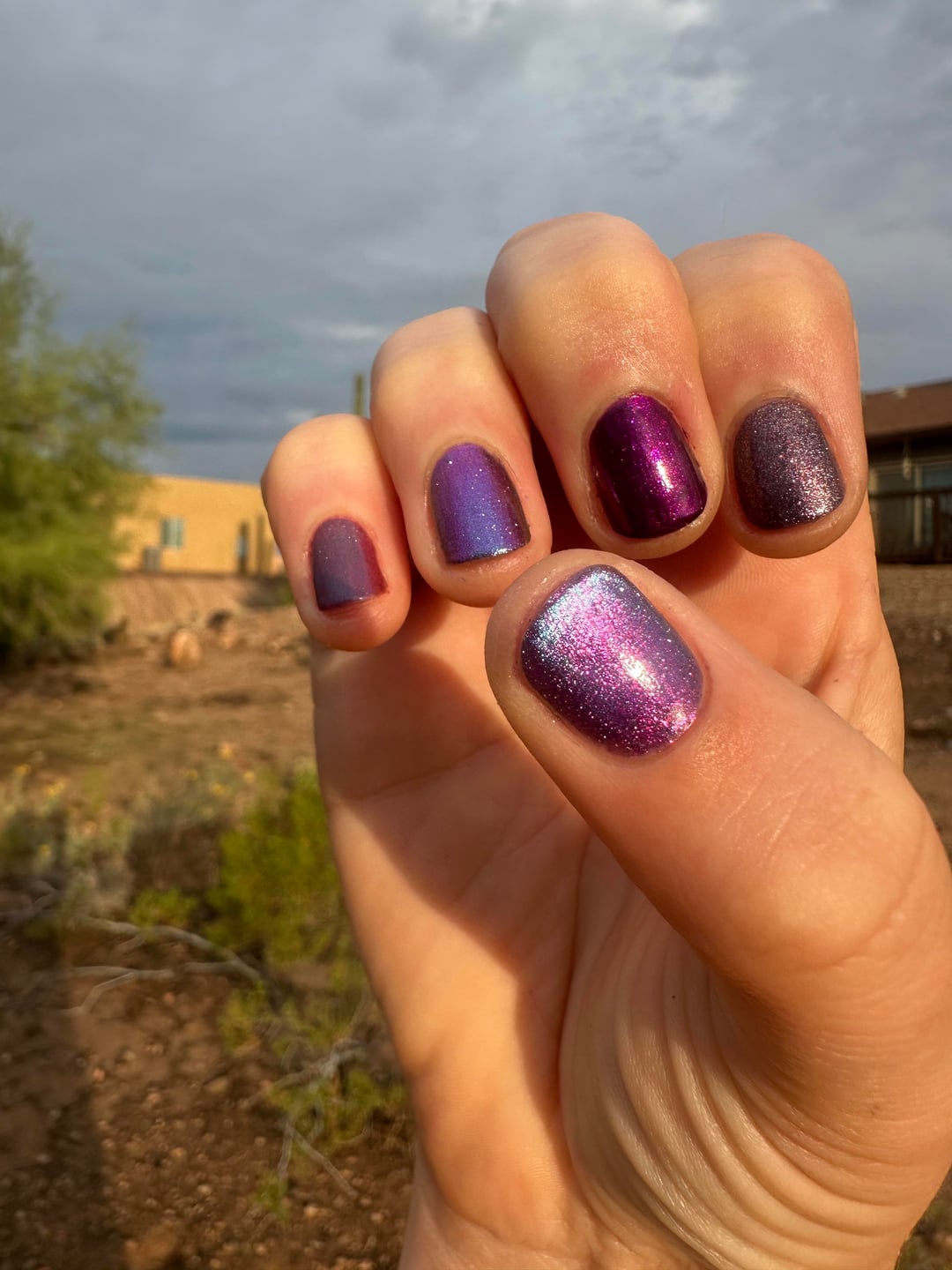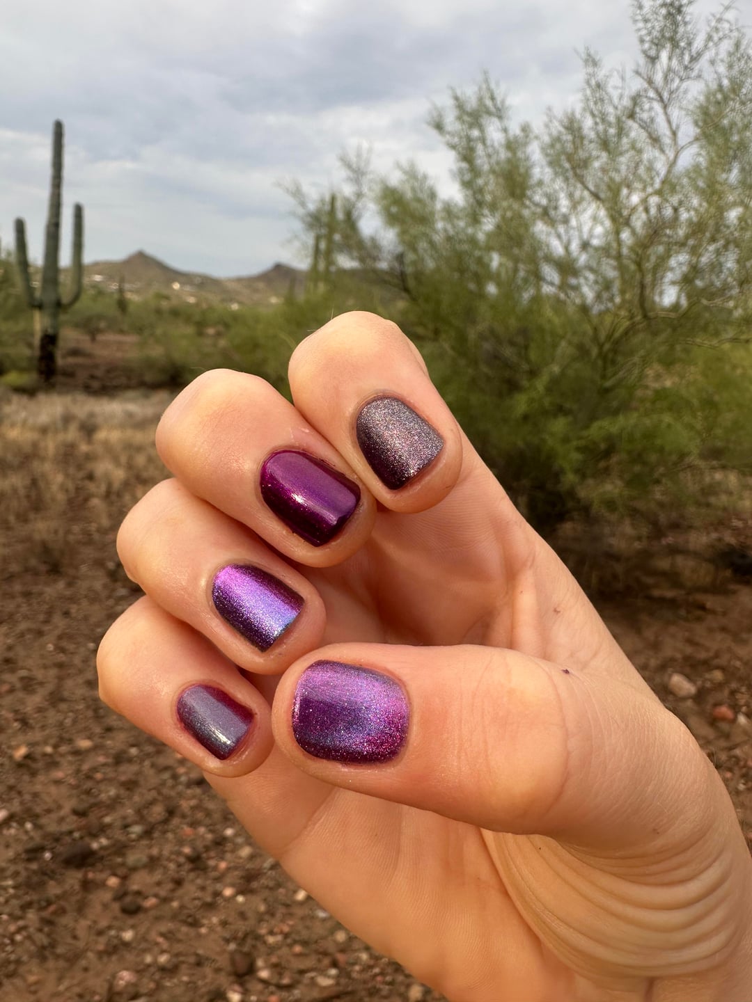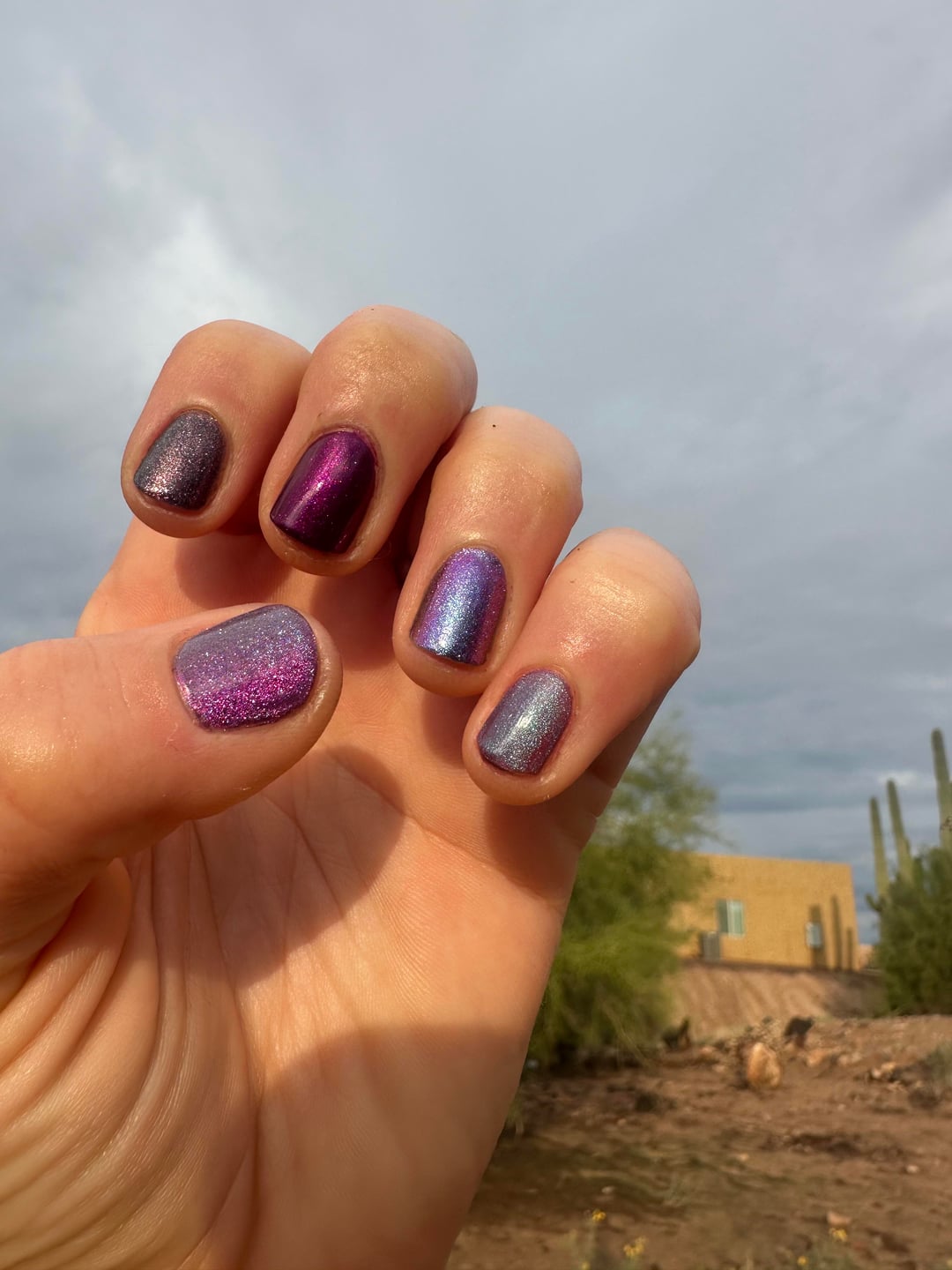 Pinkie: Doom Loop’s Moral Panic 🧲 (A fairly subtle magnetic. Velvet worked well and is gorgeous in high light. As for glass bead – I struggled and it kind of just looks like a shimmer. I really want to try it in the cat eye next time as there is a good bit of contrast between the electric blue shimmer magnetic and the slightly dusty plum jelly base.)