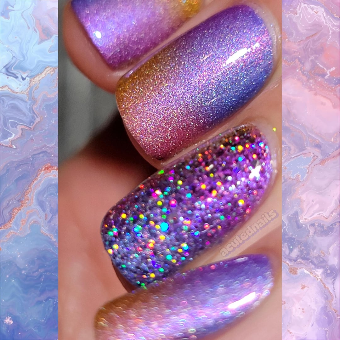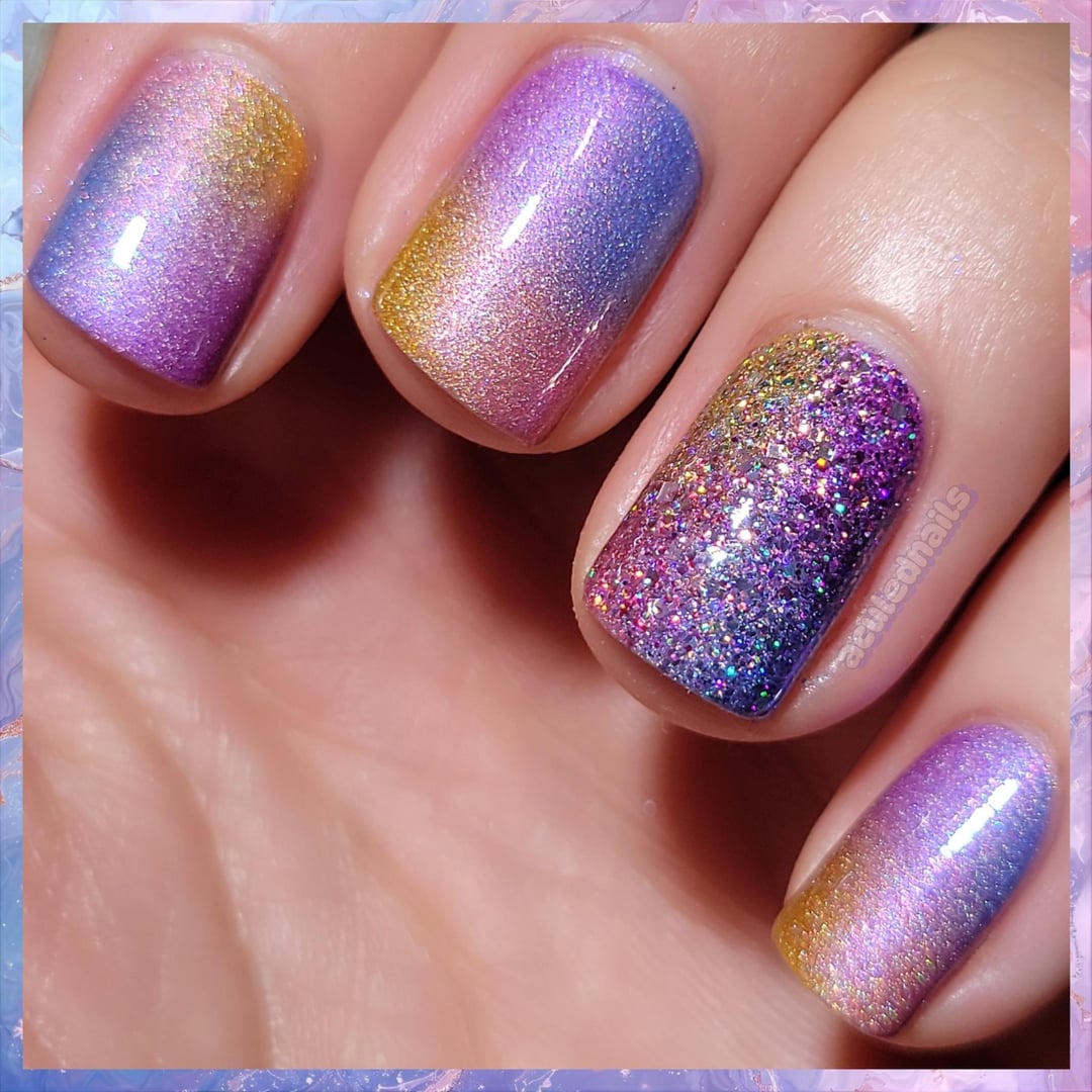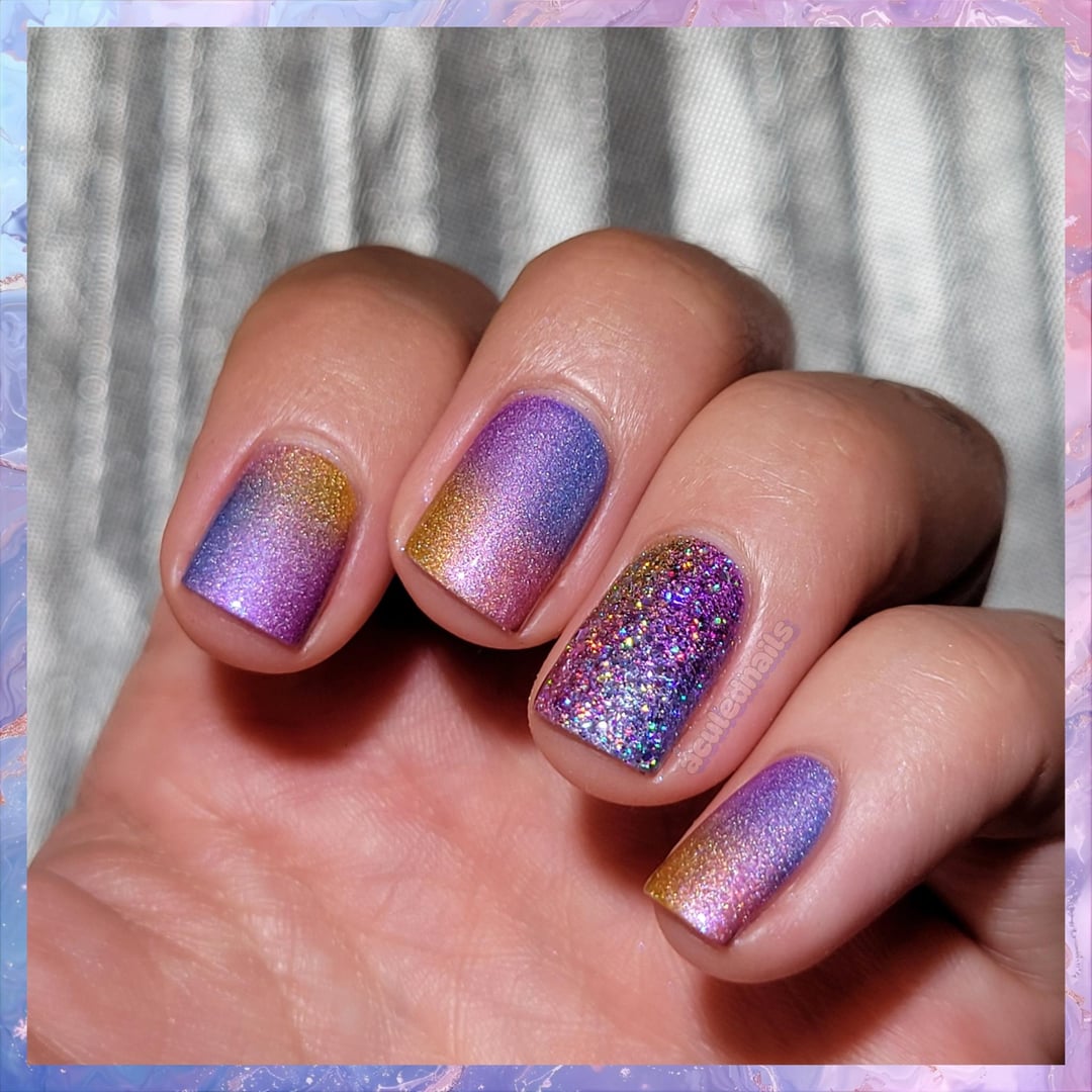 1. A close friend came to stay with us for a little bit, and while I really don’t enjoy painting other people’s nails, I love her very dearly, so I offered up my polish collection and skills for a mani. 💓 After much deliberation, and the overwhelming choice paralysis you get when you stare at thousands of polishes 😝, she chose a randomized gradient of some crushed holos that came out fantastically! I, being me, convinced her to add some glitter and BOOM, this mani was born. She and I enjoyed it so much that I ended up doing it on myself right after 🤭