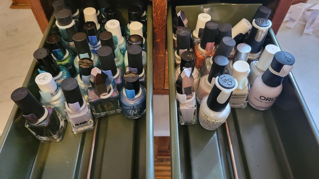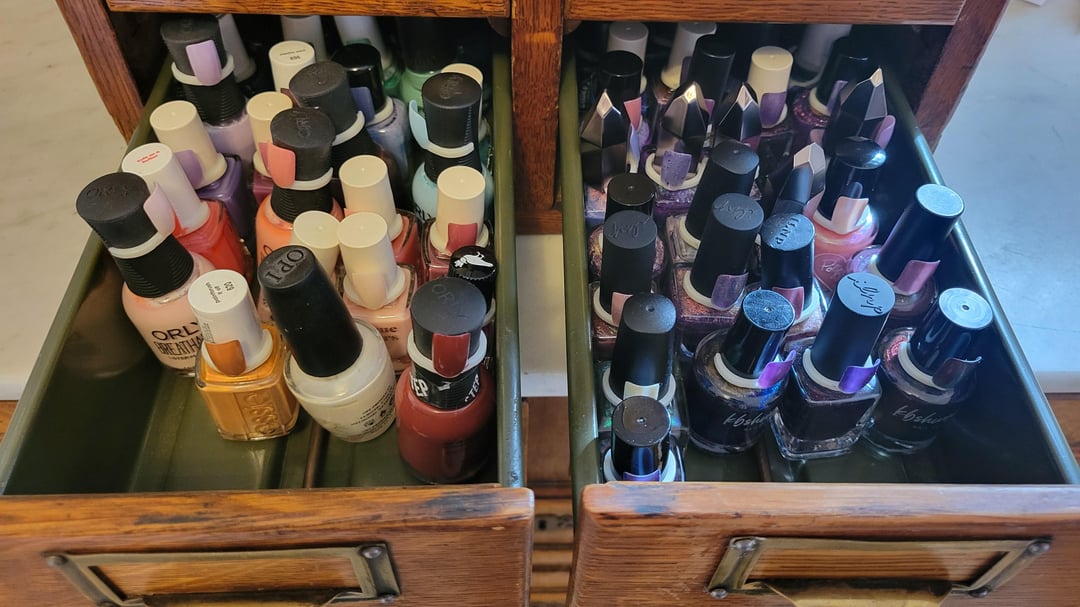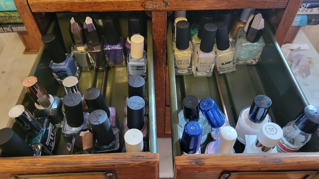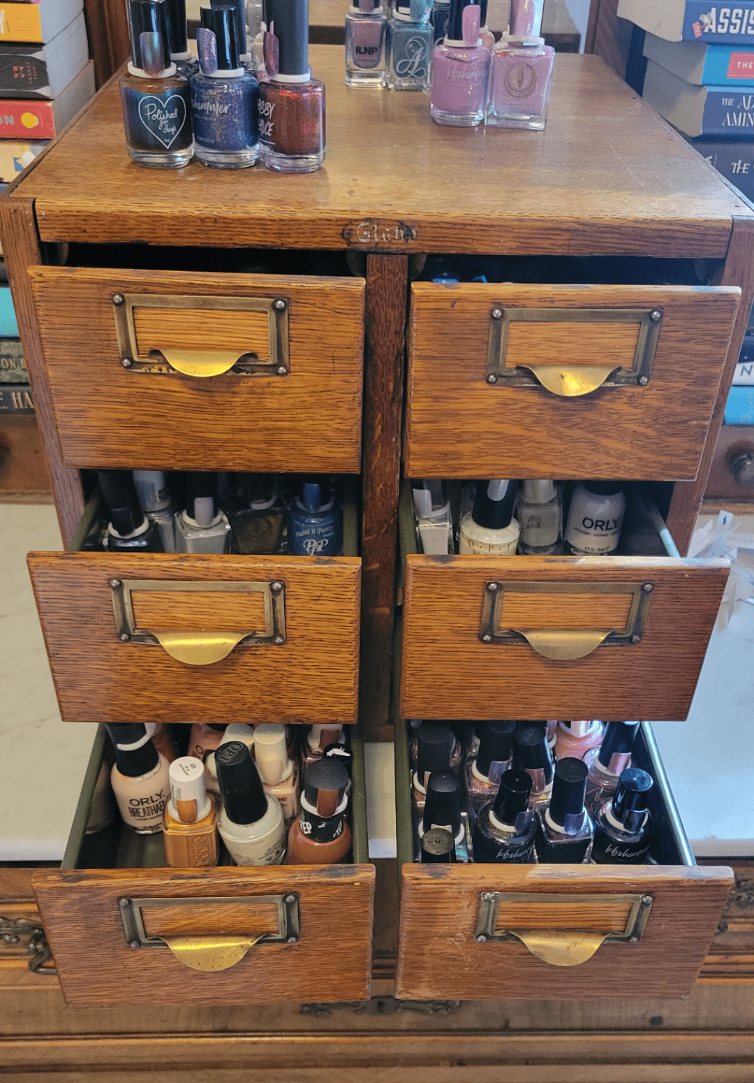 I had been using those tiered clear plastic shelves to store my polish but I wanted something that would protect them from light as they were near a window. I had this vintage card catalog that I'd been storing art supplies in and repurposed it for polish and they fit really well! The downsides are that the drawer bottoms aren't flat, and that it's harder to tell what everything is at a glance. But it looks a lot nicer than the plastic shelving and fits a surprising amount of polish, plus the drawer depth is adjustable so they don't get lost in the back.