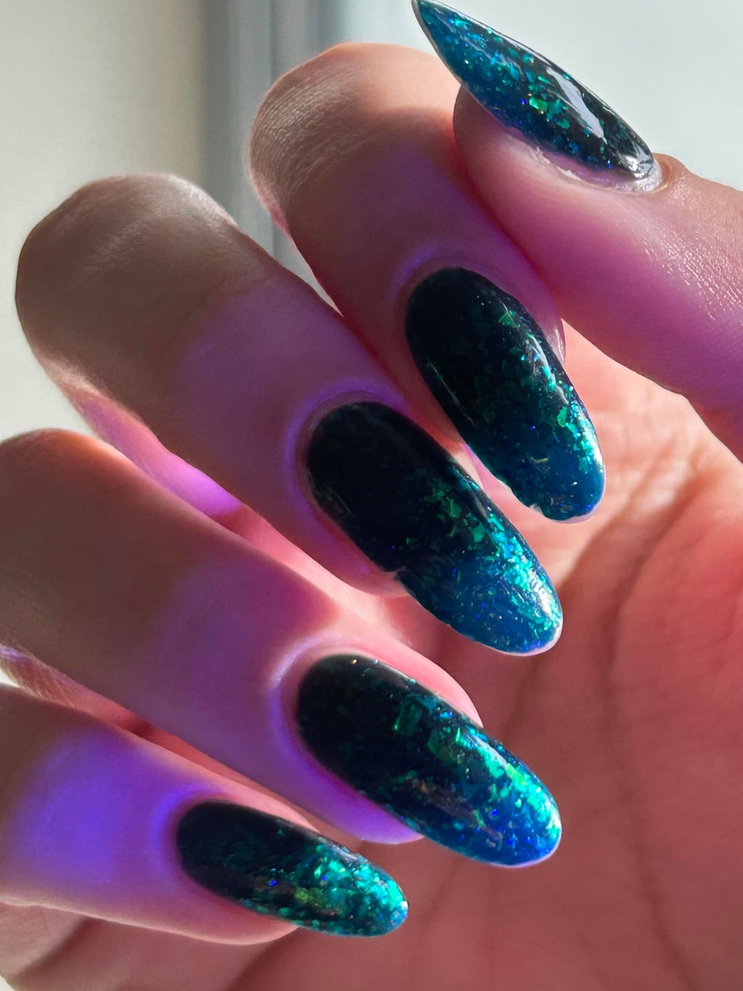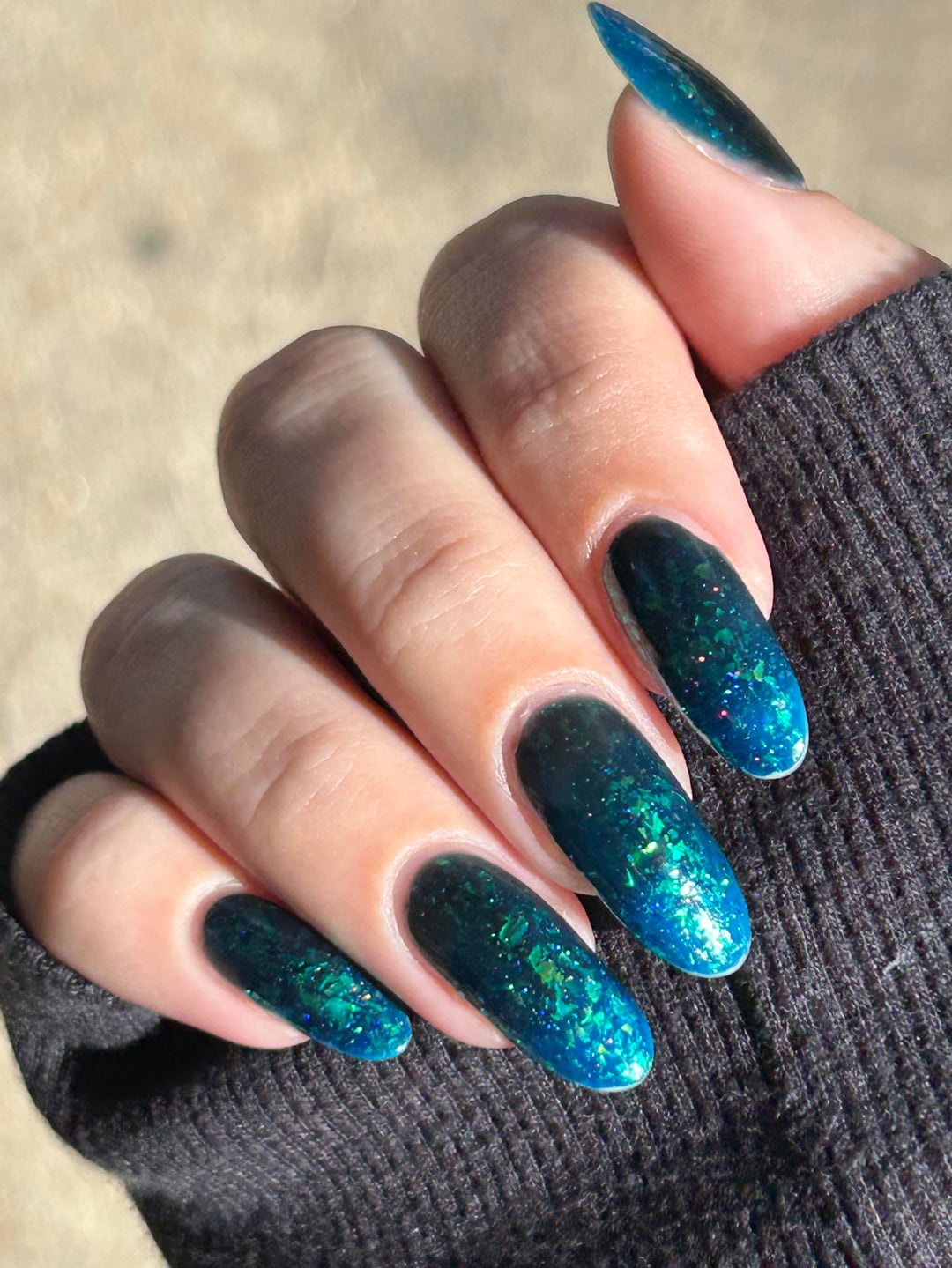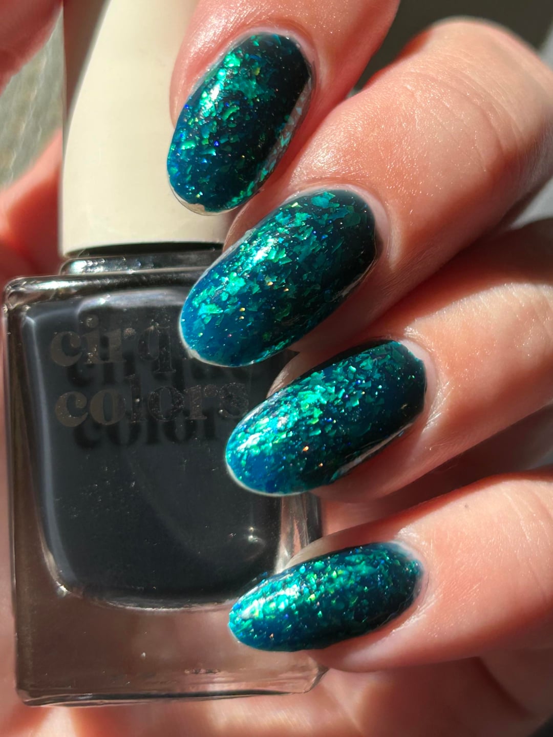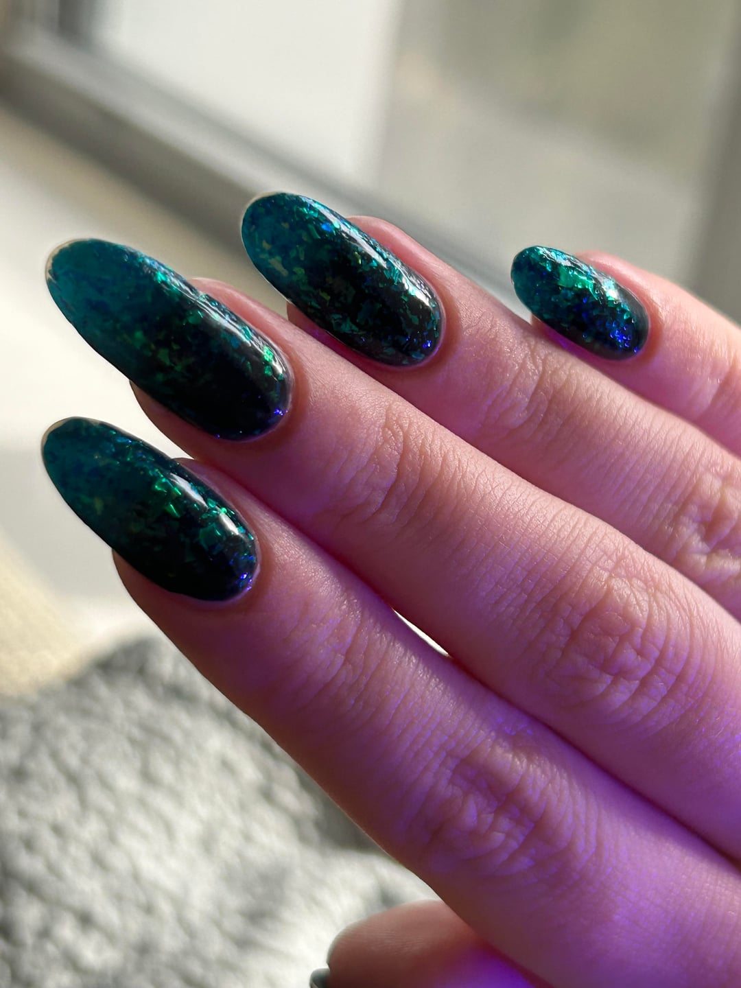 I’m not sure how well you can see it in pictures, but the gradient is black to blue/green (and I think it turned out pretty good, it’s very dark near my cuticles) Used Mooncat- maelstrom Cirque Colors- nsfw jelly by ResearcherComplete57
