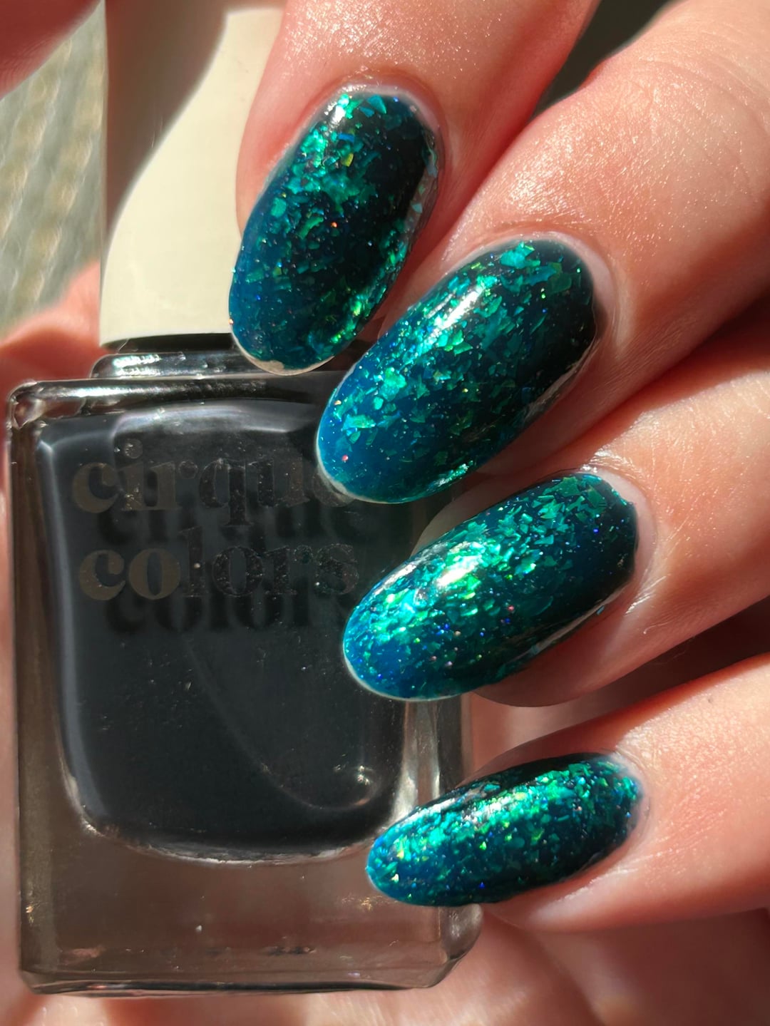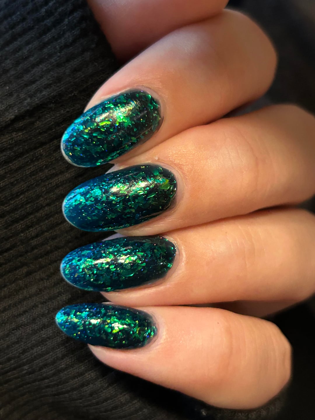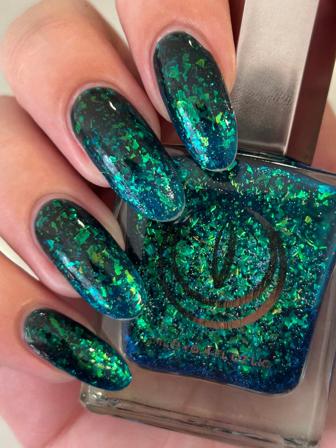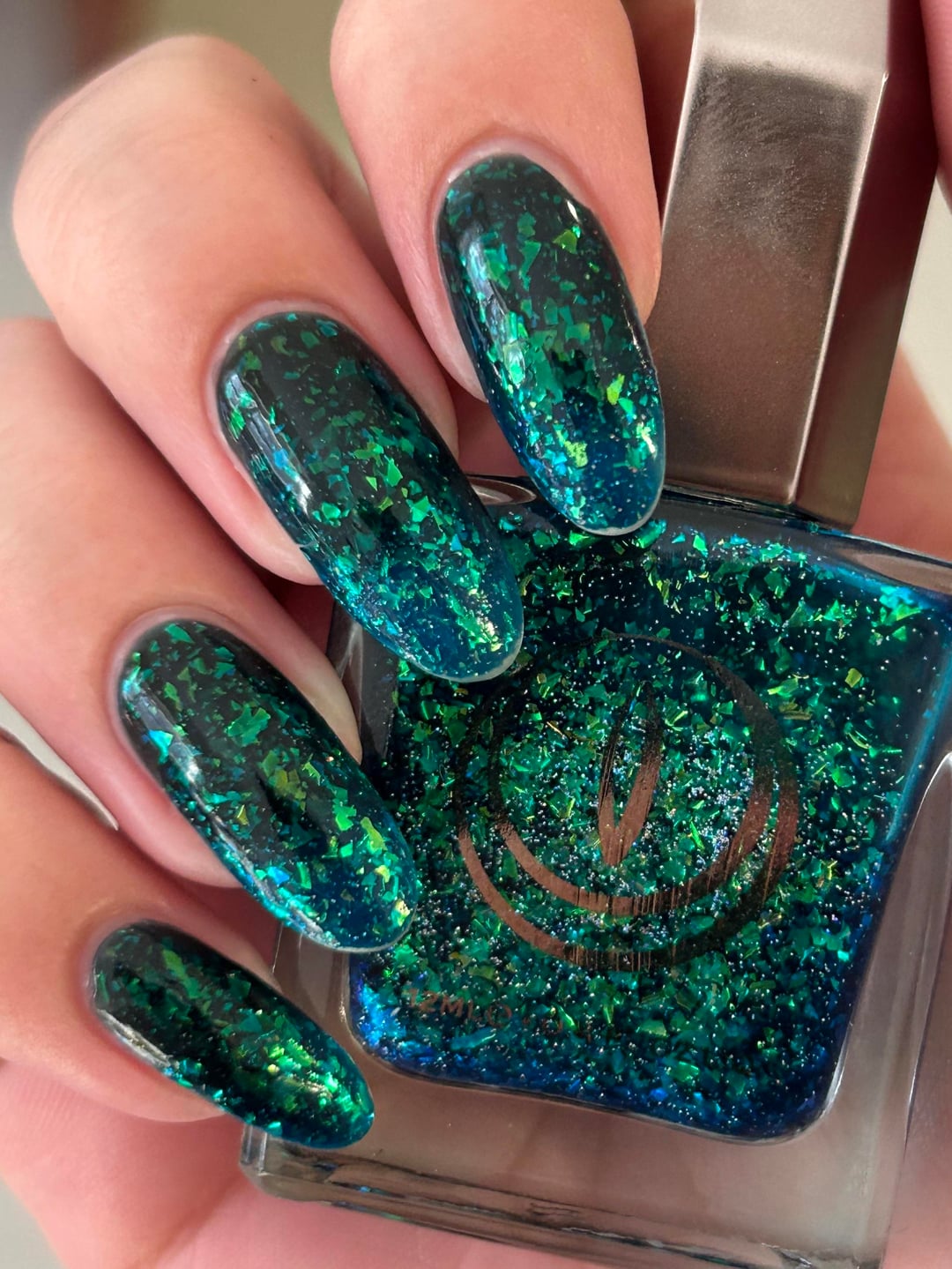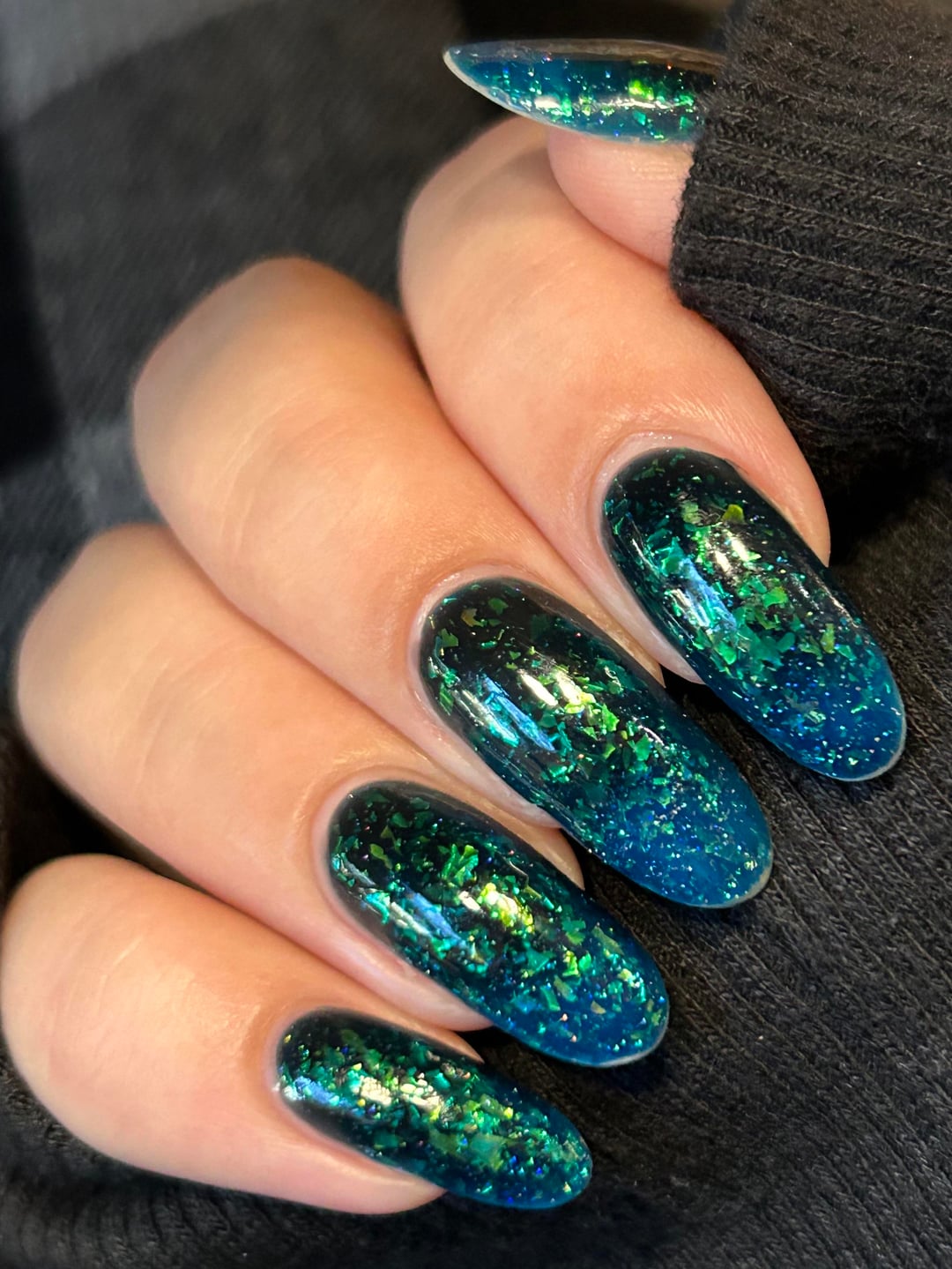 I’m not sure how well you can see it in pictures, but the gradient is black to blue/green (and I think it turned out pretty good, it’s very dark near my cuticles) Used Mooncat- maelstrom Cirque Colors- nsfw jelly by ResearcherComplete57