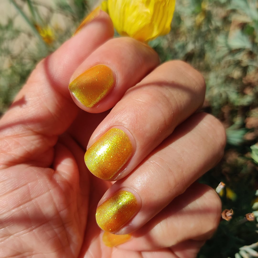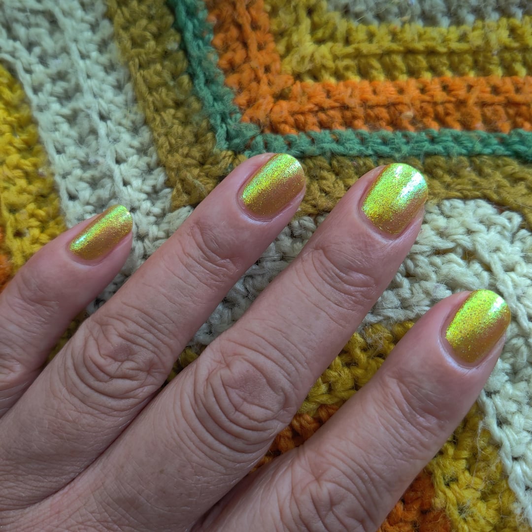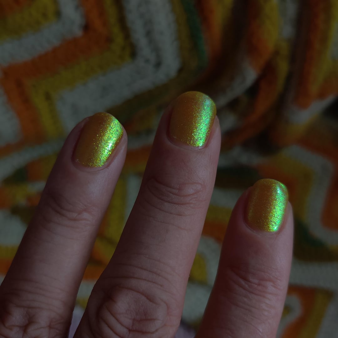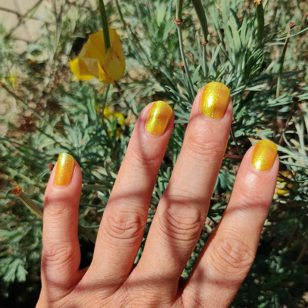 About to change my nails and wanted to share them somewhere. My partner and I went on vacation for his birthday and I wanted to do something bright and fun. I chose yellow because he loves yellow – and so do I! I love the green shimmer that pops in low light.