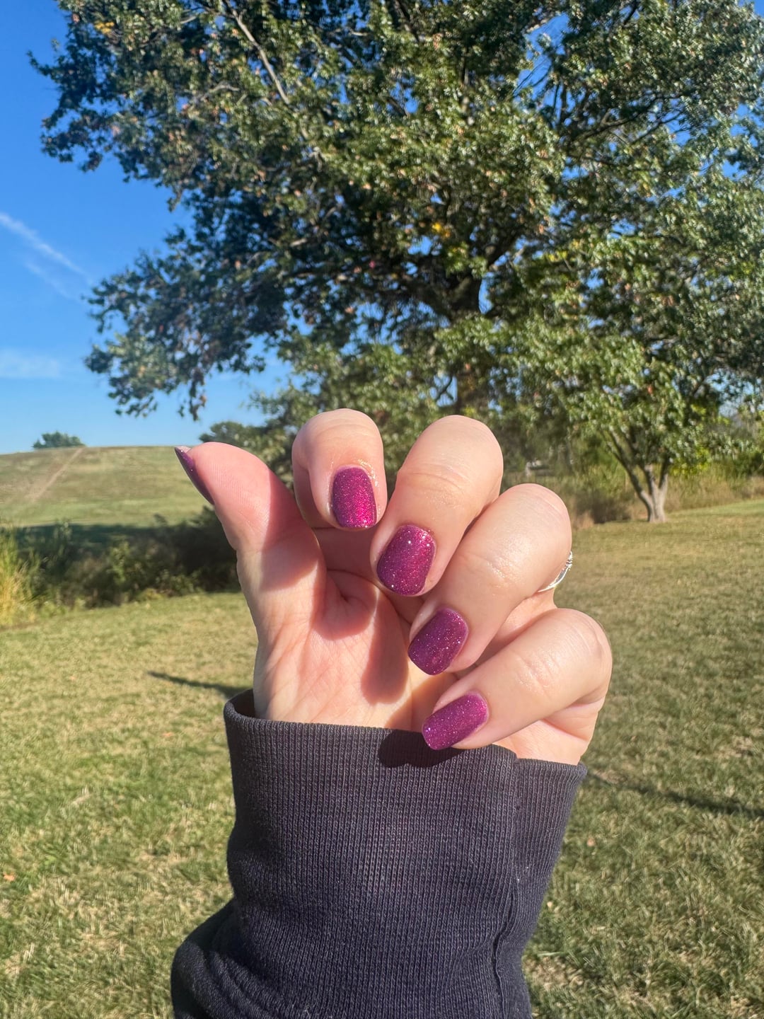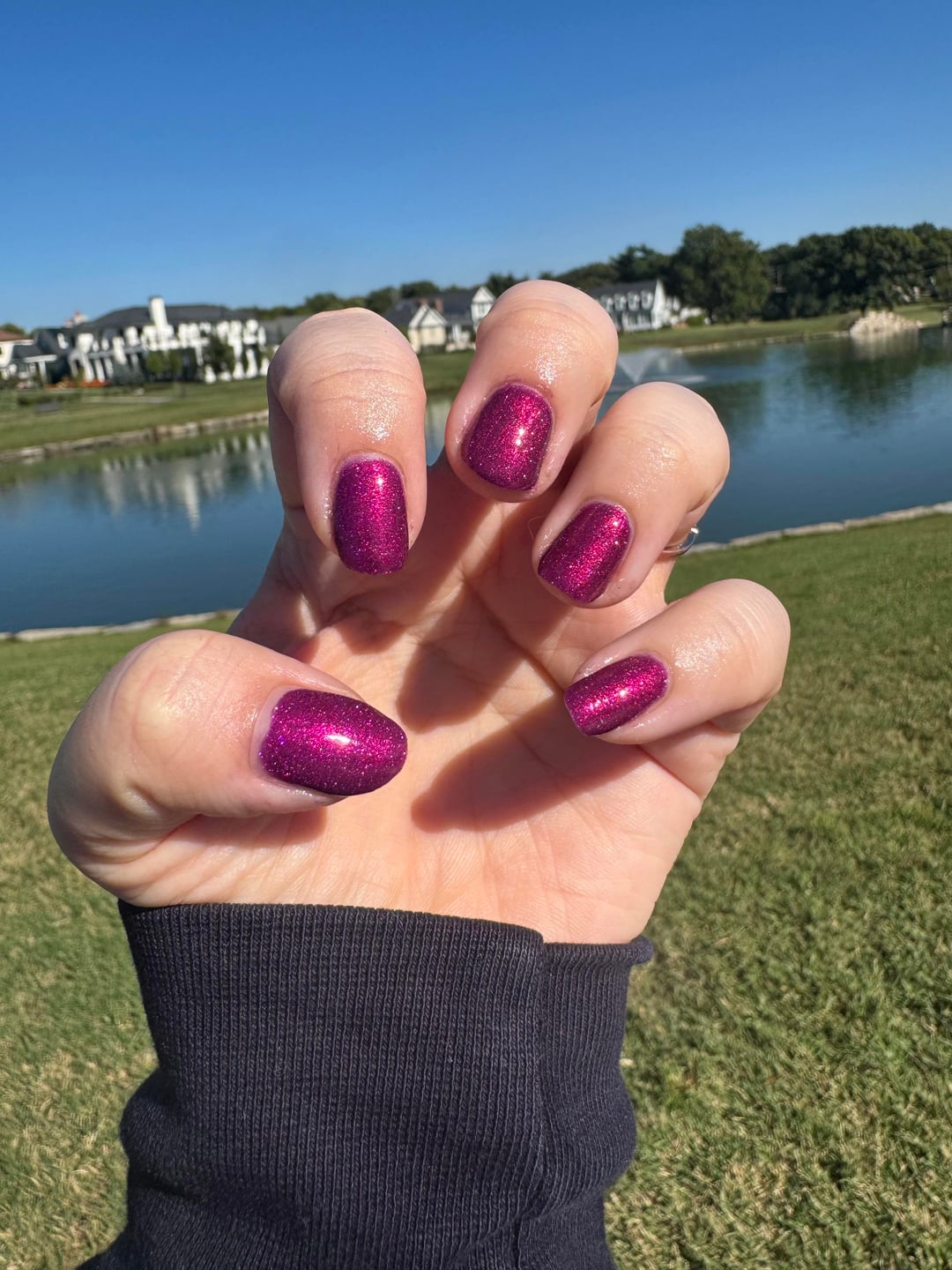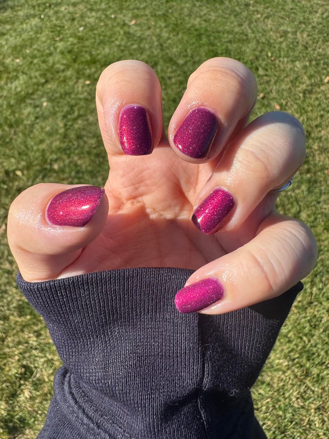 I did it in three coats with nailtiques formula 2 plus for the base coat and 2 coats of Essie gel couture for top coat since it’s reflective glitter and needed the extra layer of top coat. I have kbshimmer’s glitter grabber but it takes so long to dry for me and we were about to leave for the park.