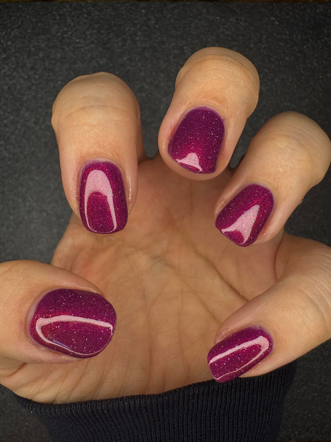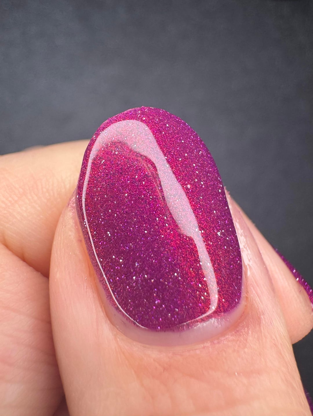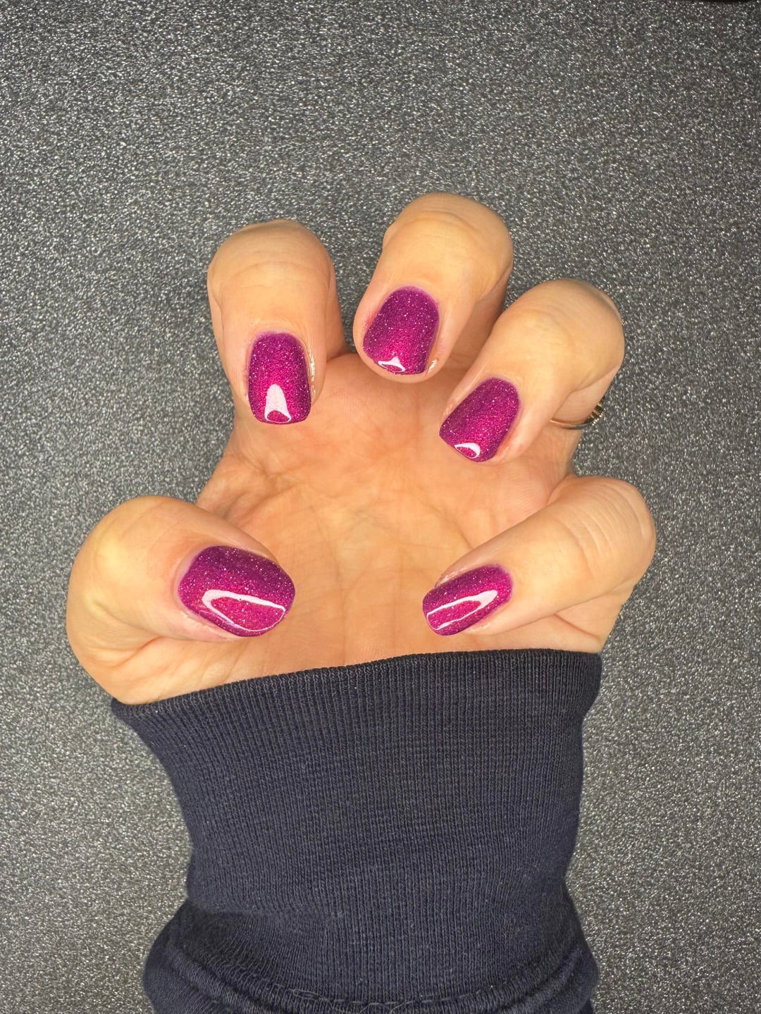 I did it in three coats with nailtiques formula 2 plus for the base coat and 2 coats of Essie gel couture for top coat since it’s reflective glitter and needed the extra layer of top coat. I have kbshimmer’s glitter grabber but it takes so long to dry for me and we were about to leave for the park.