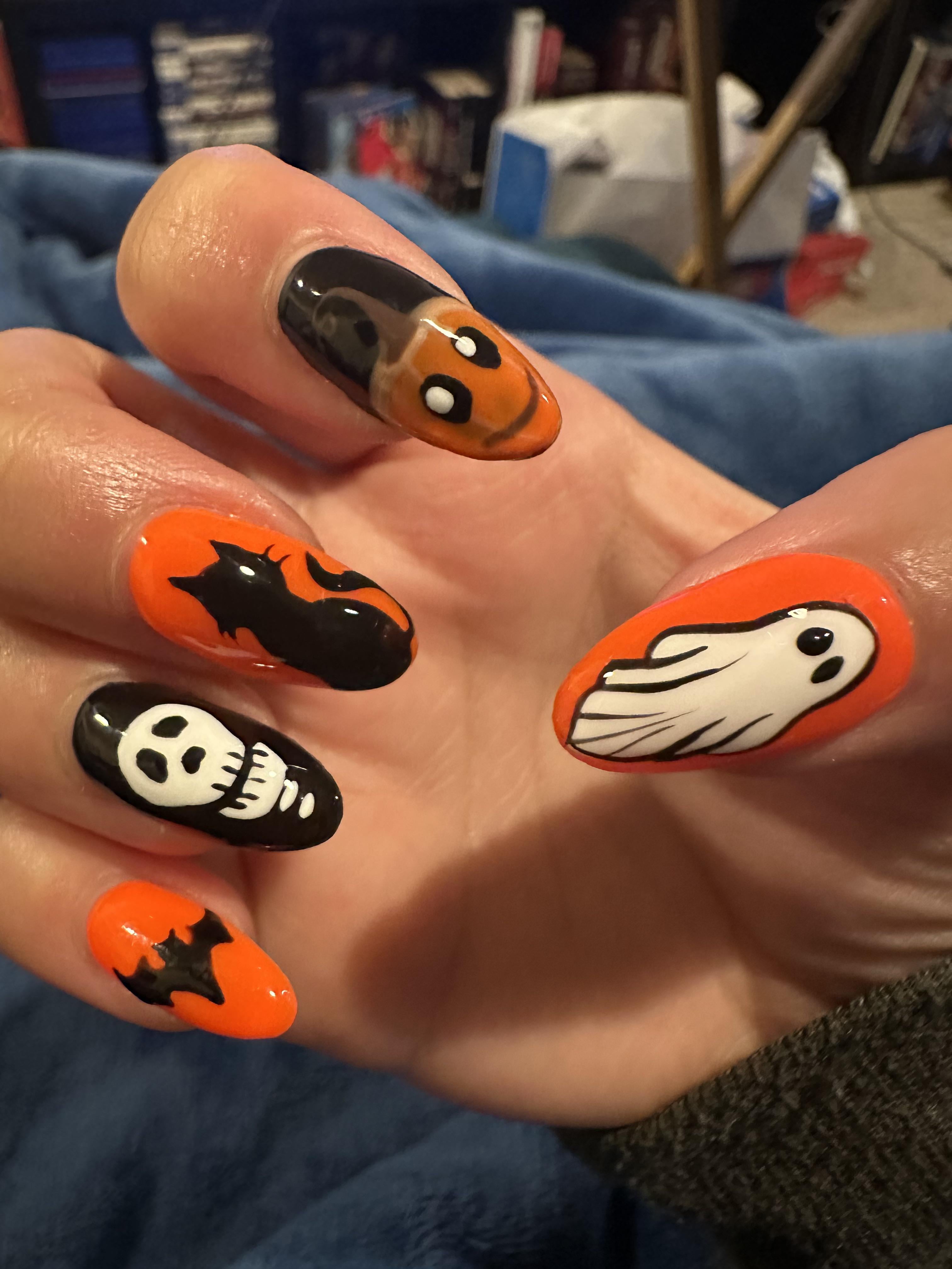 Shoutout to my nail tech for this awesomeness. The bright orange glows under UV Light! Next year I need to look into glow the dark paints by Scho567