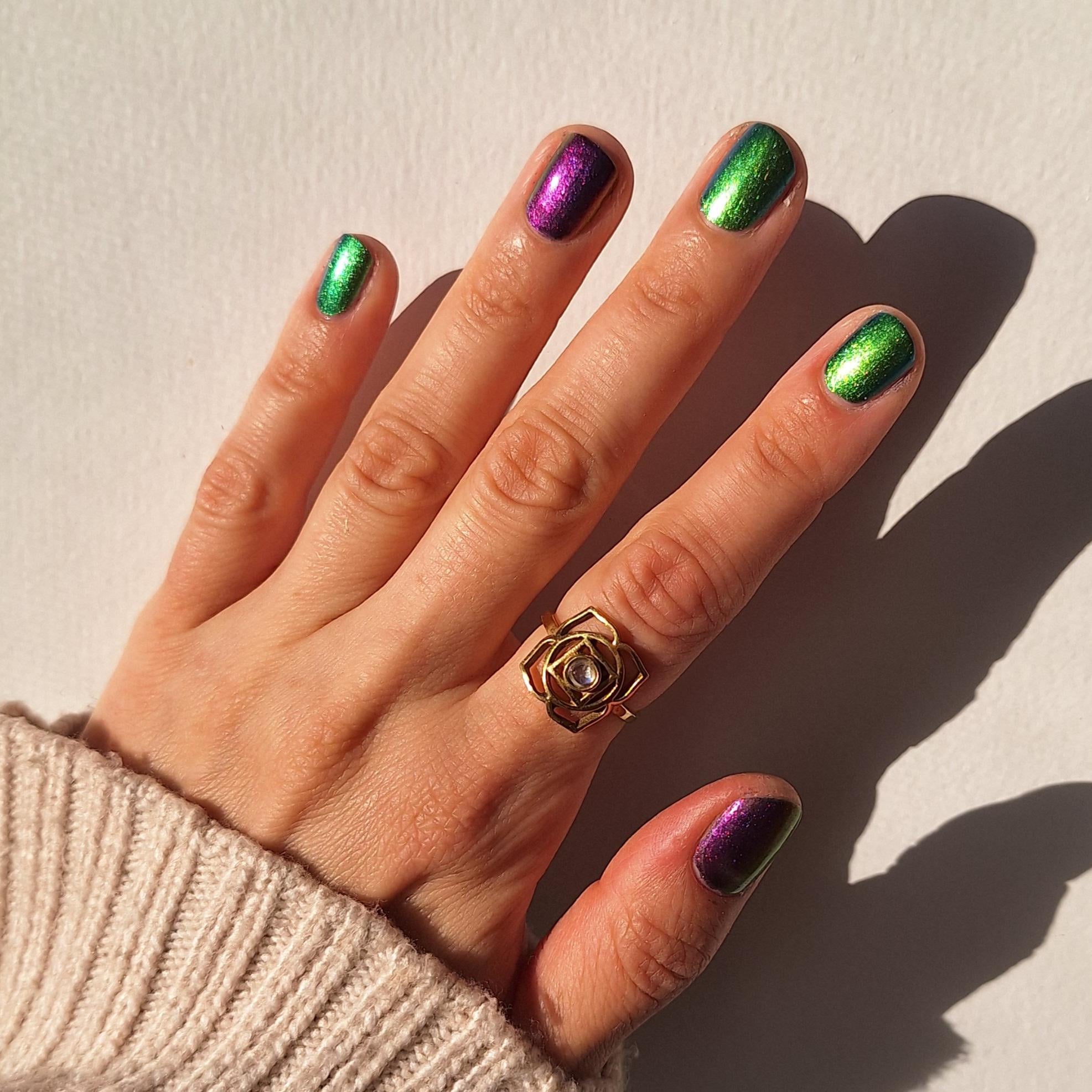 Pinky, middle & index: Mooncat's Serpents of Eden, 3 coats.