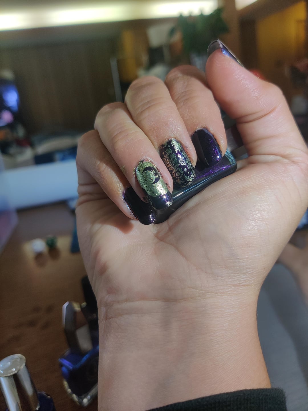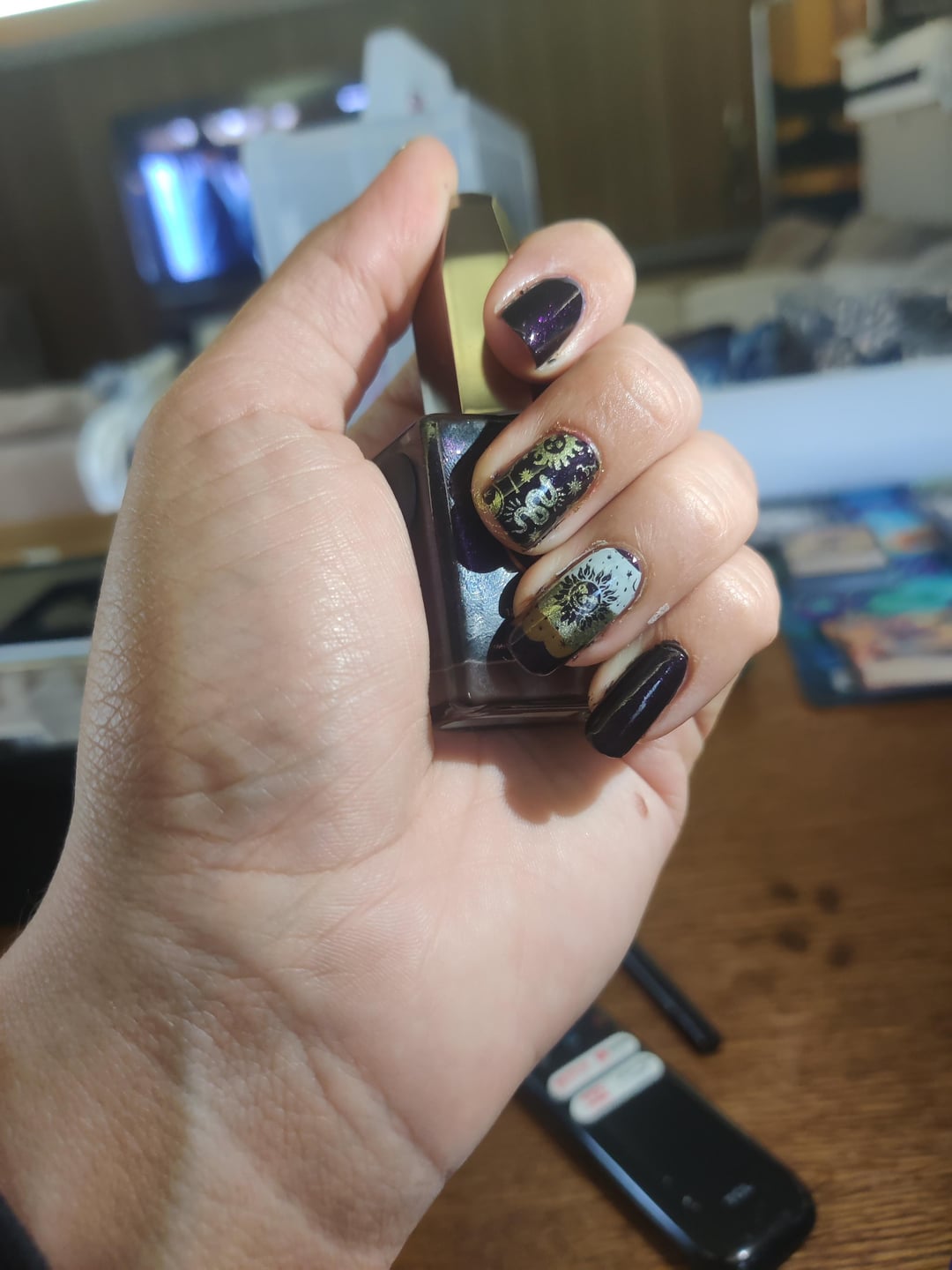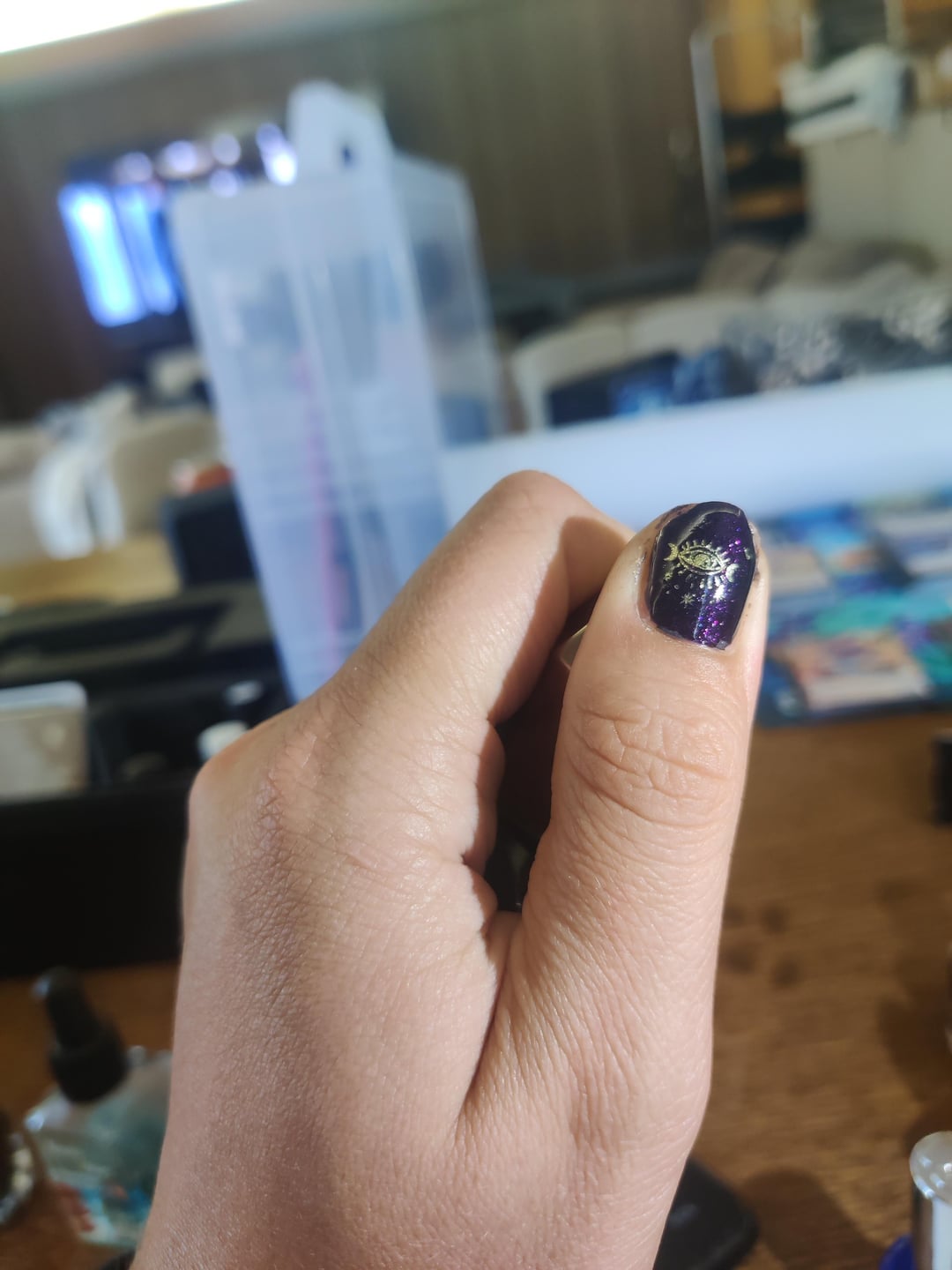 Was going for a candy corn effect with the sun stamp. Orange didn't quite translate over the purple, but the sun is still crisp! Also first time using Seche Vive top coat and I'm in love!
