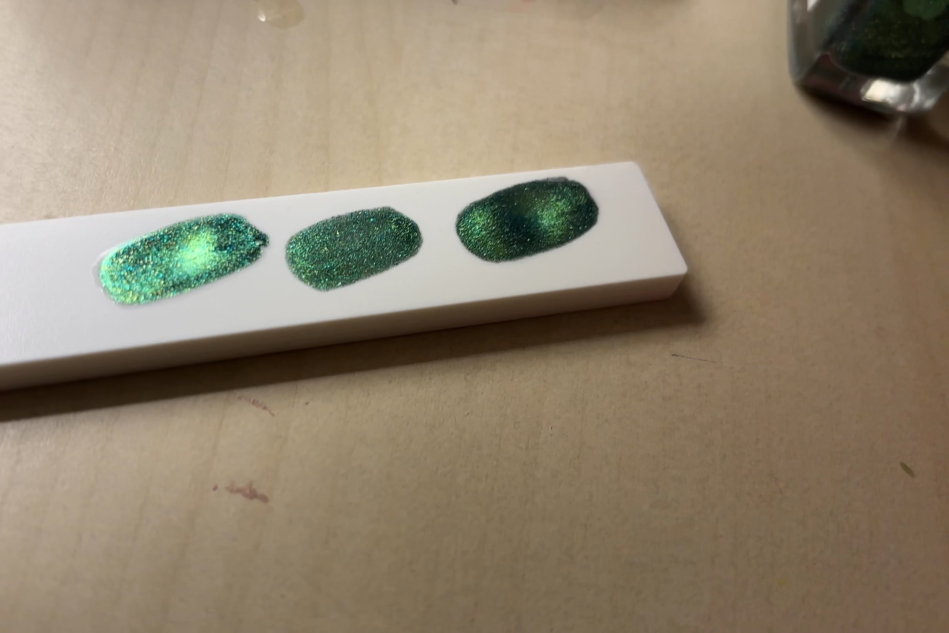 I wanted to see what people thought of my non-horseshoe method! The right and left are swatches that I topcoated and let sit for 24 hours, to show what the dispersal was like and test two different topcoats against each other. I’ve found doing this with the side of the small circular magnet works better than the bar, I assume because the part of the magnet that’s closest to your nail is smaller?