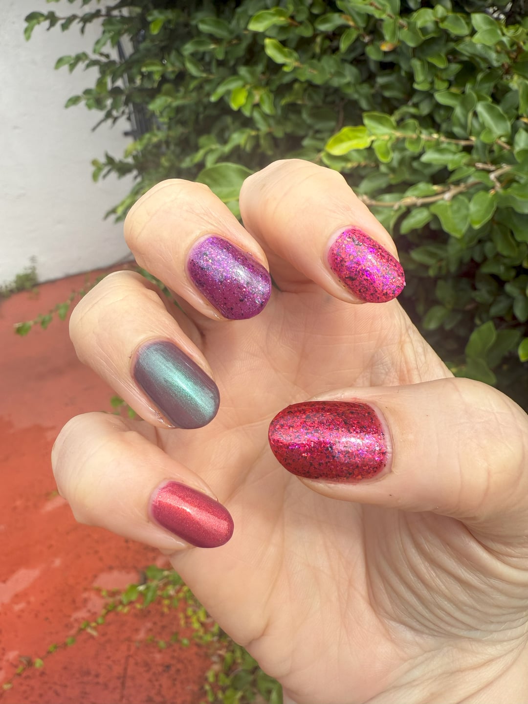 About once a month, I go through that drawer. Some polishes didn’t sell in my last destash post, so they’ll hang around for a while. I pull shades out that I'd like another look at and do a few skittle manis, and spend a weekend testing them out. I use a peely base coat for this — shout out to my GOAT peely from Cosmic Polish. 🙌