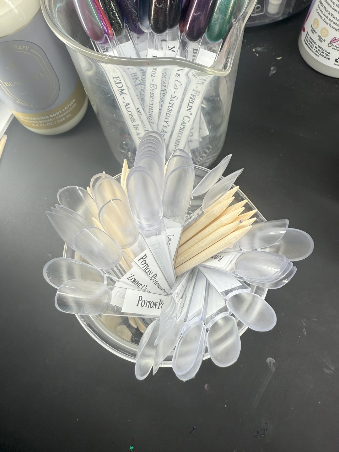 When I order polish, I make a swatch stick label for each bottle and toss it into a little cup on my desk. That cup helps me see how many polishes I’ve ordered that haven’t arrived yet.