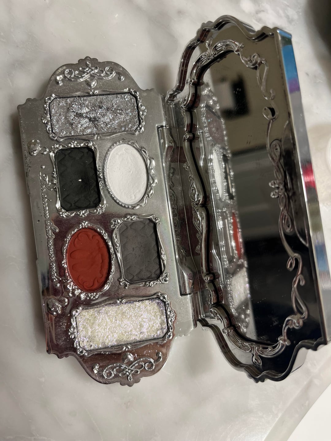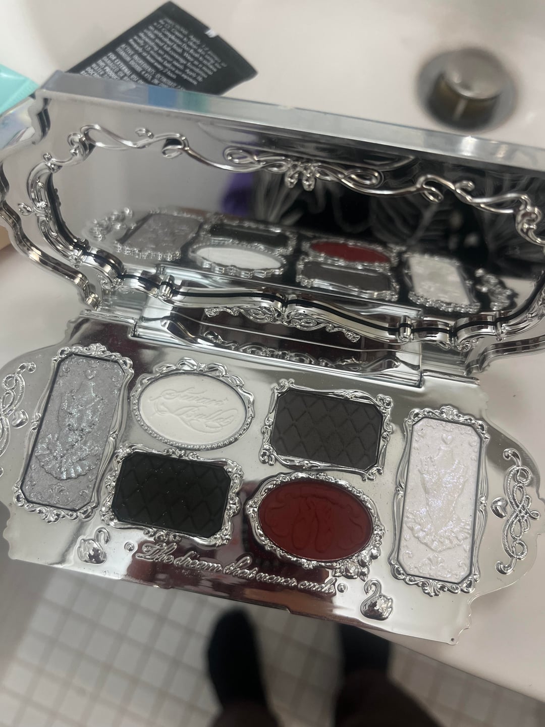 (Flower Knows Swan Ballet Palette in Black Swan) Bought myself this palette to branch out from mostly just wearing eyeliner a year and half ago and finally hit pan the last couple times I used it! Love the color story and very easy to work with. Second photo is what it looked with the embossing not destroyed 🙂