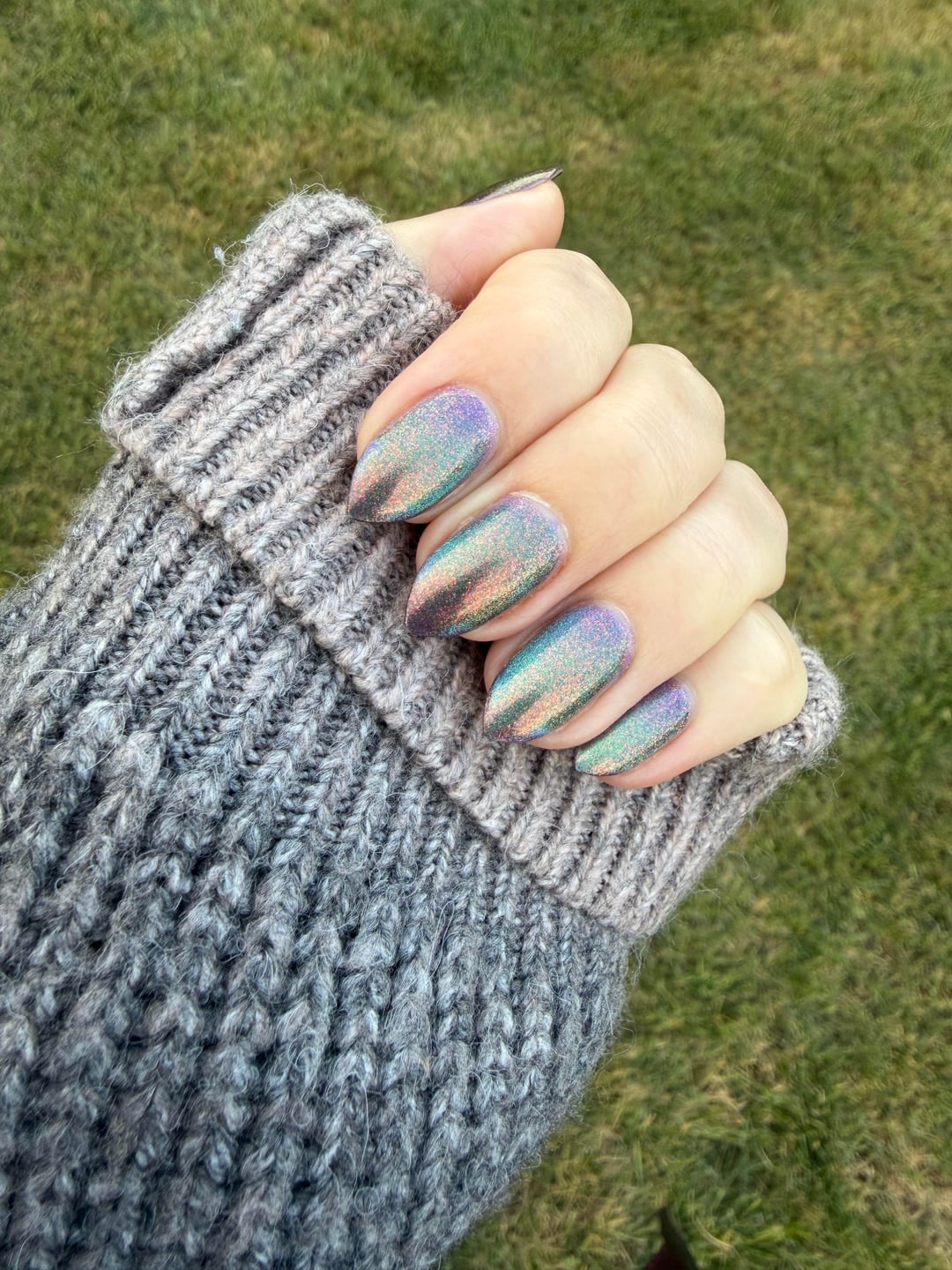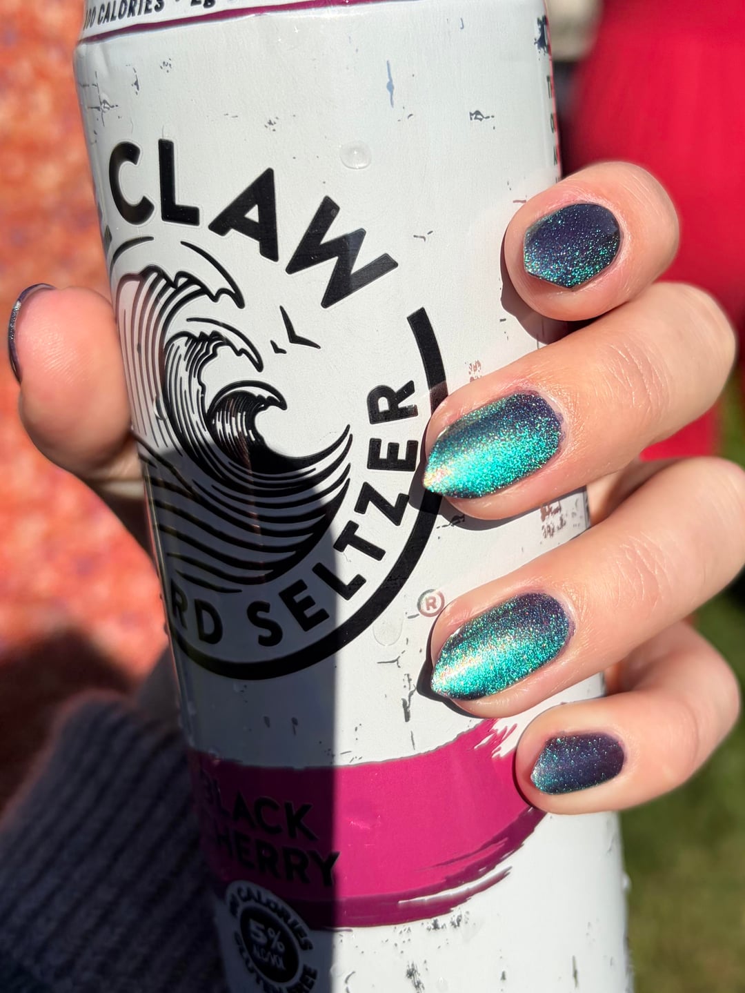 1 coat essie strong start, 1 coat hypnosis unmagnetized, 1 coat hypnosis magnetized with 30 lb horseshoe magnet for like 30-45 seconds, 1 coat Essie gel setter magnetized for 90 sec. Pics are about 48 hours into the mani. I’m gonna put a video of a fun color shift in the comments!