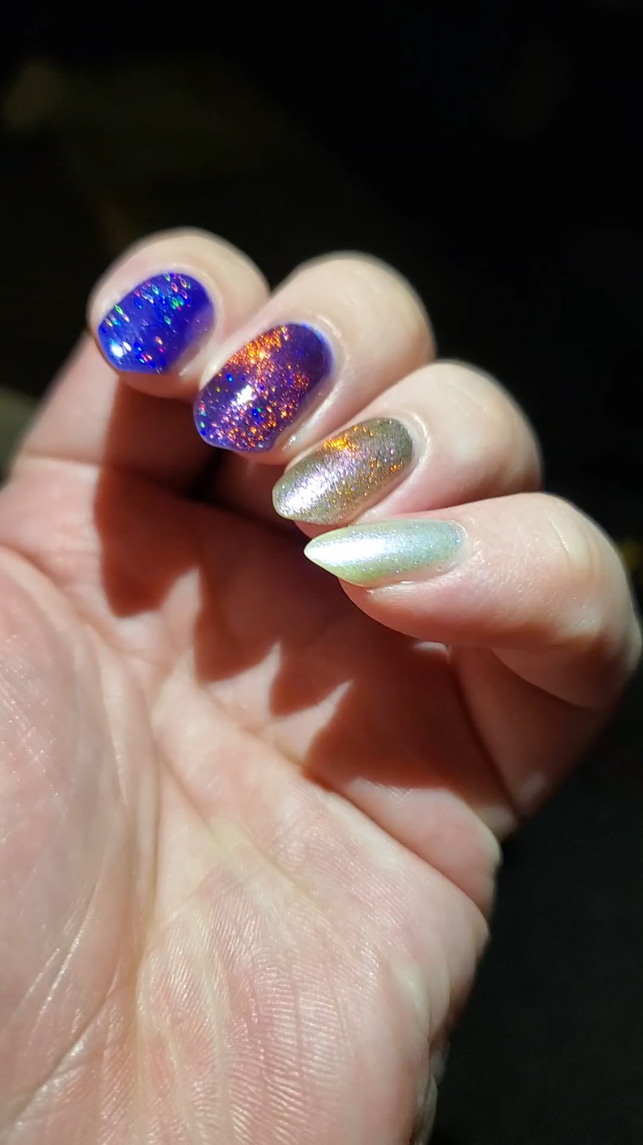 All fingers have Cracked Ridge Filler base coat and KBShimmer Clearly on Top top coat. Pointer and middle finger have Hex Mix x3 coats. Ring and picky have Skelly Bones x3 coats. Middle and ring have added Scorchy x2 coats magnetized with a bar on top of a horseshoe magnet.