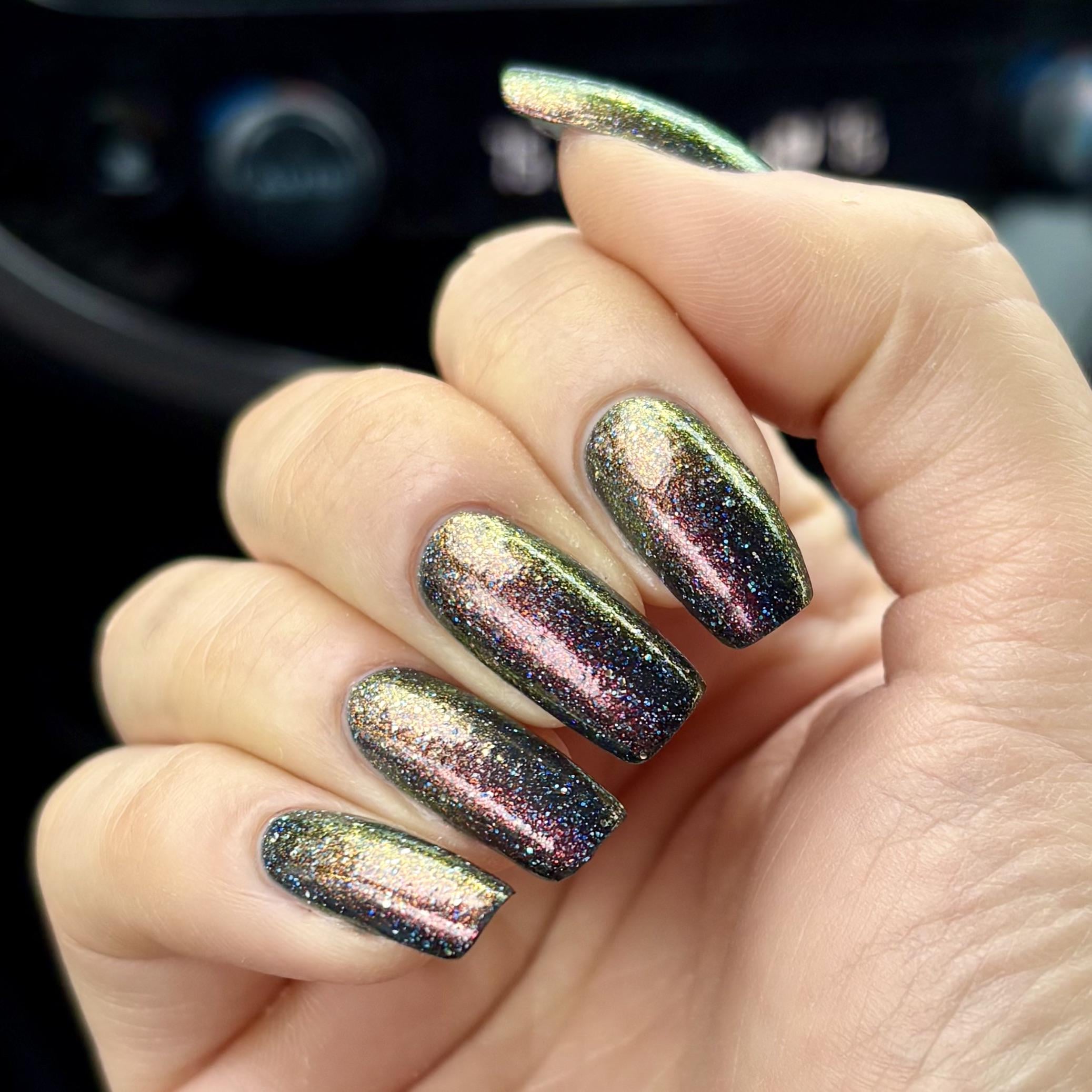 I bought this one during Holo Taco's mystery polish sale and wow, it is seriously the most beautiful dark, sparkly polish! it's really putting me in the Halloween spirit 🎃🖤
