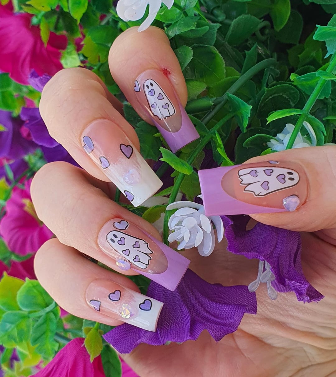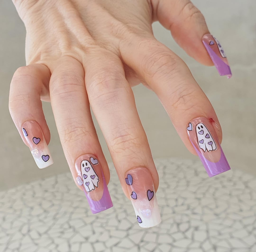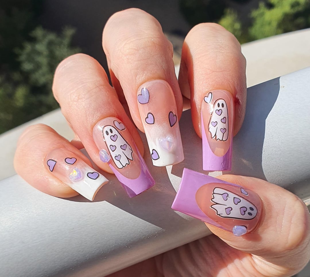 For this set, I used : – french nail tips : white and lilac – ghost ls and lilac hearts stickers – shimmery 3d heart charms Glossy top coat by Key_Opportunity_7082