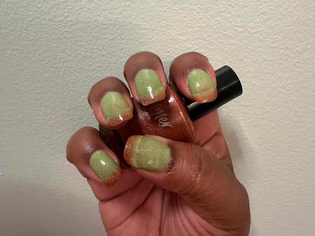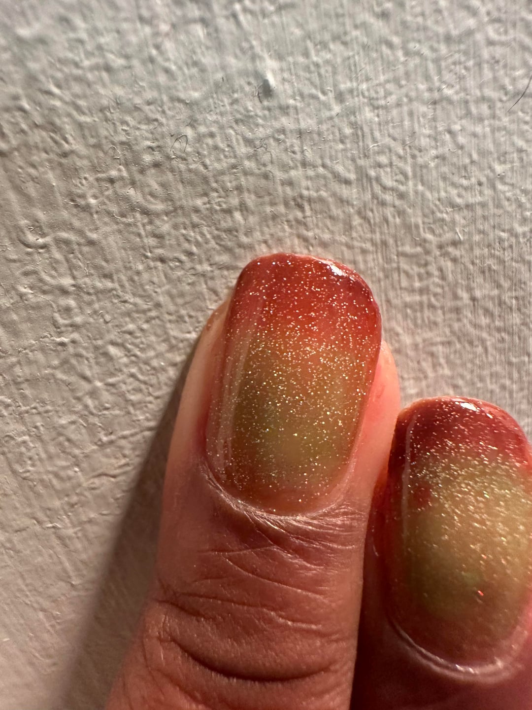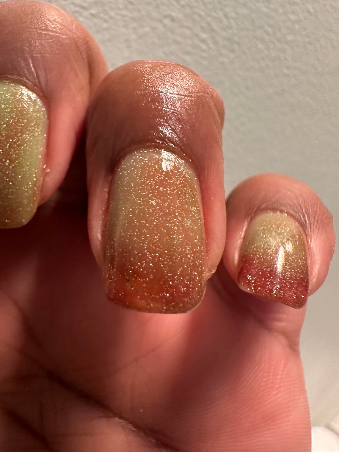 augustrem on October 13, 2025 6:53 pm Full product listing: Duri Rejuvecote Base Coat (one coat) KB Shimmer Apple-y Ever After (one coat) Orly’s Sec and Dry (one coat)