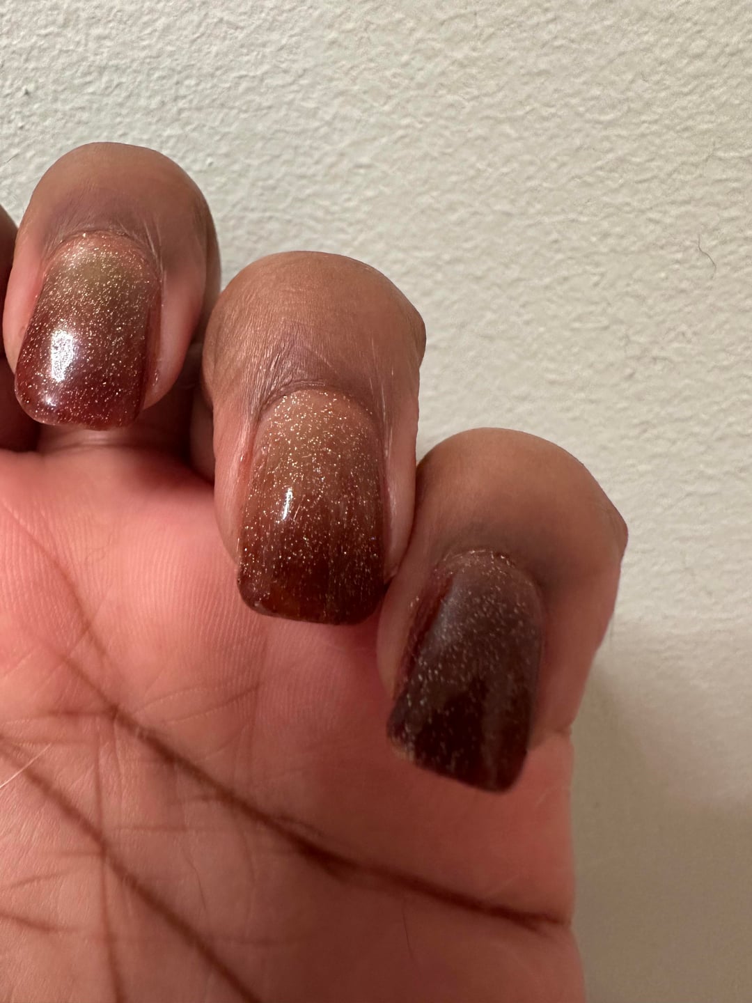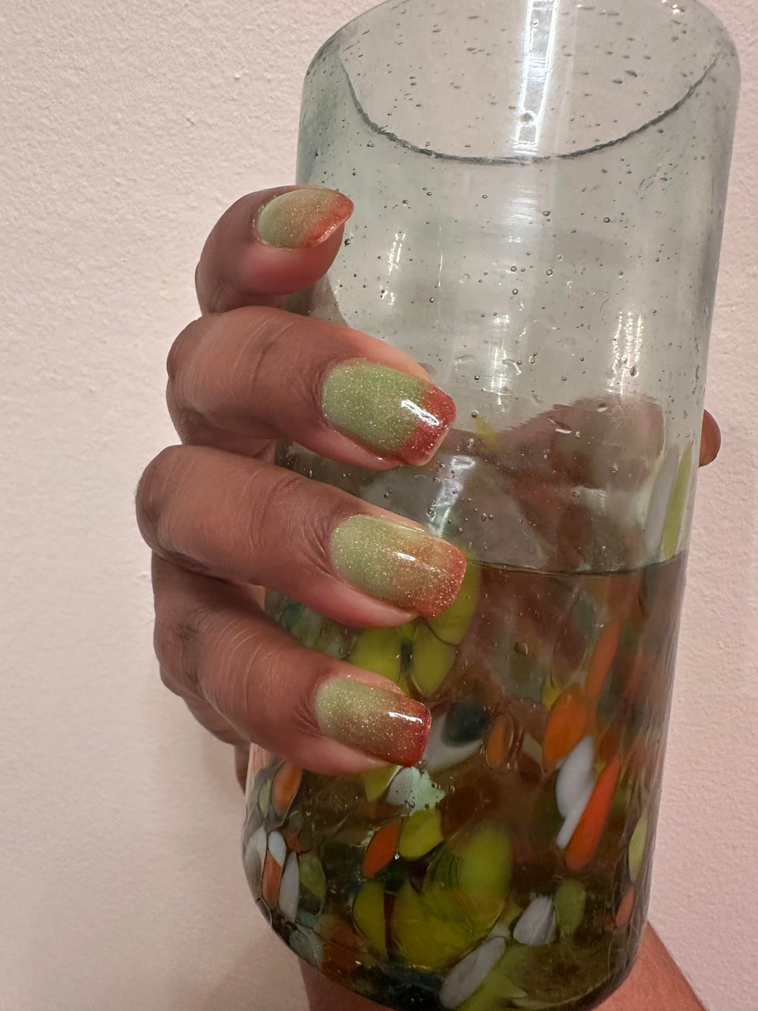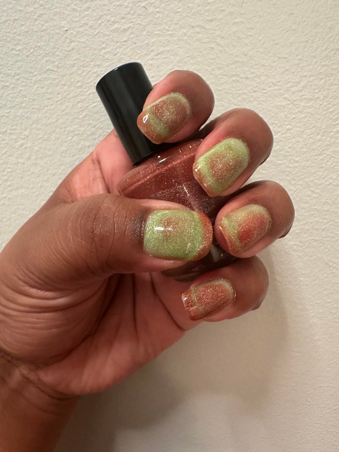 augustrem on October 13, 2025 6:53 pm Full product listing: Duri Rejuvecote Base Coat (one coat) KB Shimmer Apple-y Ever After (one coat) Orly’s Sec and Dry (one coat)