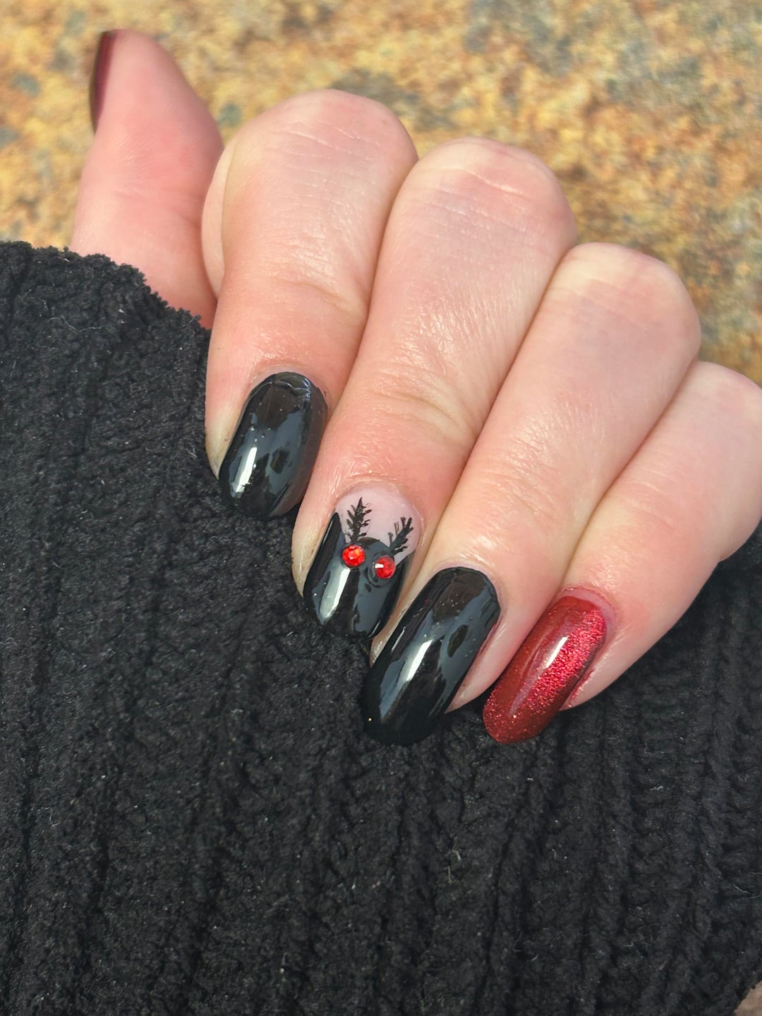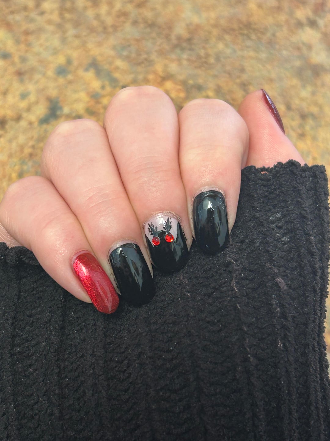 Halloween mani using Mooncat’s: Hardcore Basecoat Emo for Life Your Heart’s a Black Hole Speed Demon top coat And L.A Colors Nude Peach Glued on the red gems using beauty secrets nail glue! by cranjuiceofficial