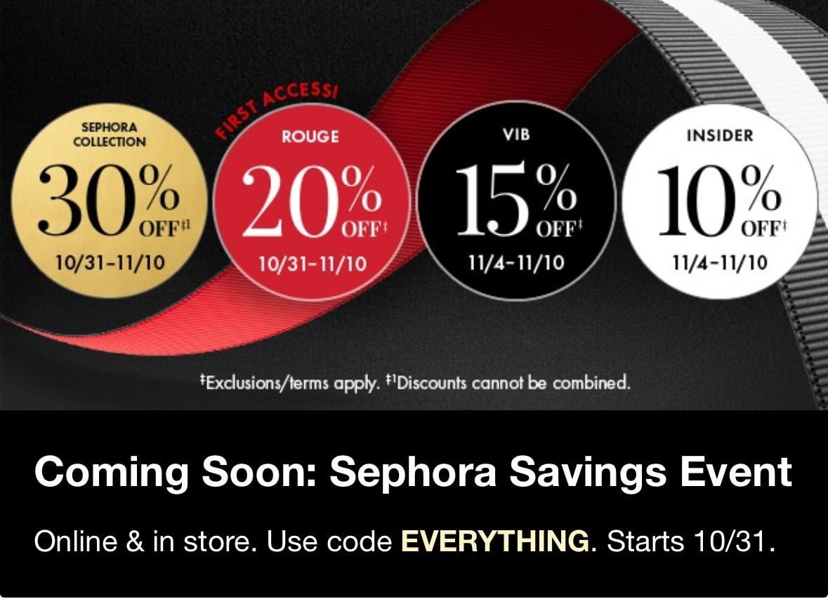 spyrenx on October 14, 2025 1:00 pm https://www.sephora.com/beauty/savings-event 30% off Sephora Collection starts 10/31 20% off sitewide for Rouge tier starts 10/31 15% off sitewide for VIB tier starts 11/4 10% off sitewide for BI tier starts 11/4 Using code EVERYTHING.