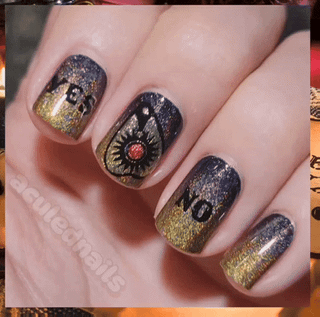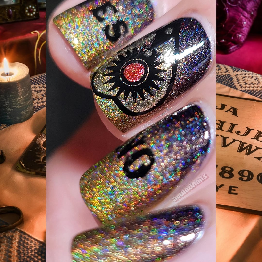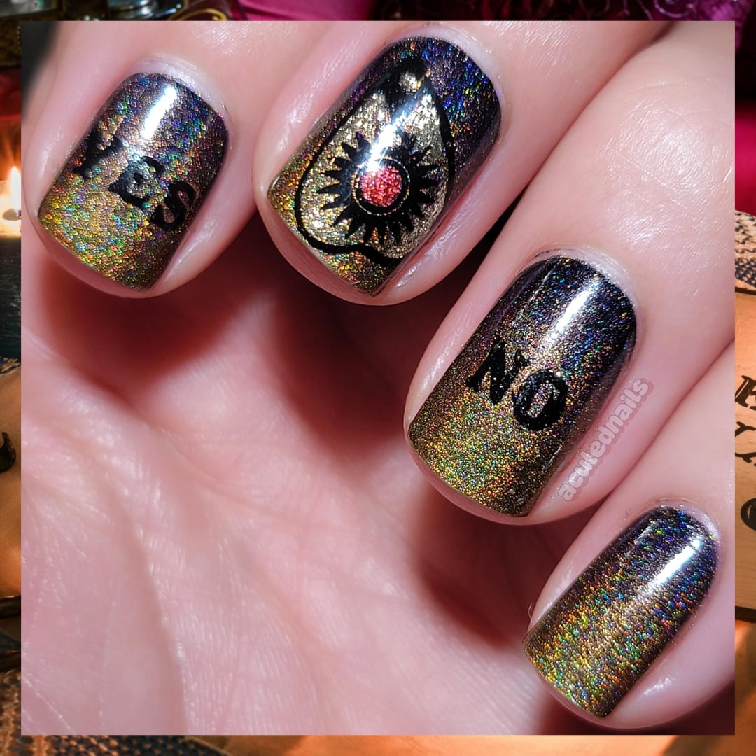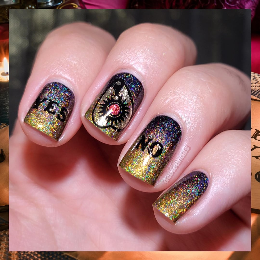 1. I was doing a quick mani before running to work, and I had been eyeing my dark linears ever since using the OG bright ones for the Coming Out mani. I LOVE Amber Apathy and old haunted and bronze it looks so I tried a gradient of it, Burnt Bridges into black. It gave me dark and spooky but with a different vibe than a standard orange/black/purple/green did. I was drawn to spooky old seance Ouija board aesthetics and thankfully I had some stamps that would help sell the vibe and BOOM, we’ve got some dark and dirty (yet sparkly) Ouija vibes. Not bad for 45 minutes 😝💀