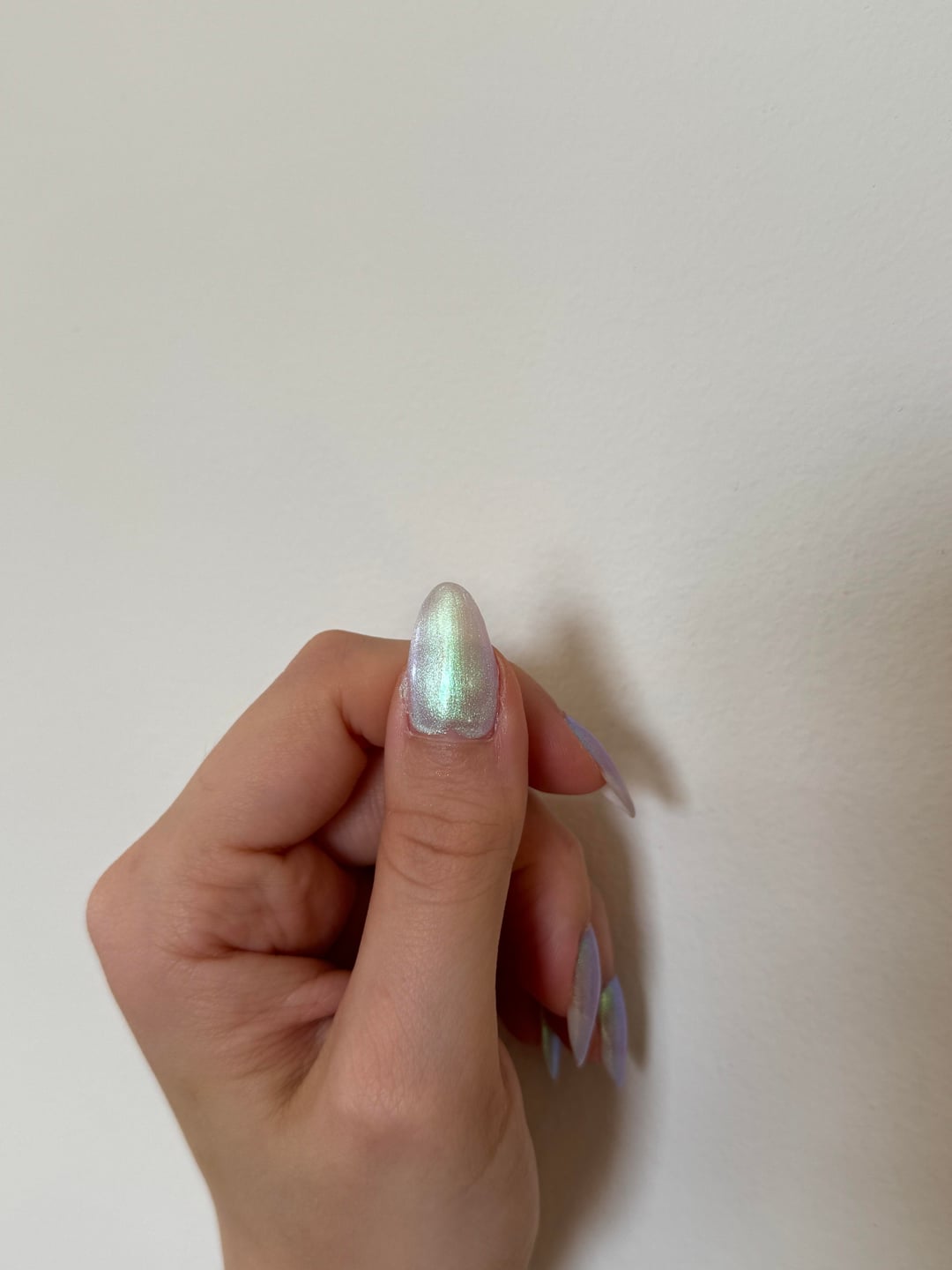 I’m wearing both side by side in 2 coats (no top coat) with Pixie Stick on the left half of my nail and Best of Cluck on the right. My camera wasn’t catching the green shimmer so I also included a photo from my phone’s camera.