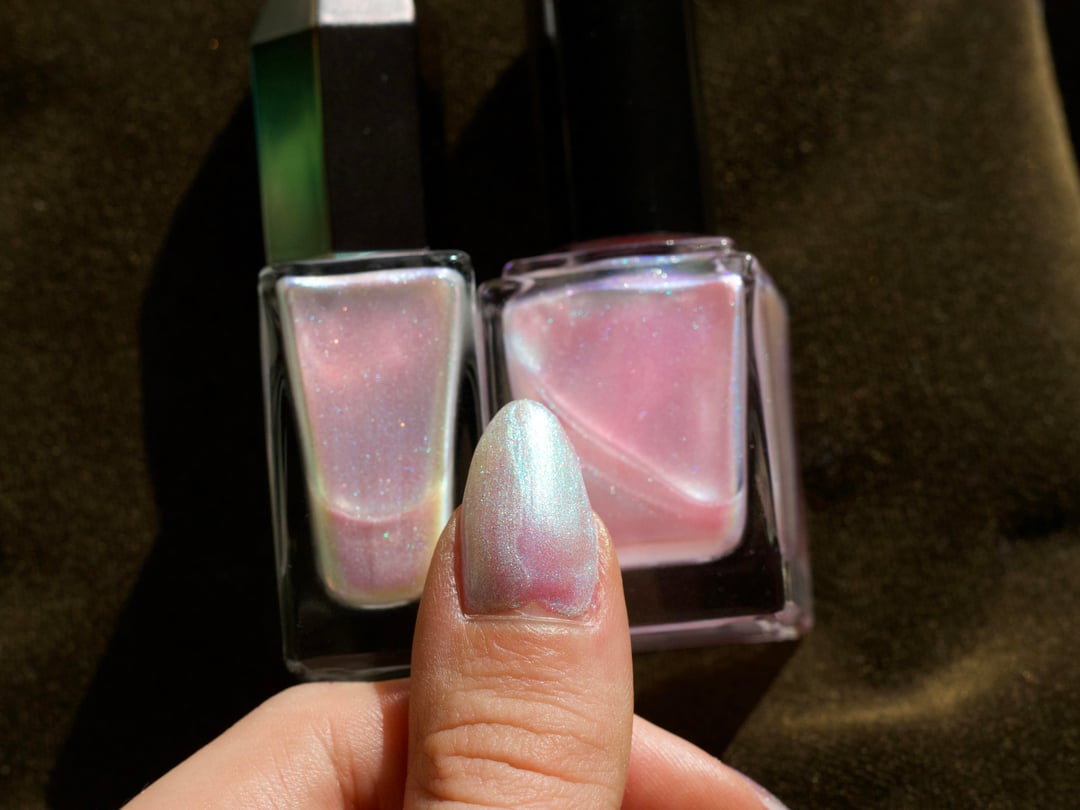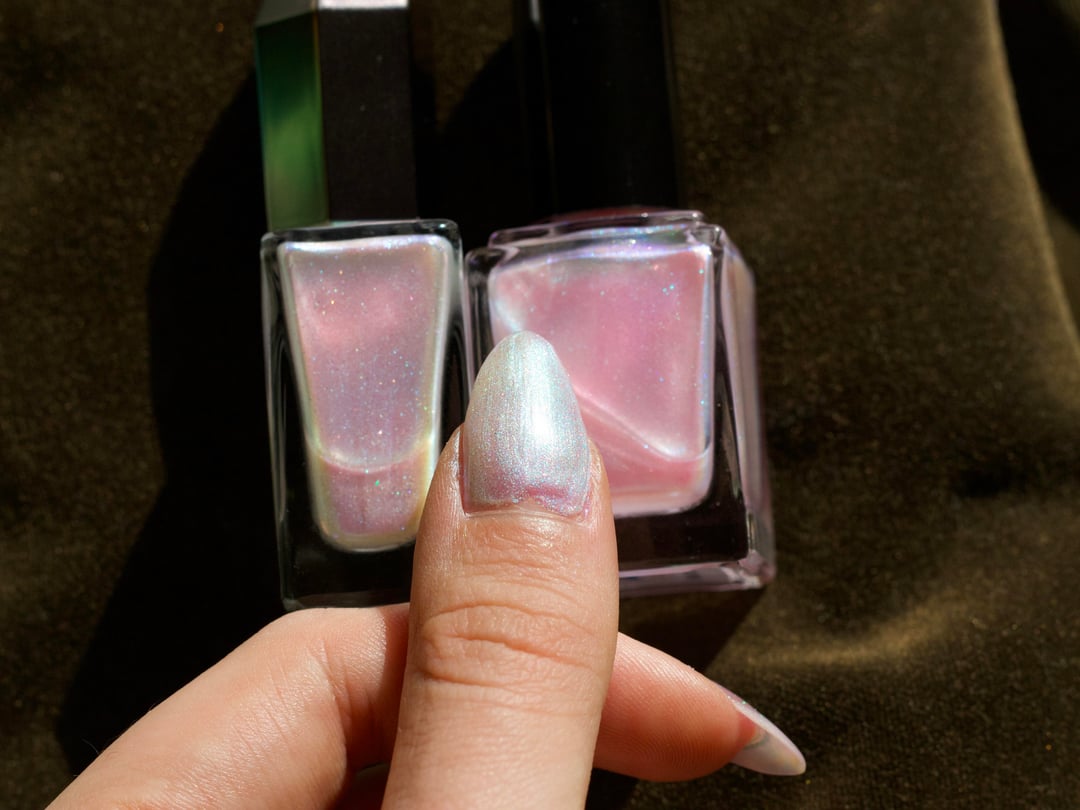 I only really notice the pink-er base at specific angles, otherwise I’d say the main differences are Pixie Stick has slightly larger holo glitters and Best of Cluck looks a little more pearly so you can see brush strokes a little more. (Will add a video comparison link in the comments)